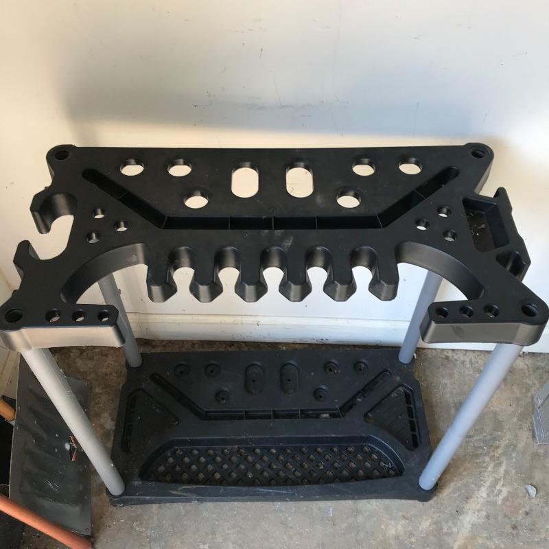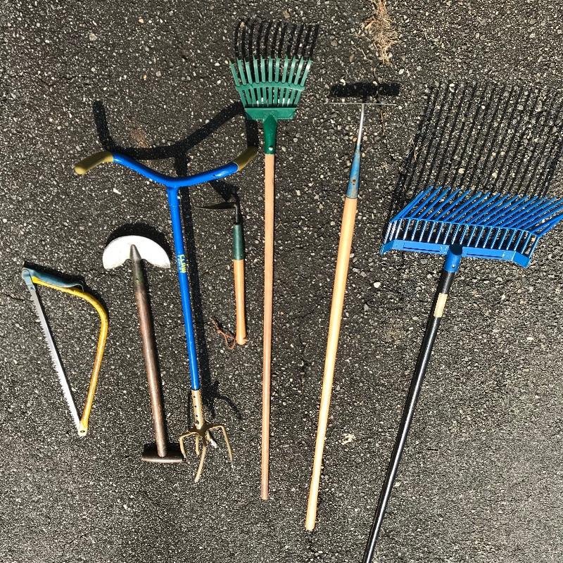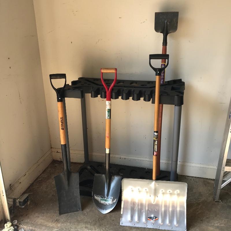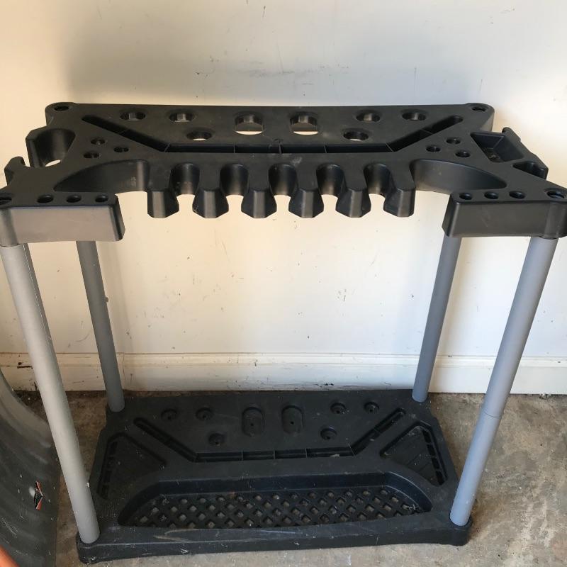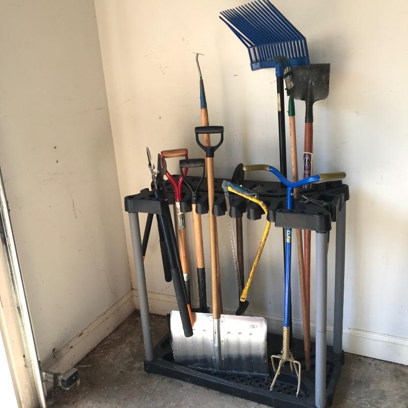 Some very handy yard tools and a place to store them with this black and gray heavy duty plastic tool stand measuring approximately 35.5” x 17.5” x 35”. A range of tools can be found in this collection including garden and snow shovels, two rakes, a hand saw and more. See photos. No shipping.
