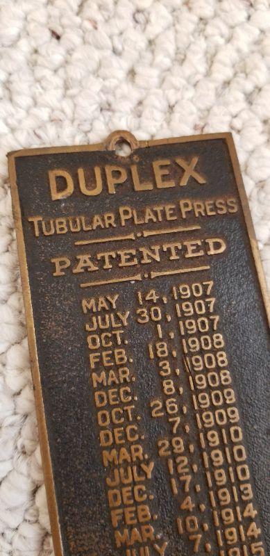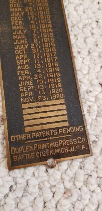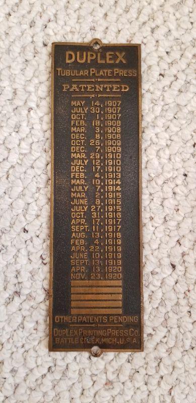 Lot 2-505: Antique Duplex Printing Press TUBULAR PLATE PRESS Patent Plate