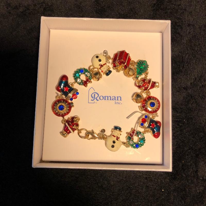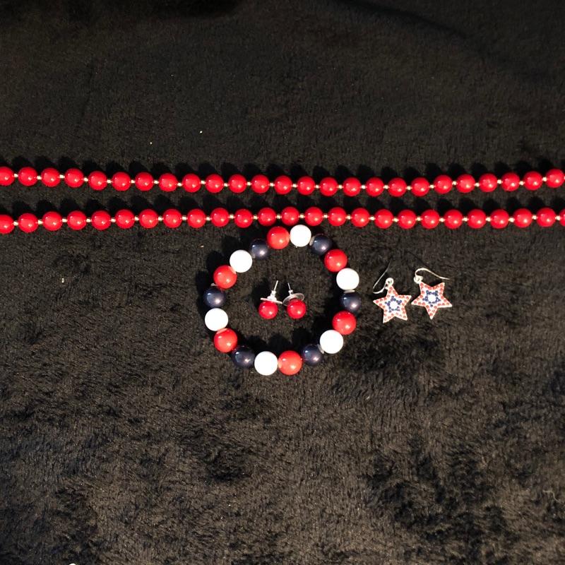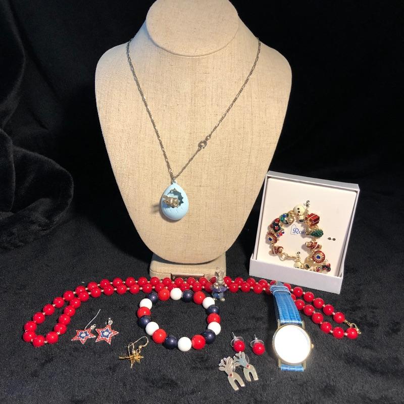 Eclectic mix of holiday and patriotic pieces here that includes a pair of 925 Reindeer post earrings, holiday watch with genuine leather strap, a holiday bracelet, beaded necklace and bracelet, more earrings, a rabbit pendant and an unusual rabbit in a shell necklace.