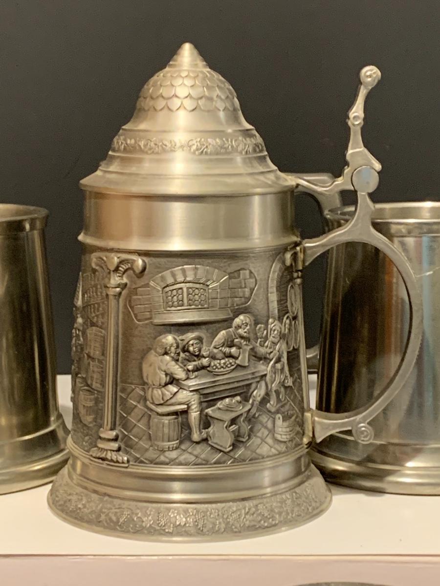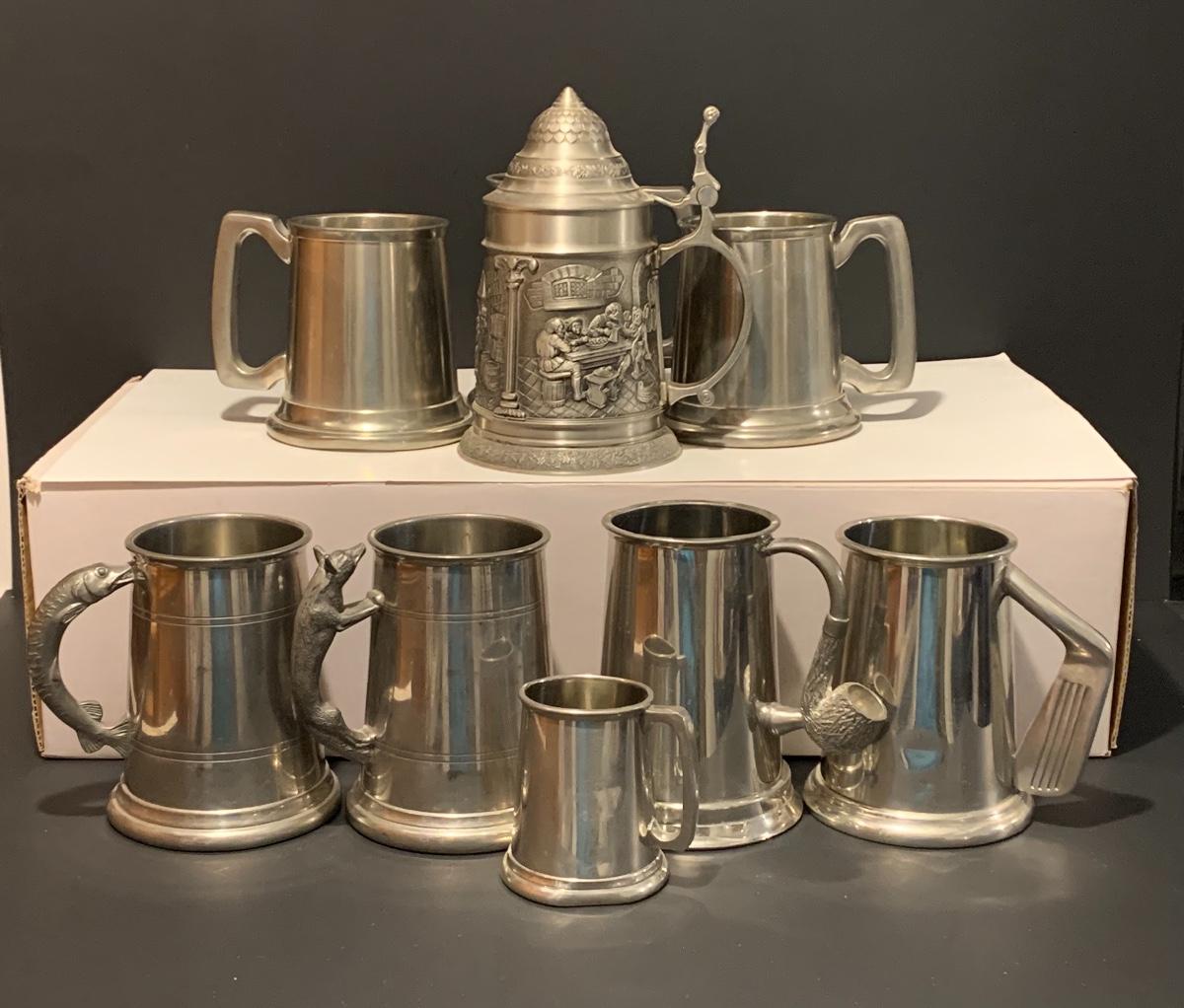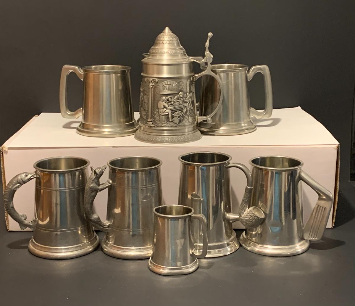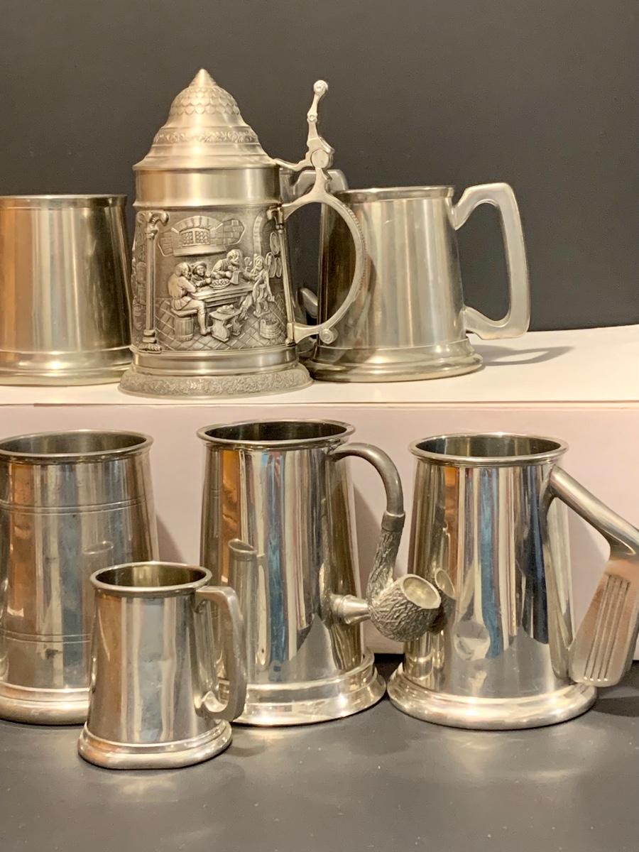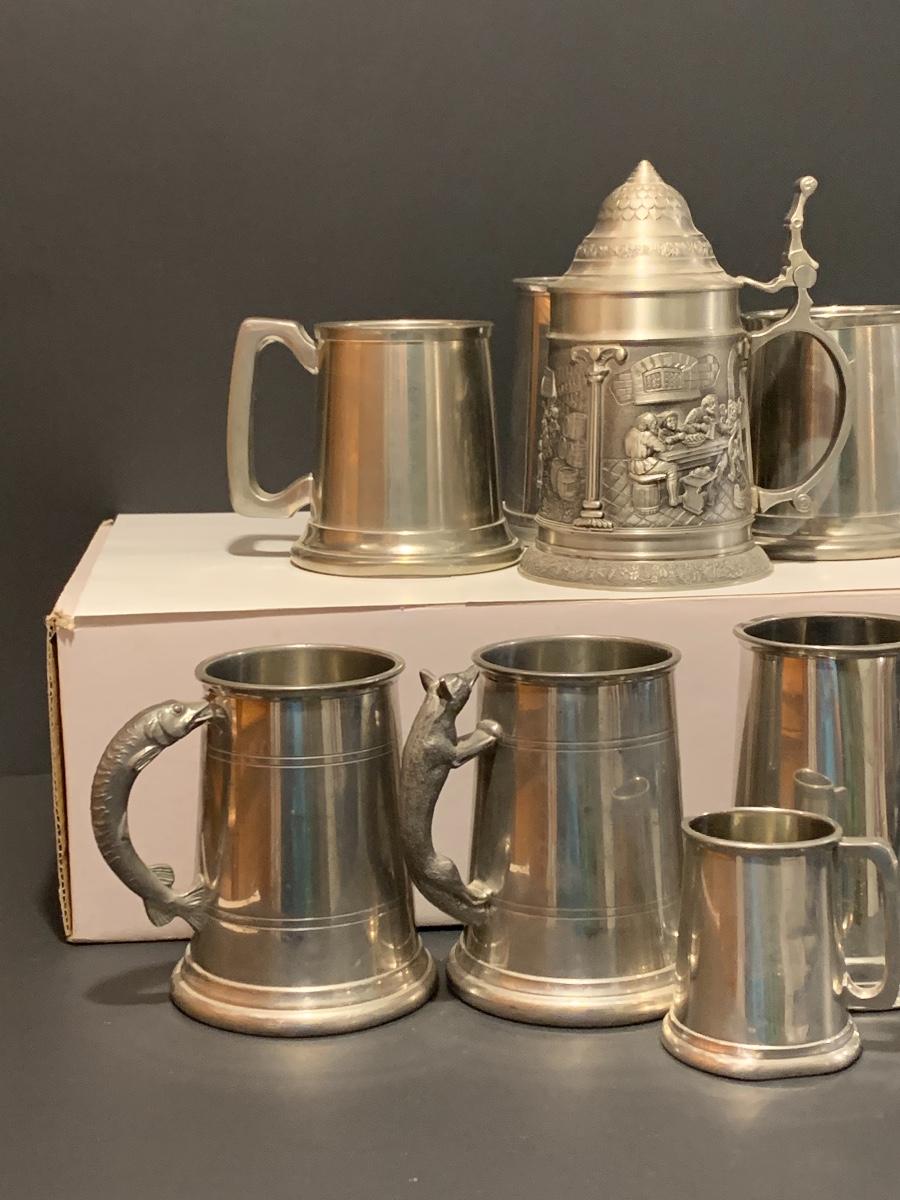 Collection of pewter mugs with various handles and Stein with lid (94% Zinn Pewter). These are very unique, but due to storage and use, some have minor flaws such as small dents.