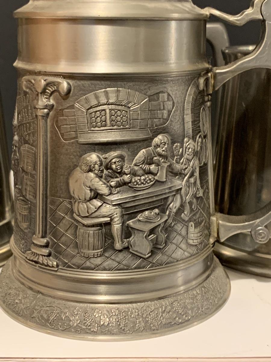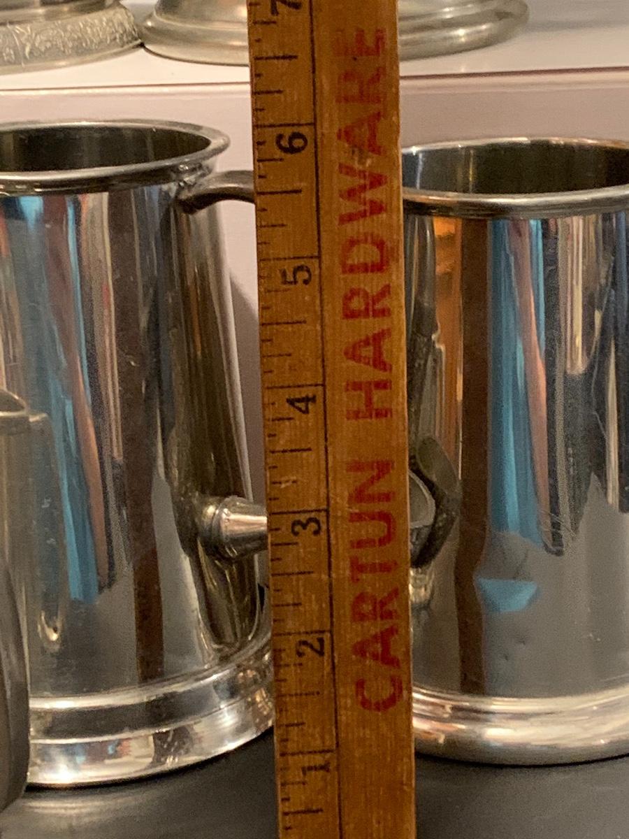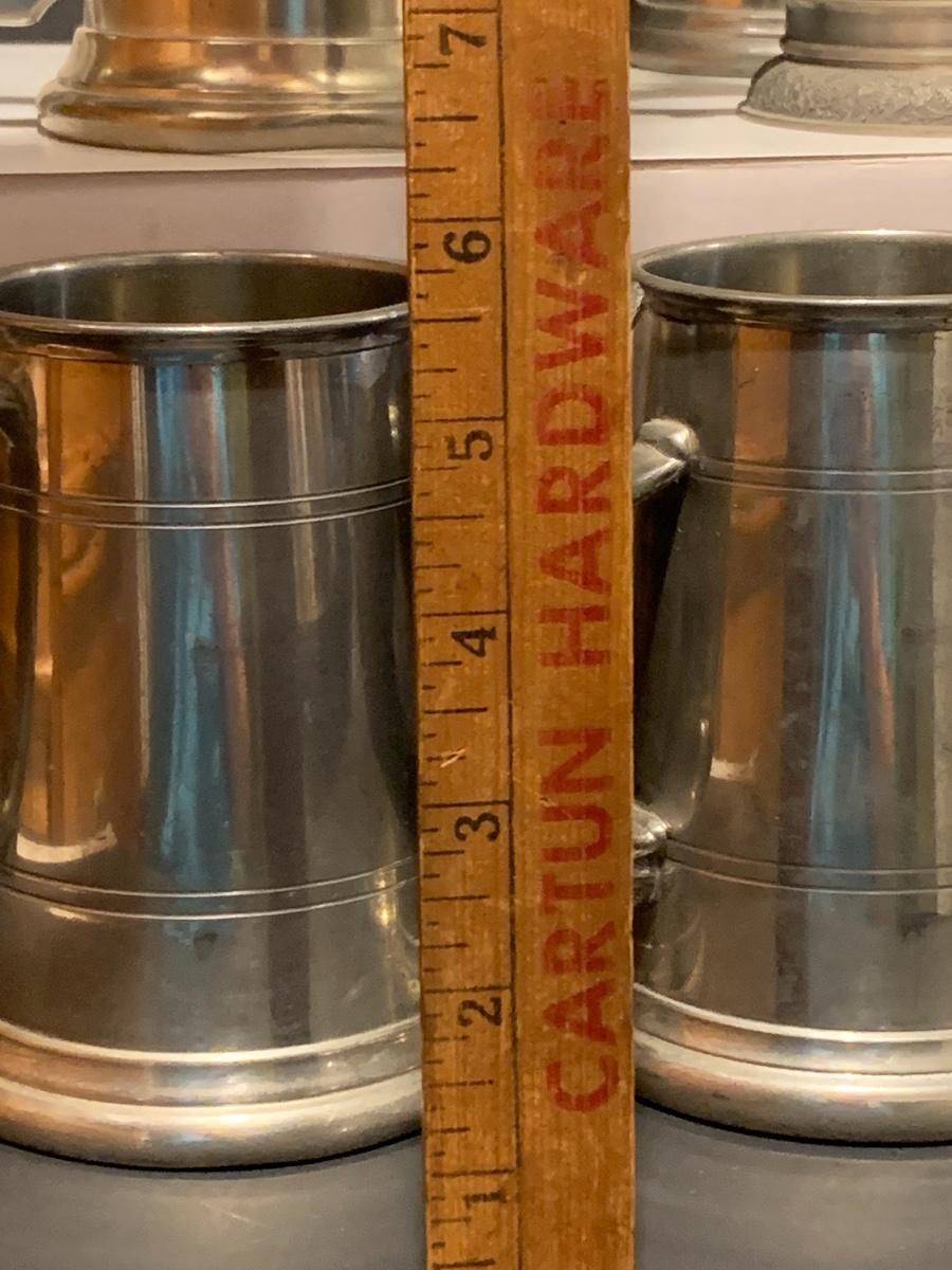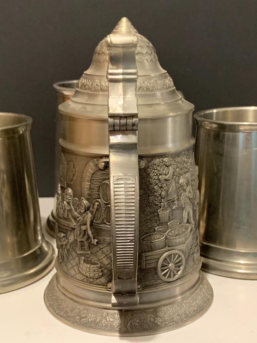 Collection of pewter mugs with various handles and Stein with lid (94% Zinn Pewter). These are very unique, but due to storage and use, some have minor flaws such as small dents.