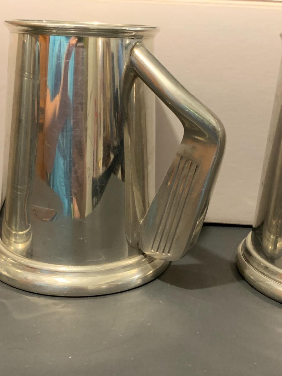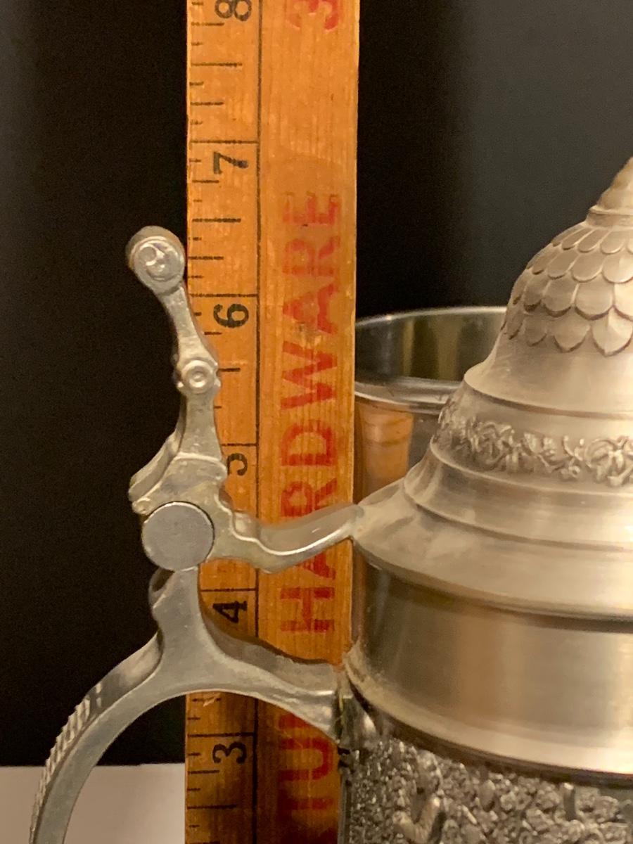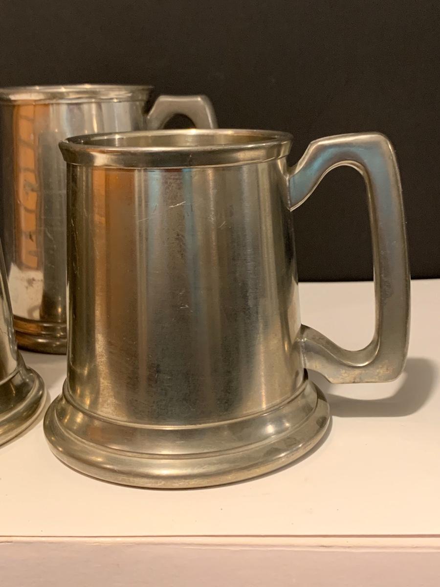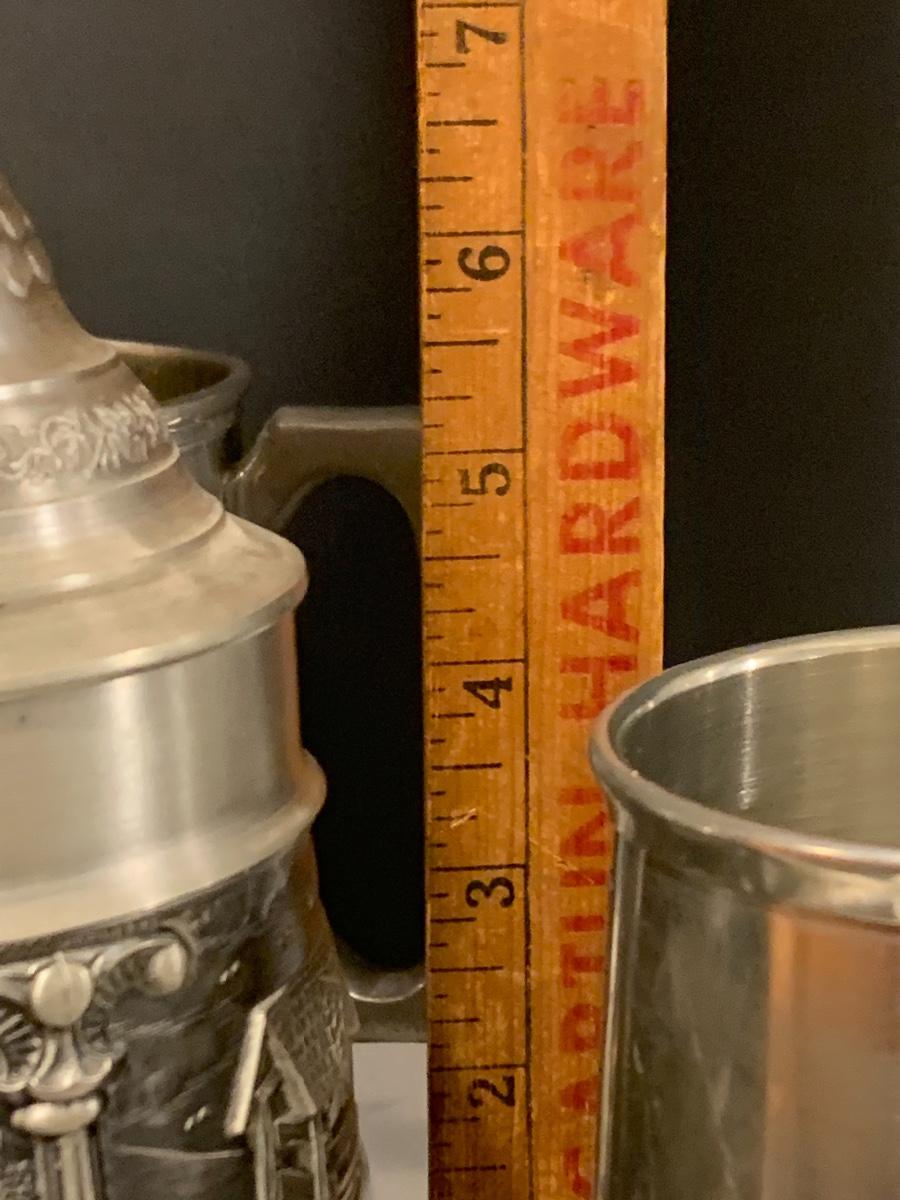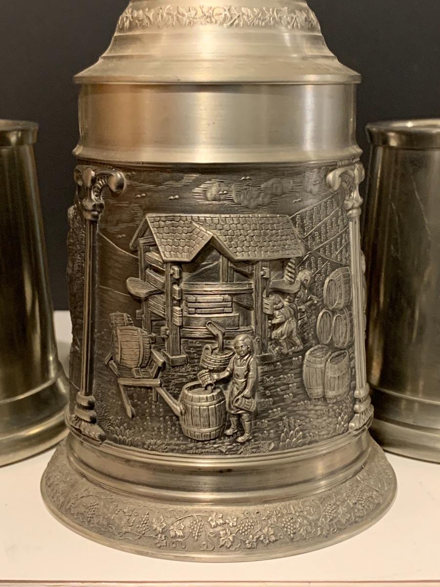 Collection of pewter mugs with various handles and Stein with lid (94% Zinn Pewter). These are very unique, but due to storage and use, some have minor flaws such as small dents.