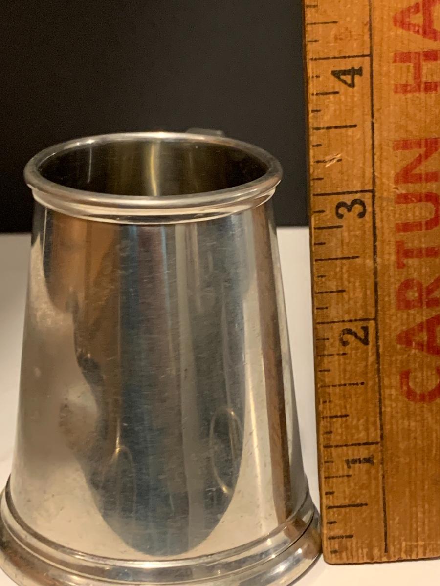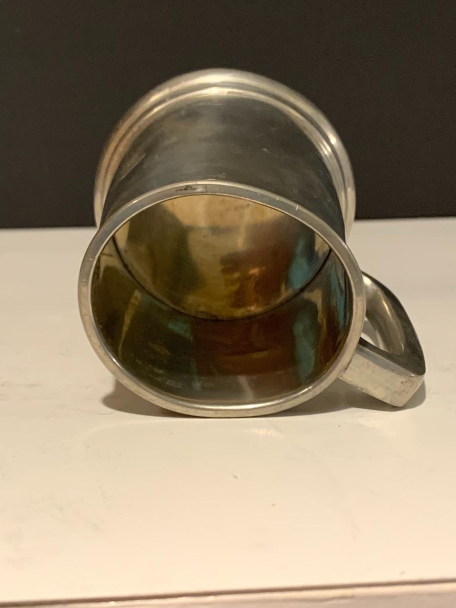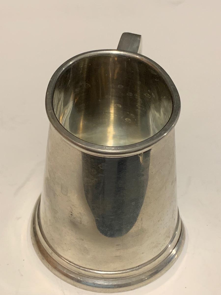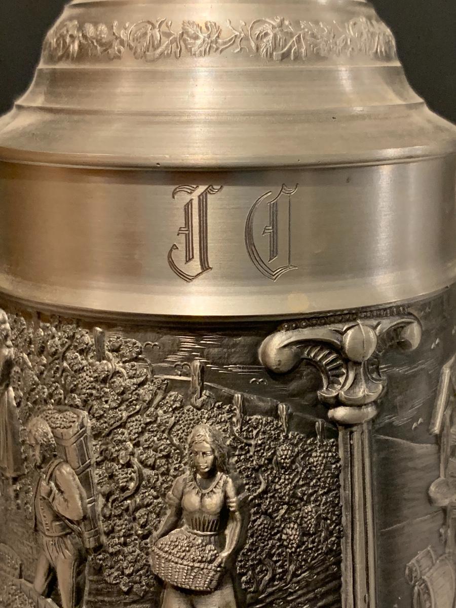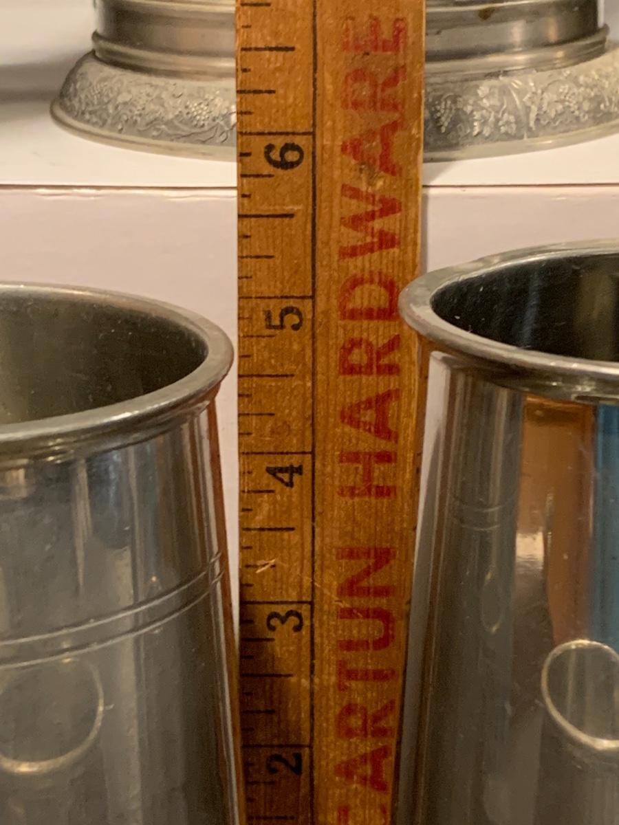 Collection of pewter mugs with various handles and Stein with lid (94% Zinn Pewter). These are very unique, but due to storage and use, some have minor flaws such as small dents.