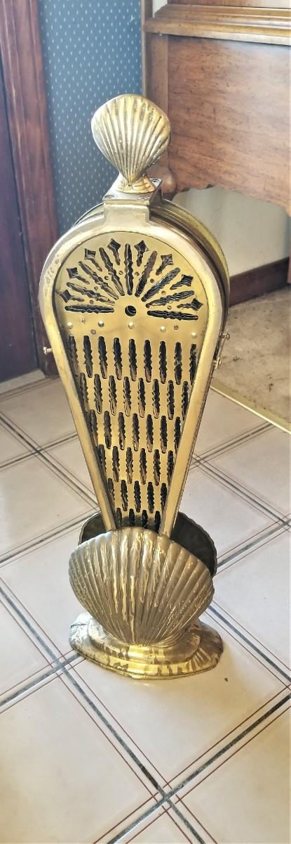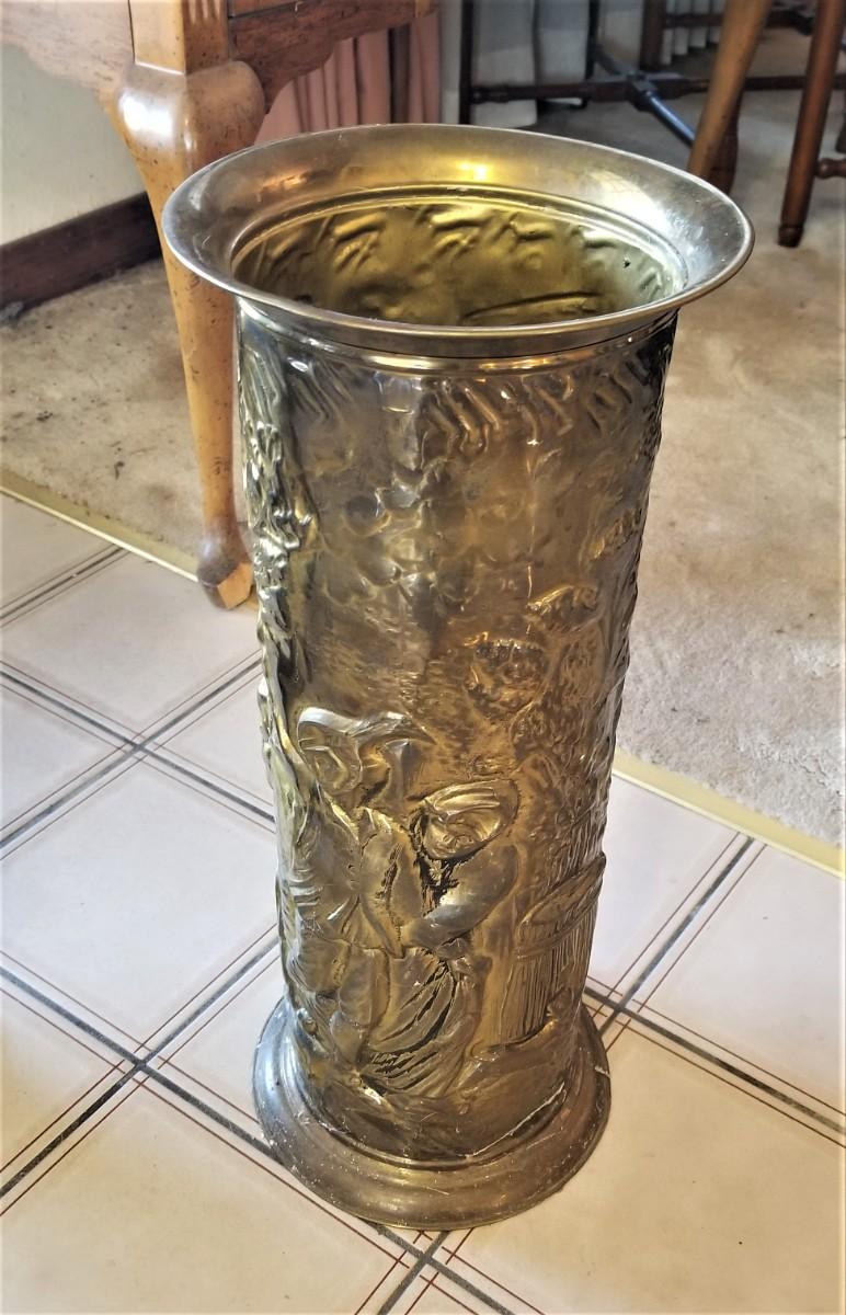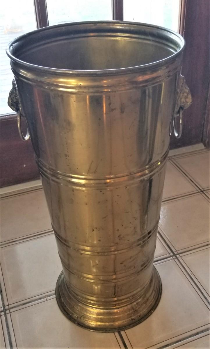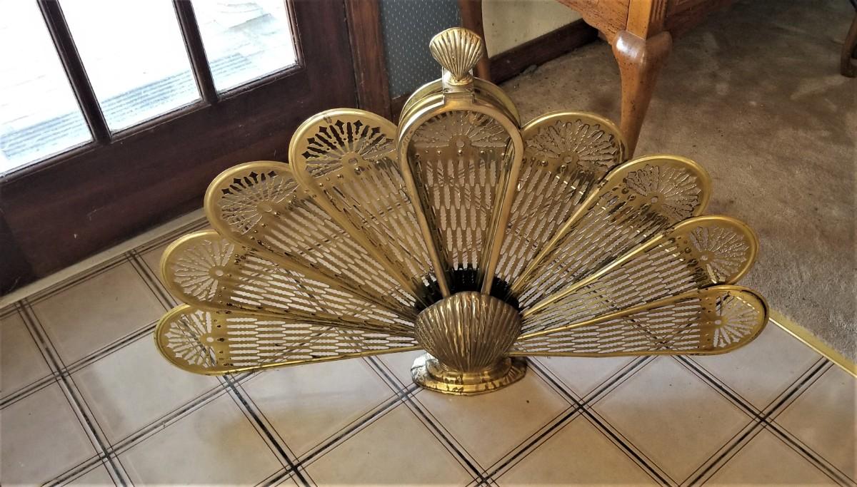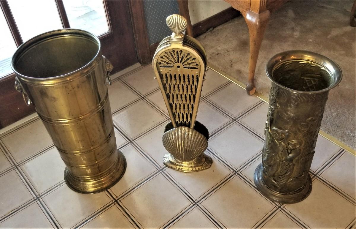 You get all you see here - two brass umbrella/cane holders (the one with lion trim is 21" tall - the embossed one is 19.5" tall), and a folding/accordion fireplace screen. Screen is 25" tall and 38" across fully extended. Works fine - good condition. These screens routinely sell in antique malls for $100.00 or so.
