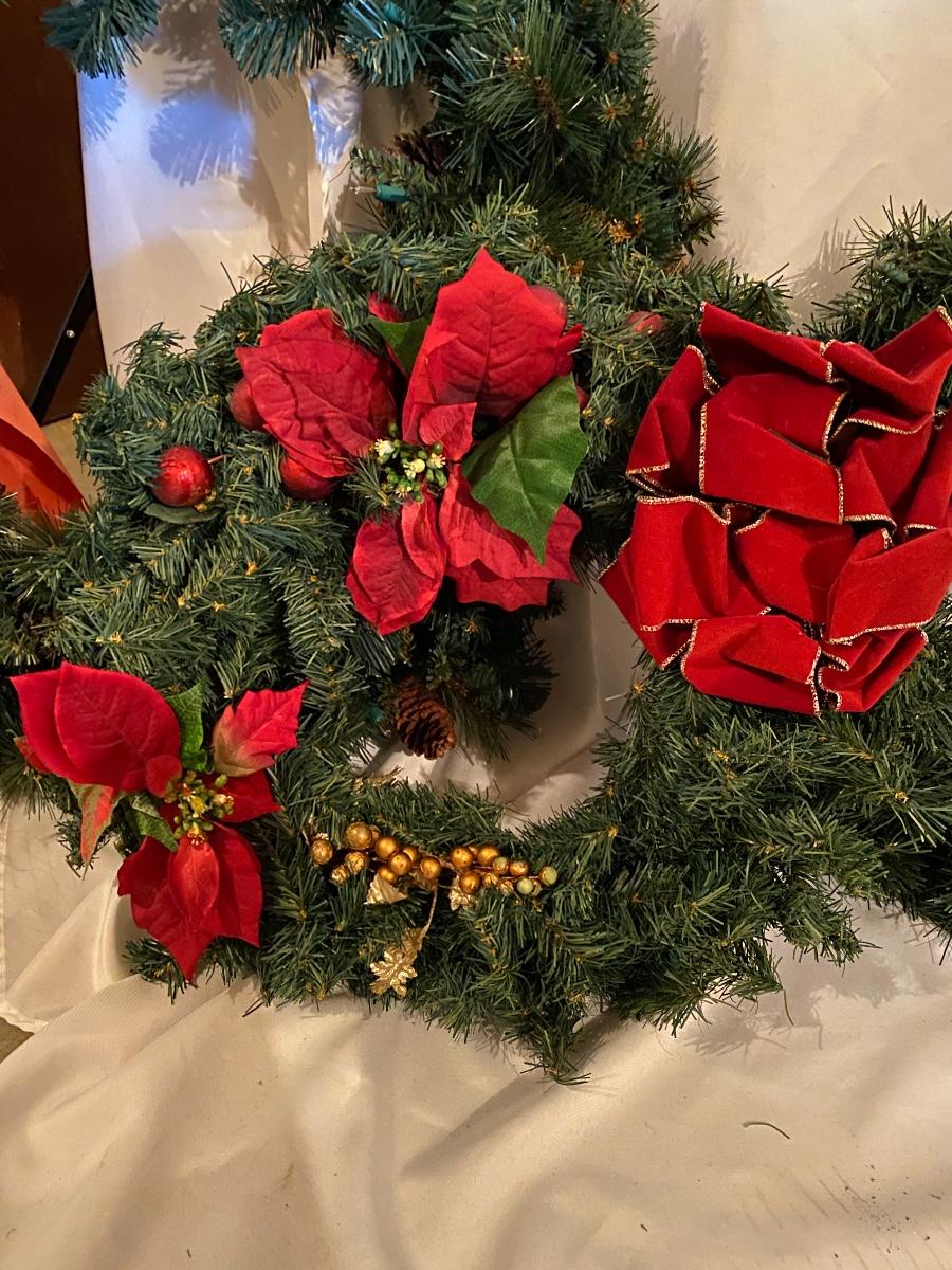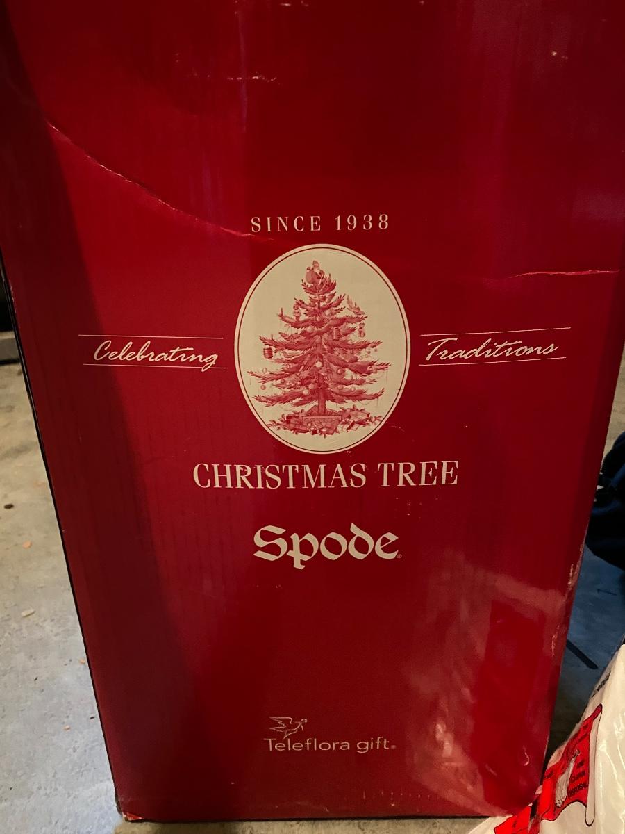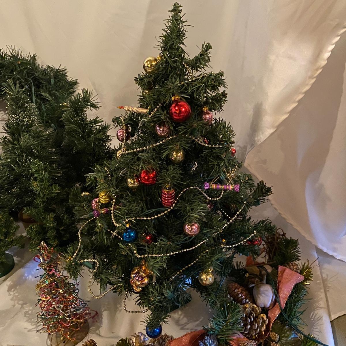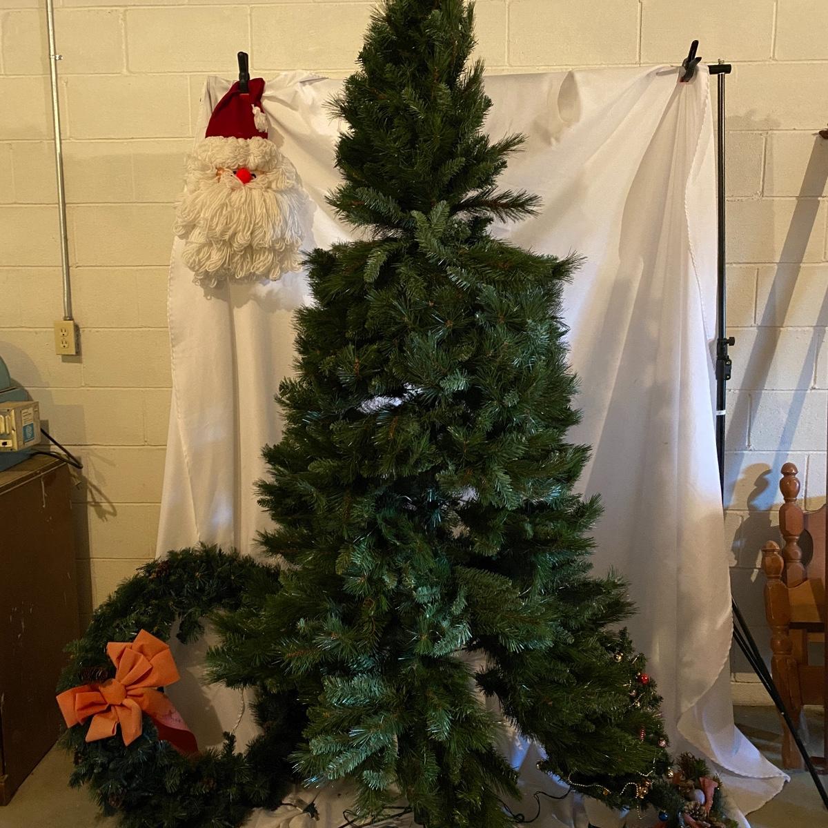 A massive 8ft faux tree with its own storage bag is a highlight in the lot. Also includes a lighted 24” Spode Tree with box, six small faux trees, two wires trees, three green faux wreaths (plain one is lighted and largest one is 28”d and lighted but doesn’t turn on and has its own storage bag), a small bell wreathed , a hanging cloth Santa and a nicely decorated garland. Largest wreath and large tree come with storage. Spode Tree has original box. No shipping.