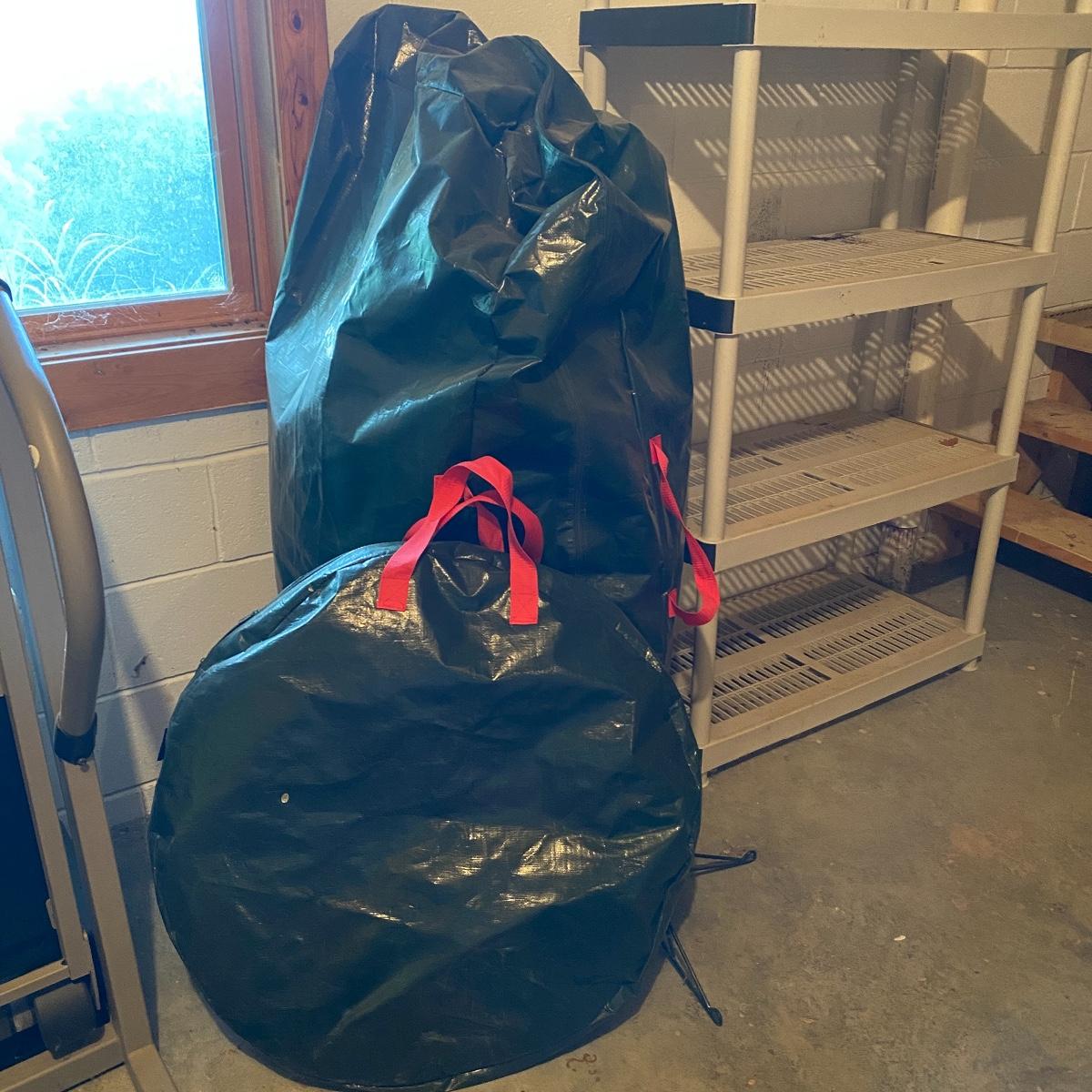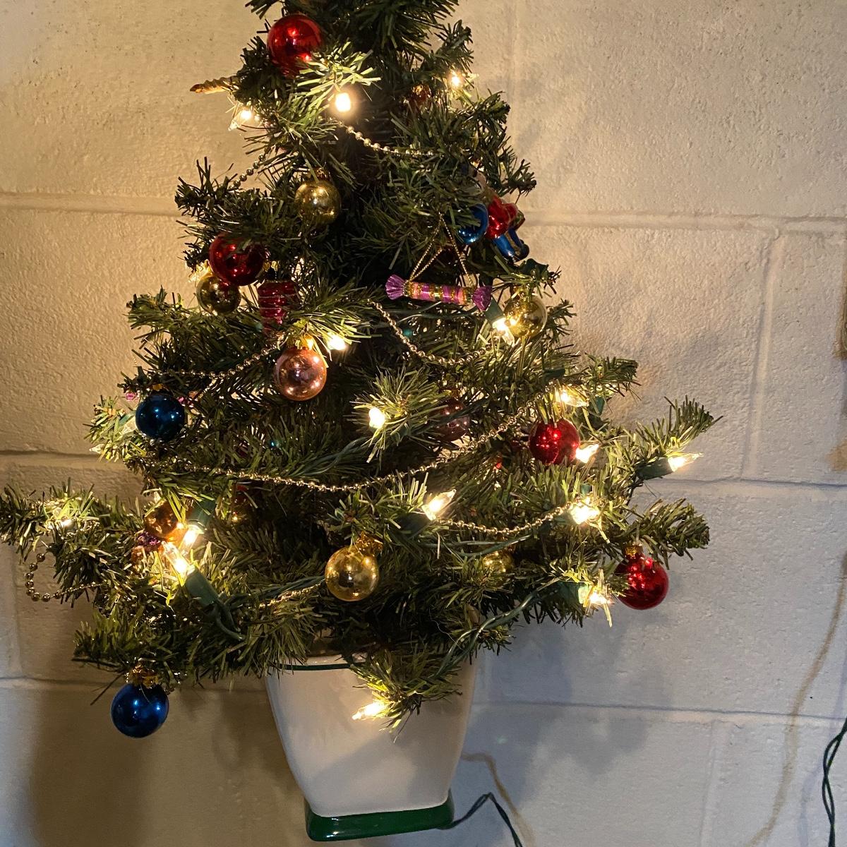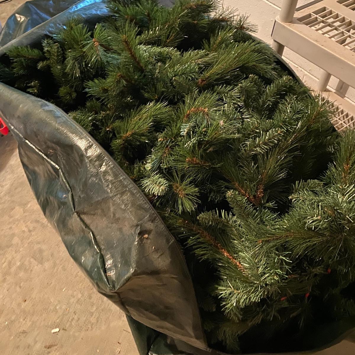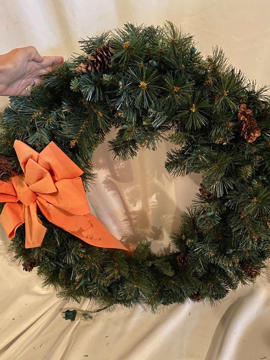 A massive 8ft faux tree with its own storage bag is a highlight in the lot. Also includes a lighted 24” Spode Tree with box, six small faux trees, two wires trees, three green faux wreaths (plain one is lighted and largest one is 28”d and lighted but doesn’t turn on and has its own storage bag), a small bell wreathed , a hanging cloth Santa and a nicely decorated garland. Largest wreath and large tree come with storage. Spode Tree has original box. No shipping.