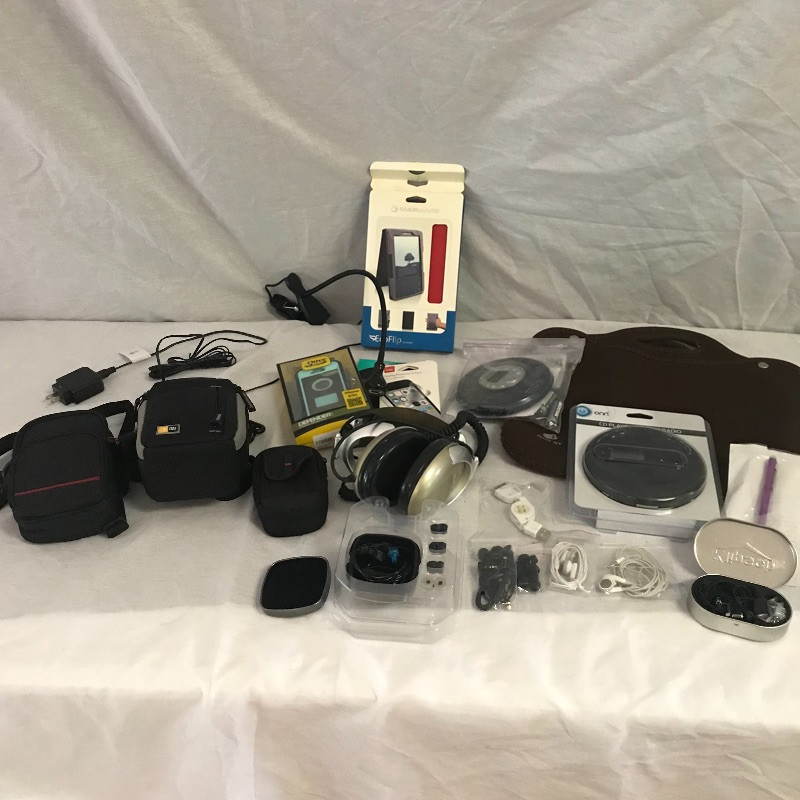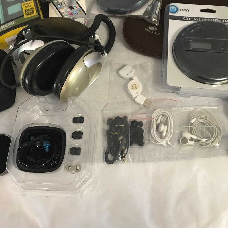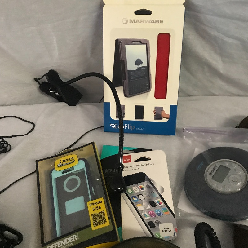 This lot has some various items to perhaps complete your collection. Lots of earbuds, Koss Headphones, kindle cover, tablet case, two CD players, stylus, otter box for iPhone 5/5S, camera cases, reading lamp that clips on a book and more. Local pick up only.