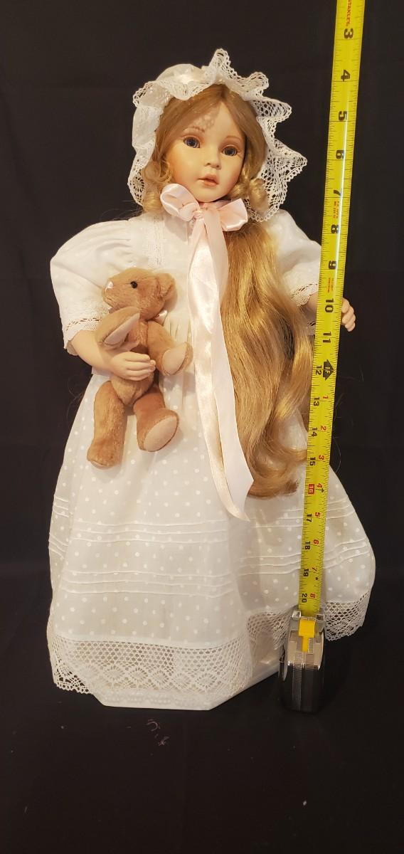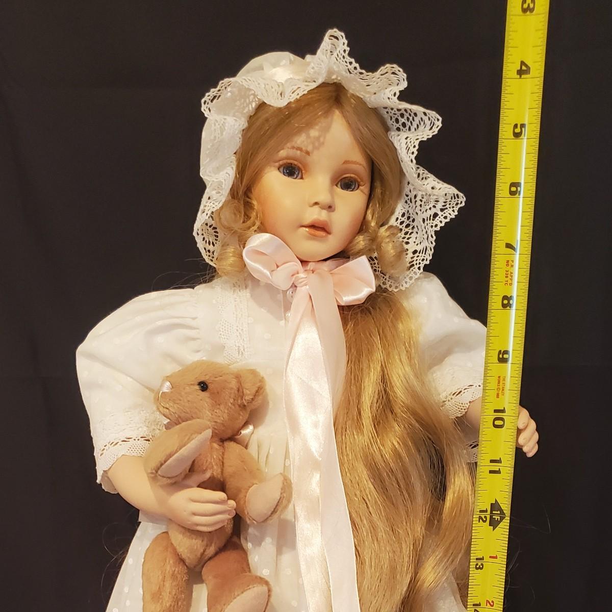 Doll Named "Florence" By Pauline with White Bonnet and Dress with Teddy Bear
