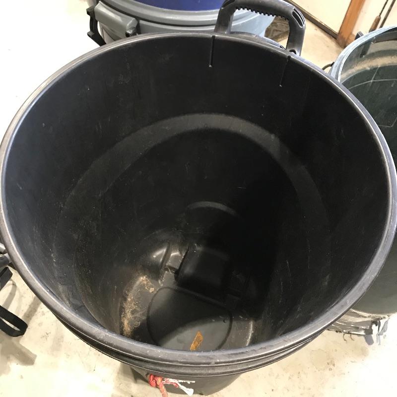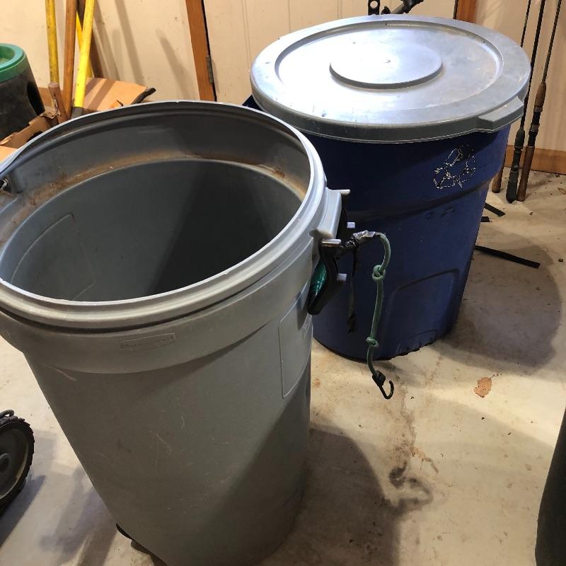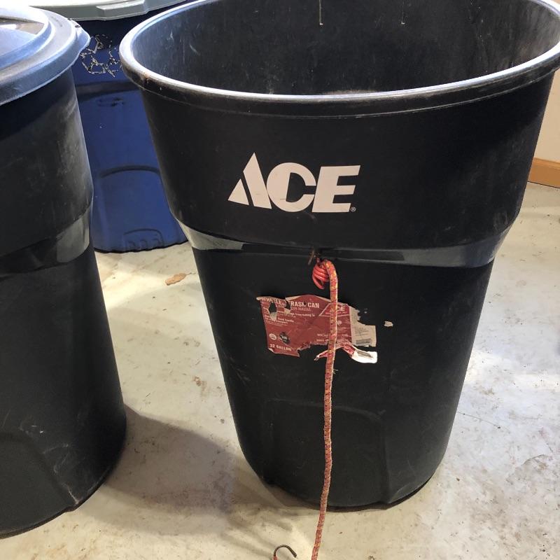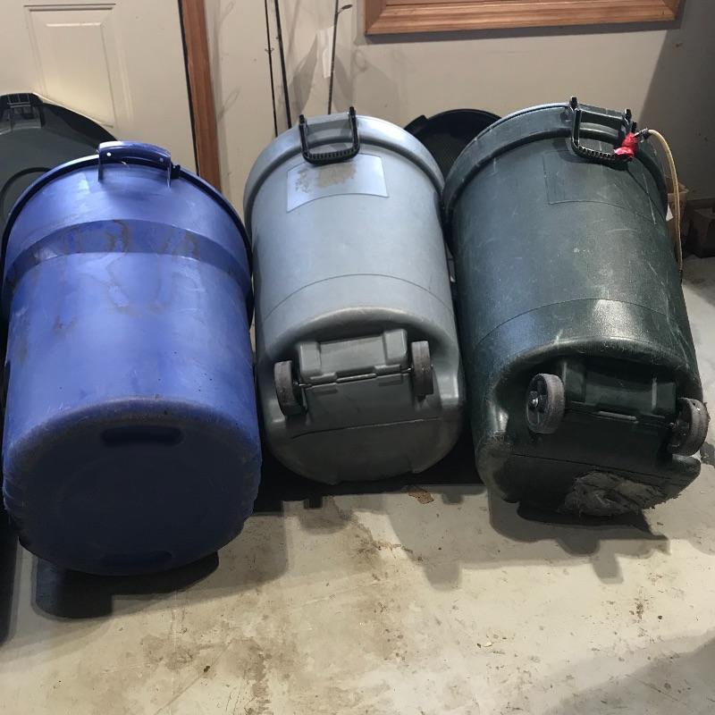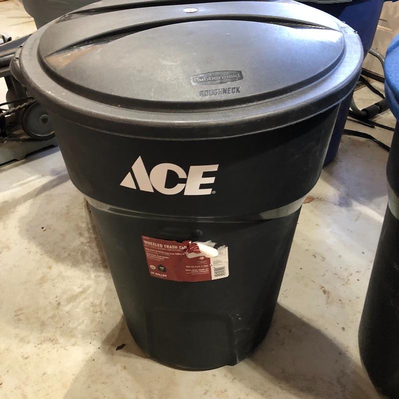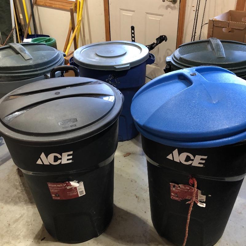 This lot includes five plastic Rubbermaid garbage cans with lids. Two black Ace labeled bins are noted to hold 32 gallons, they are all roughly the same size. The forest green bin has been repaired by duct tape, the image of the inside shows a small hole. Bins nest nicely for transport. The blue bin does not have wheels, but the other four will roll. One black Ace bin has a bungee punctured, presumably to keep the lid closed off from pests. Local pick up only.