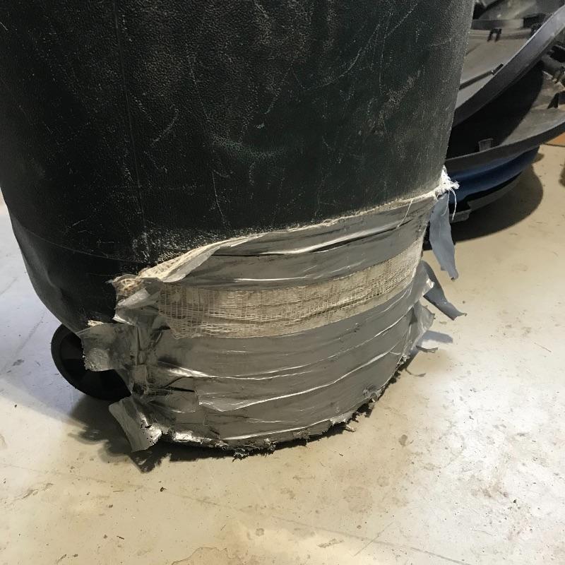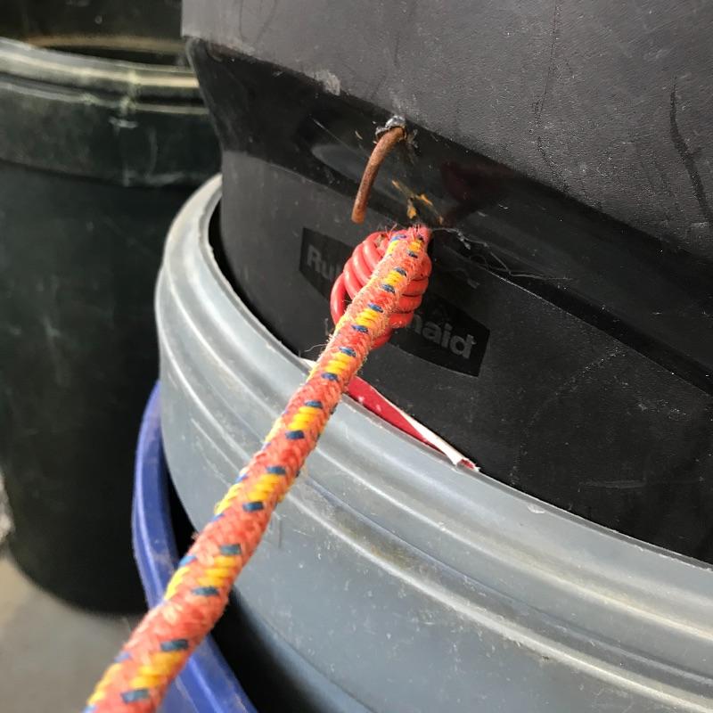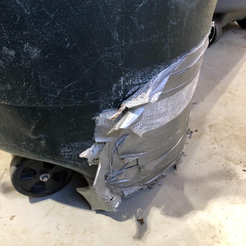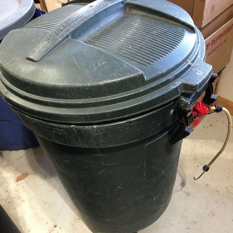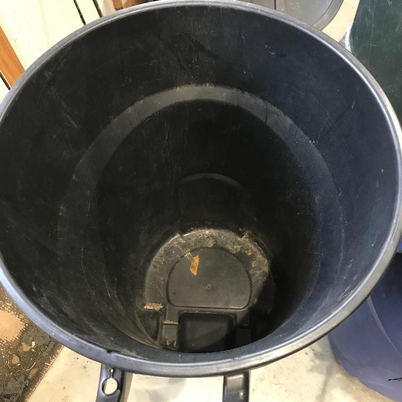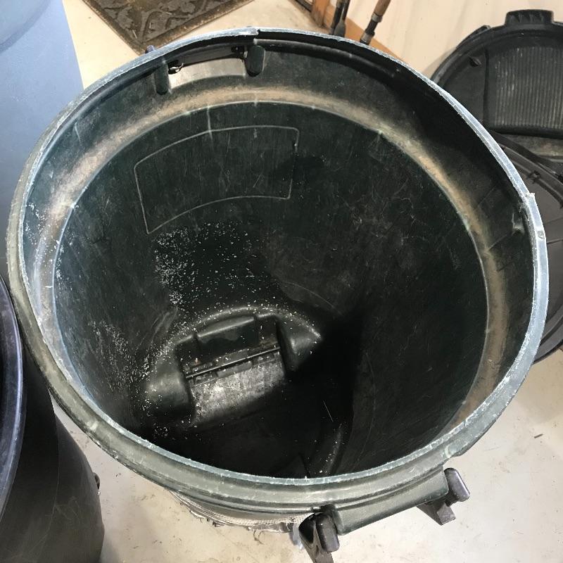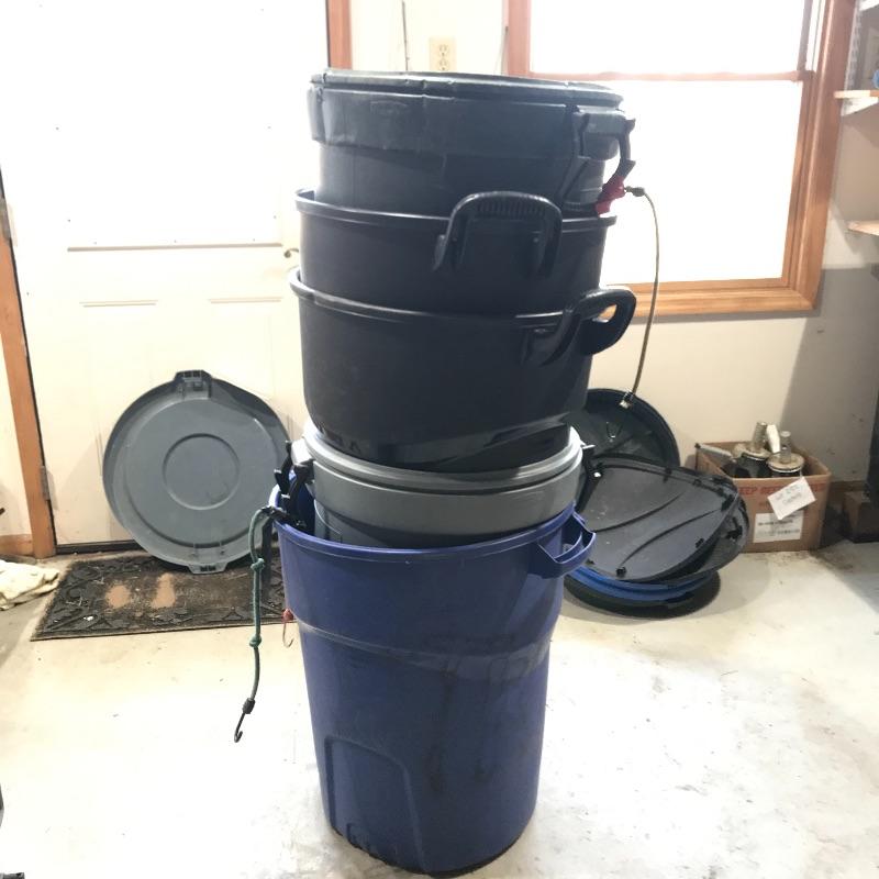 This lot includes five plastic Rubbermaid garbage cans with lids. Two black Ace labeled bins are noted to hold 32 gallons, they are all roughly the same size. The forest green bin has been repaired by duct tape, the image of the inside shows a small hole. Bins nest nicely for transport. The blue bin does not have wheels, but the other four will roll. One black Ace bin has a bungee punctured, presumably to keep the lid closed off from pests. Local pick up only.