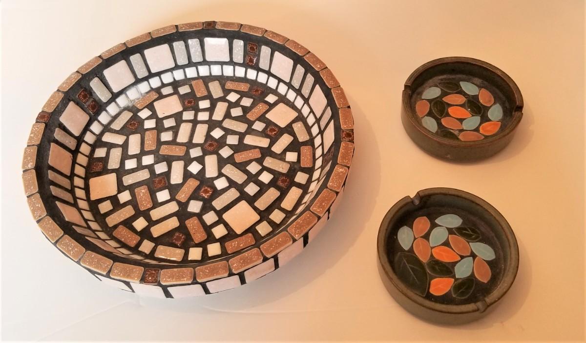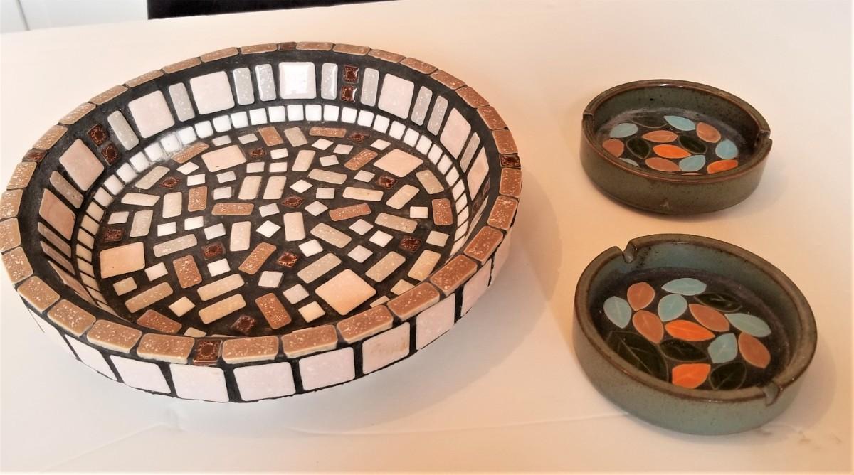 You get all three pieces - bowl (10.5" across) and two matching ashtrays (4.25" across. Midcentury mosaics - all in good vintage condition. Bowl is heavy.
