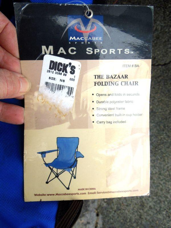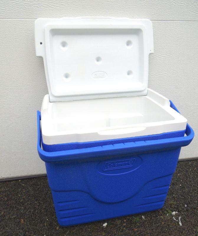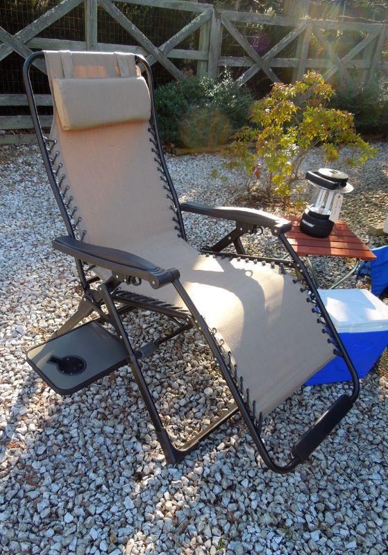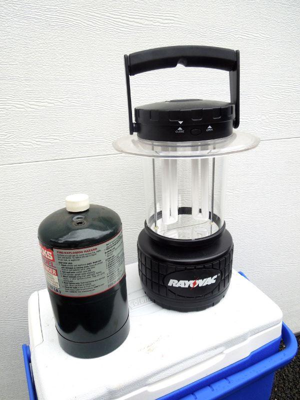 A beige folding gravity chair with beverage shelf; a like new MAC bright blue folding camp chair; a 2 six pack plastic Coleman cooler, an unused Redwood camp table; a battery powered flourescent lantern and a propane fuel canister. Battery in lantern needs charging. No charger found.