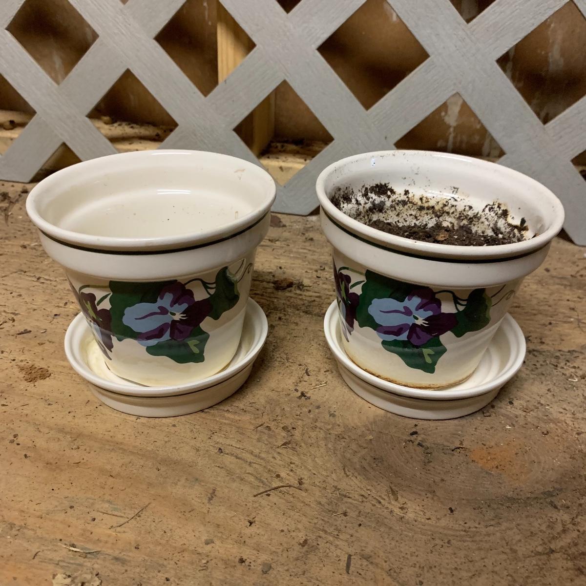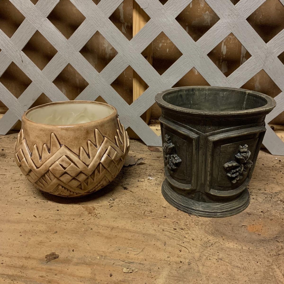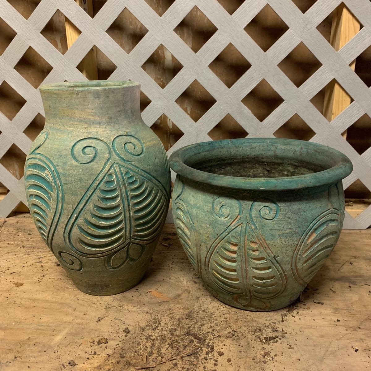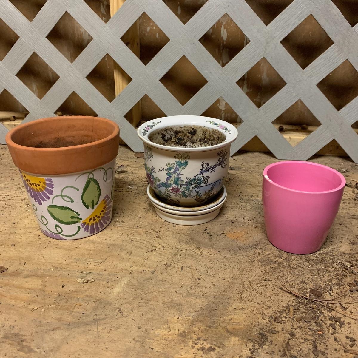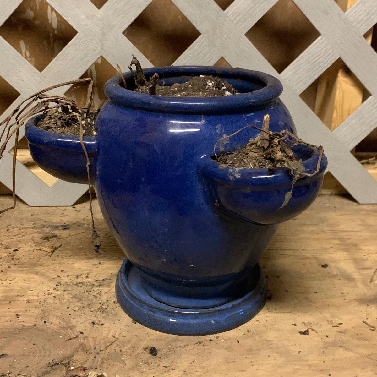 In this lot you’ll find a fun variety of planters of various shapes, sizes, and colors. There are a few larger pots including an attractive cobalt blue strawberry pot, some medium sized, and some smaller pots. There are urns, terracotta pots, some globe-shaped pots, and more. The majority are ceramic, except for the group seen in the last picture which are all plastic. Many saucers are included as well. The tall turquoise pot in the cover photo is 15” tall. Local pickup only.