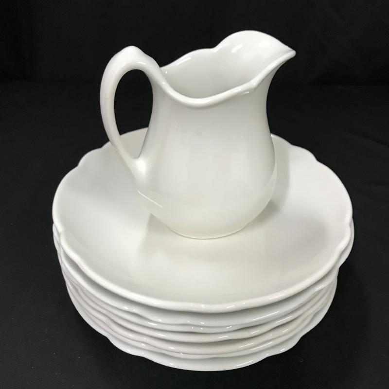 Plates and pitcher made by Sterling. 7 dinner plates are 10”d. Pitcher is 6”h. Shipping or local pick up in Asheville