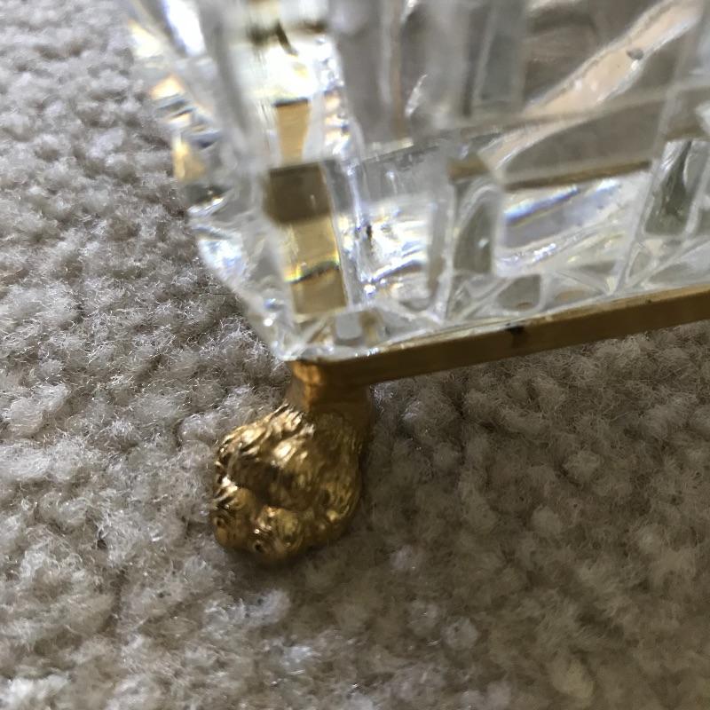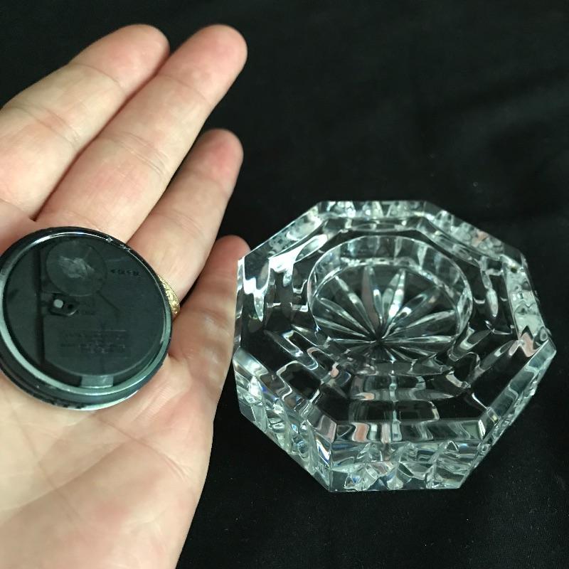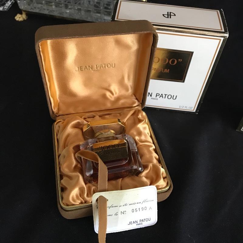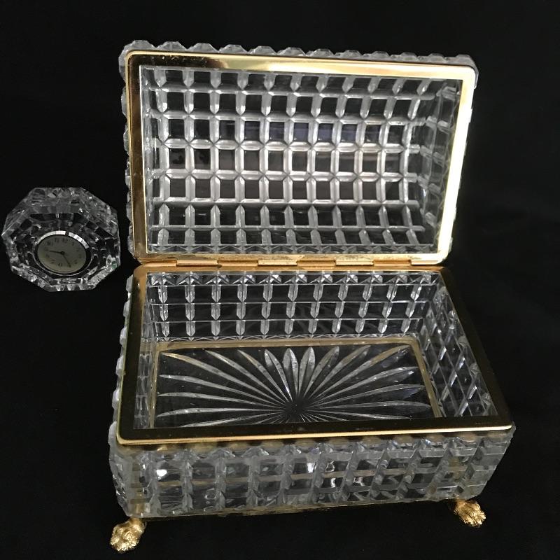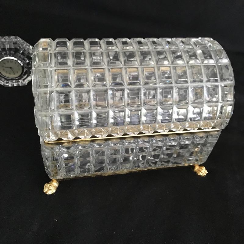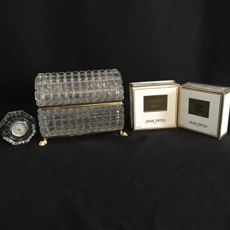 One never opened “Joy” and one mostly full “1000” parfum by Jean Patou, Paris. Sterling Transitions cannot verify contents of bottles. The Jean Patou duo is accompanied by a small glass clock and a lovely cut glass styled box with gold accents. The box is heavy and measures approximately 8” x 5” x 5.5”. The clock itself is removable and battery operated. The clock is not currently operating and it is unclear if changing the battery would resume operation. The octagon clock is 3” tall.