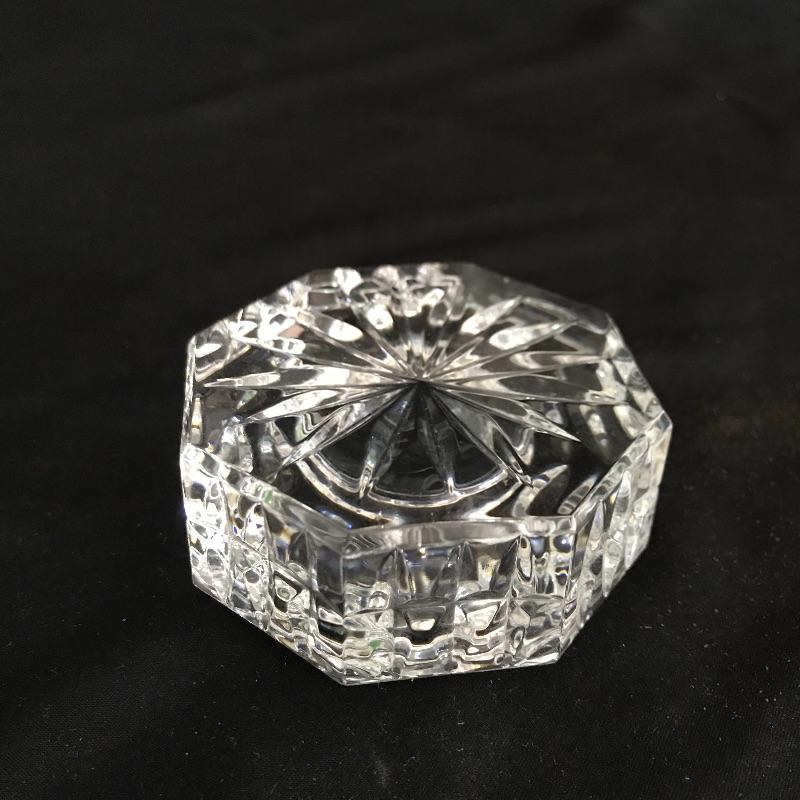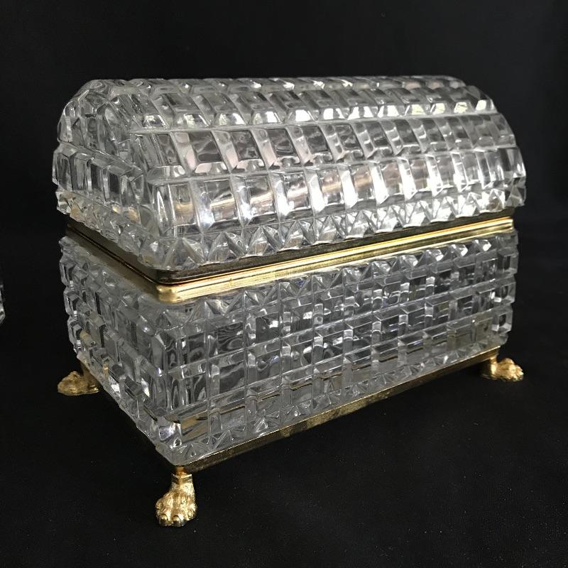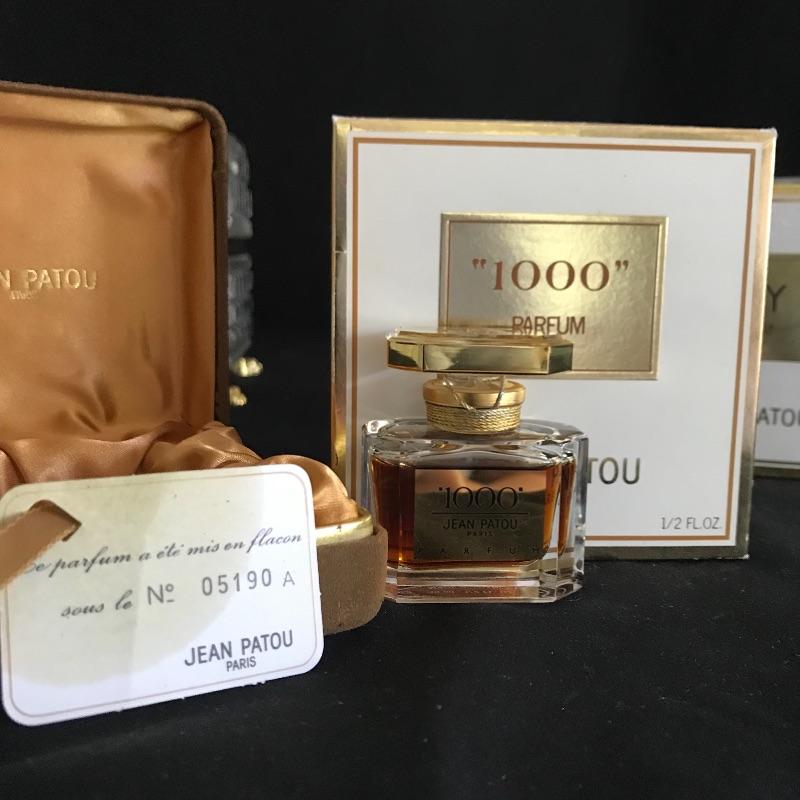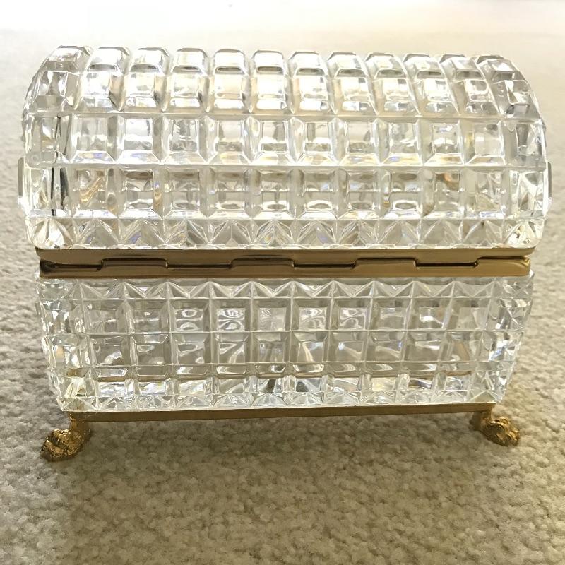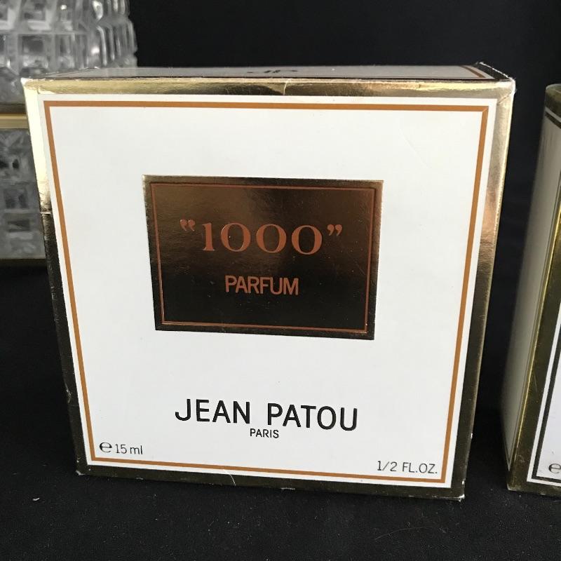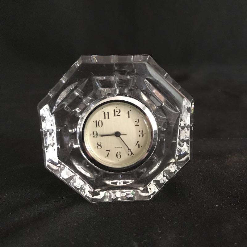 One never opened “Joy” and one mostly full “1000” parfum by Jean Patou, Paris. Sterling Transitions cannot verify contents of bottles. The Jean Patou duo is accompanied by a small glass clock and a lovely cut glass styled box with gold accents. The box is heavy and measures approximately 8” x 5” x 5.5”. The clock itself is removable and battery operated. The clock is not currently operating and it is unclear if changing the battery would resume operation. The octagon clock is 3” tall.