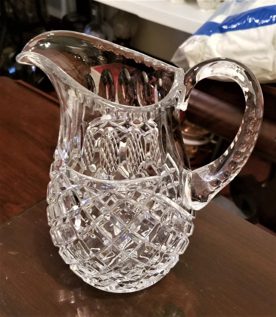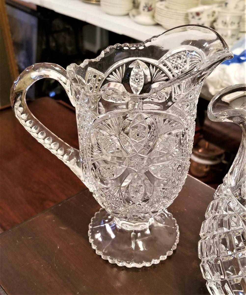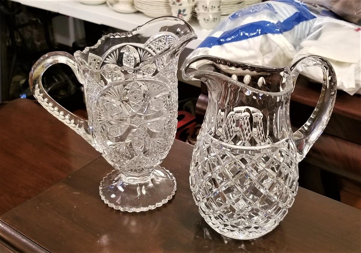 Two lovely pitchers here - the one on the left is early American pressed glass - the one on the right is crystal - looks very "Waterfordy". but I could not find a mark. The larger is 8.5" tall, the slightly shorter one is 8" tall. Both in nice condition.