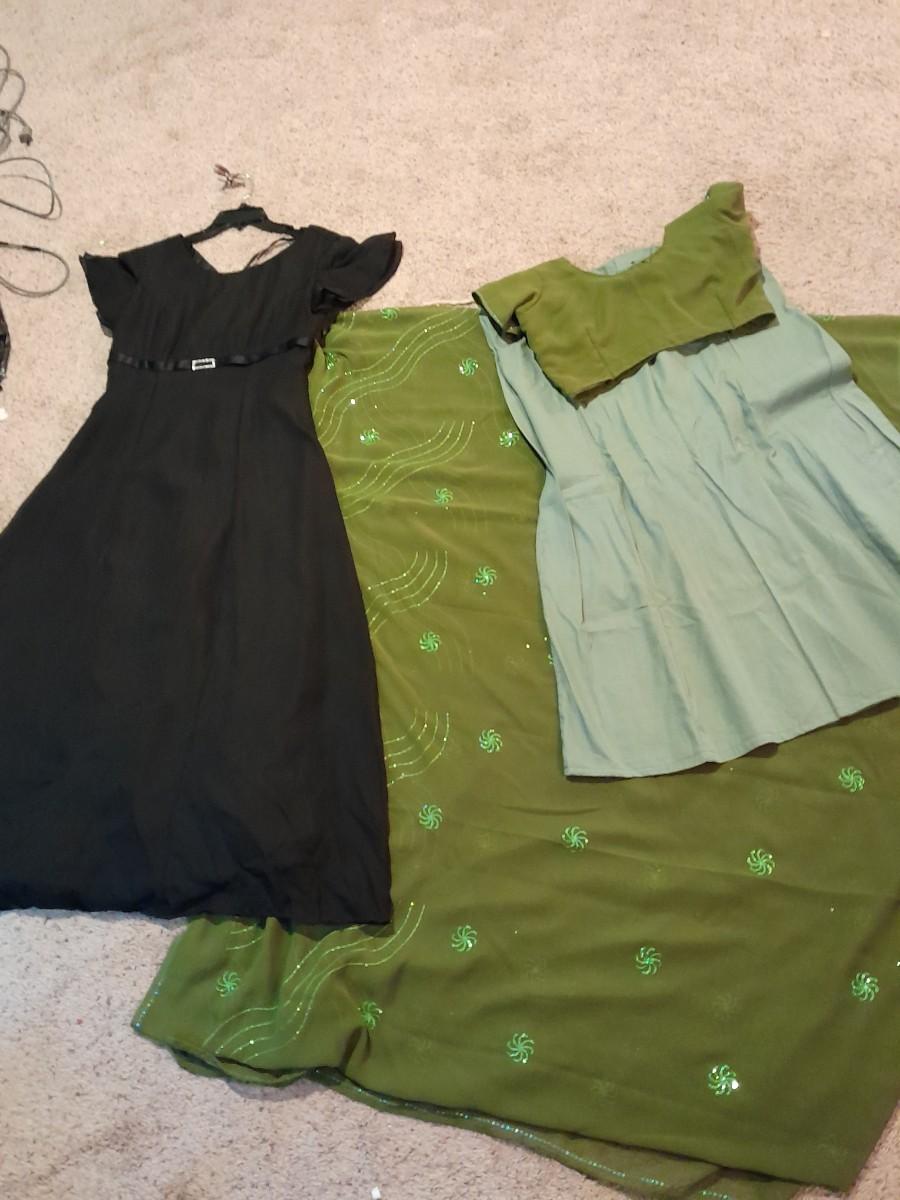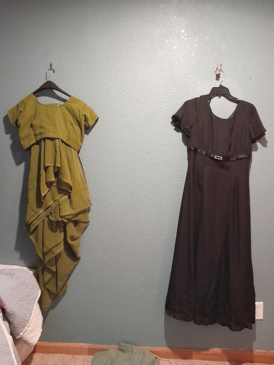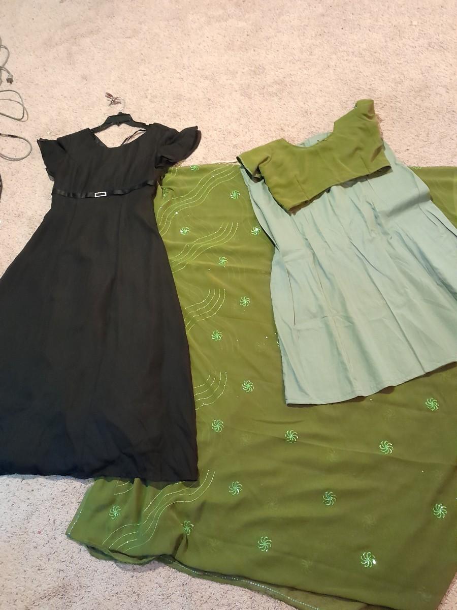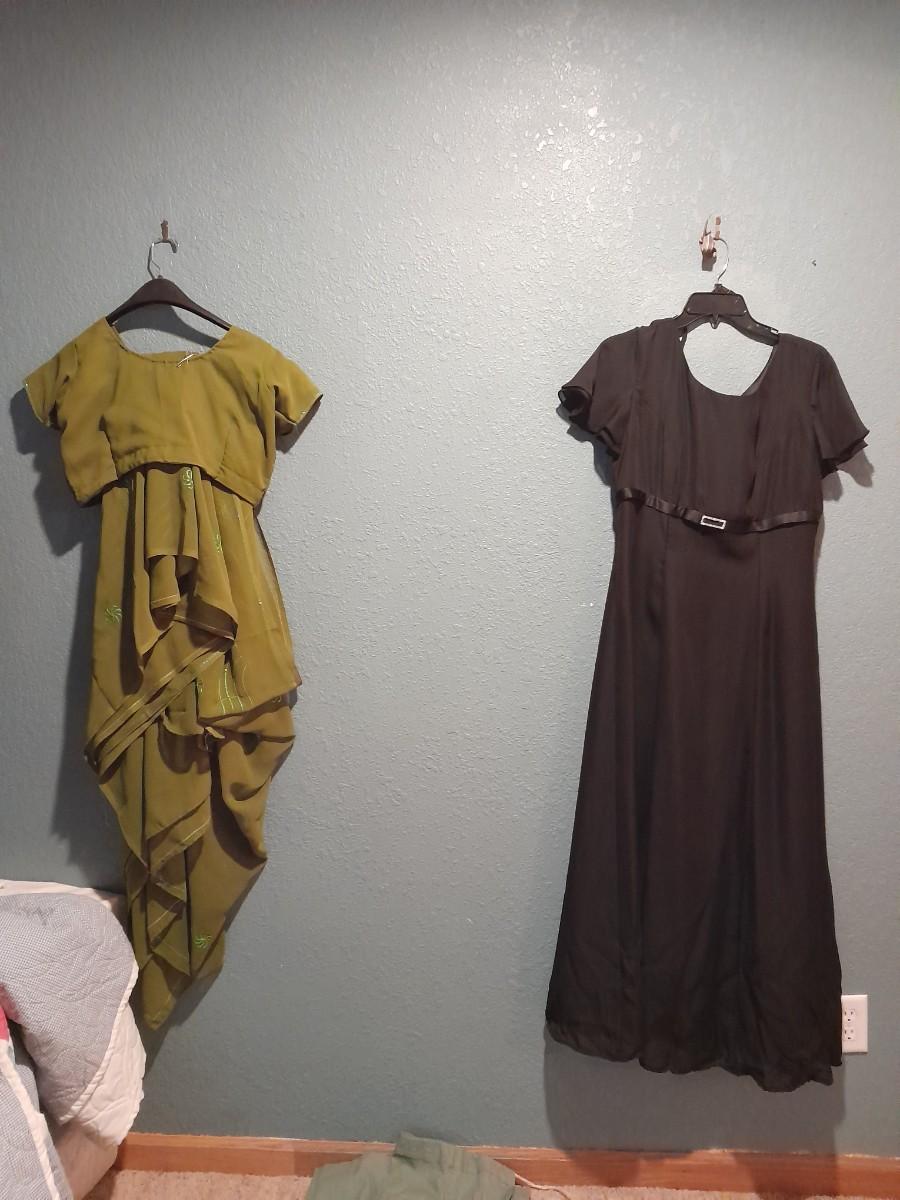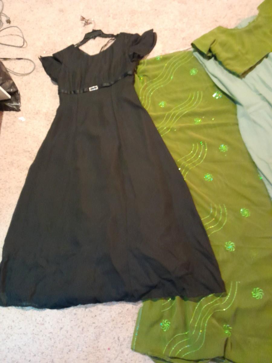 TWO WOMEN'S DRESSES. ONE BLACK BY STYLE ACCENTS PERFORMANCE APPAREL, AND ONE GREEN TOP WITH SKIRT AND LONG WRAP WITH BLING