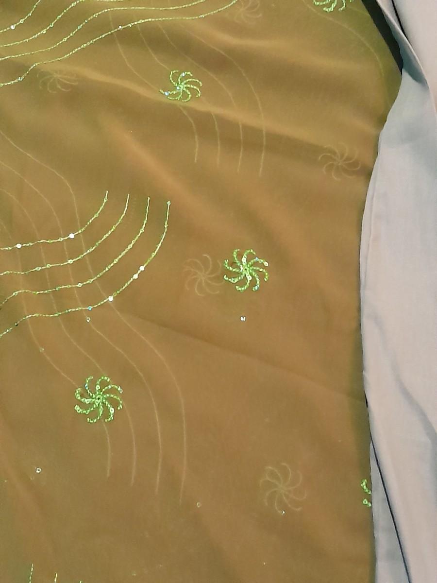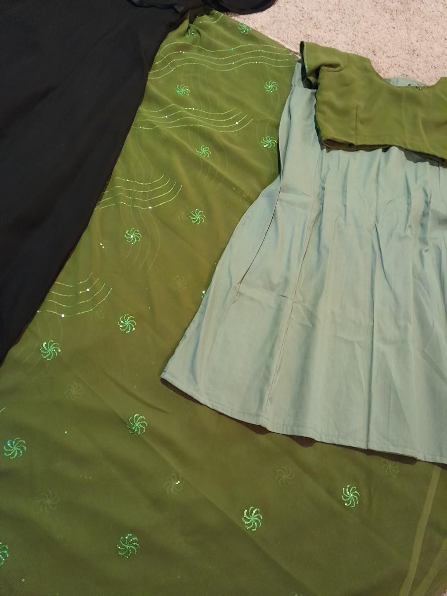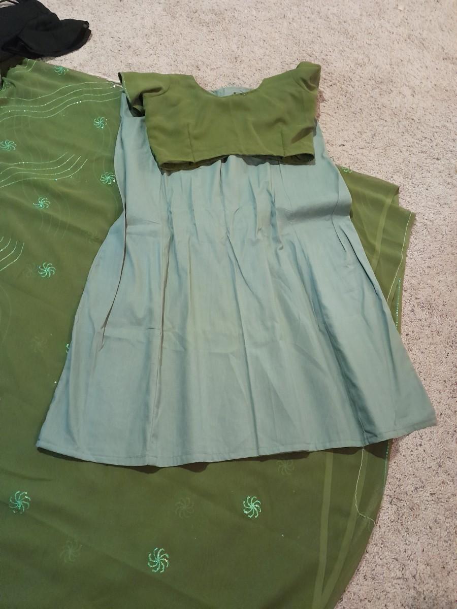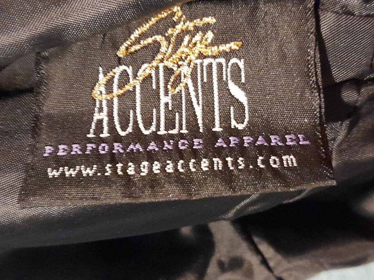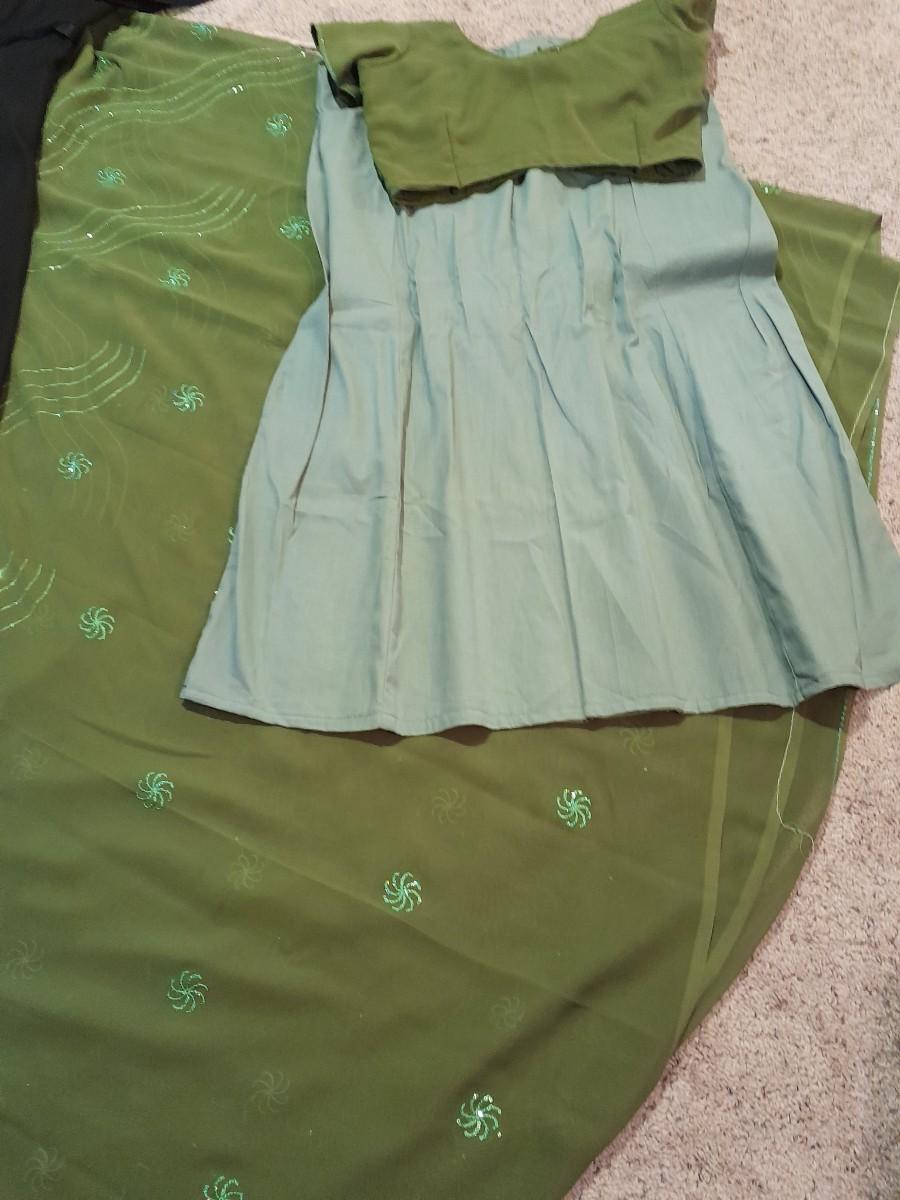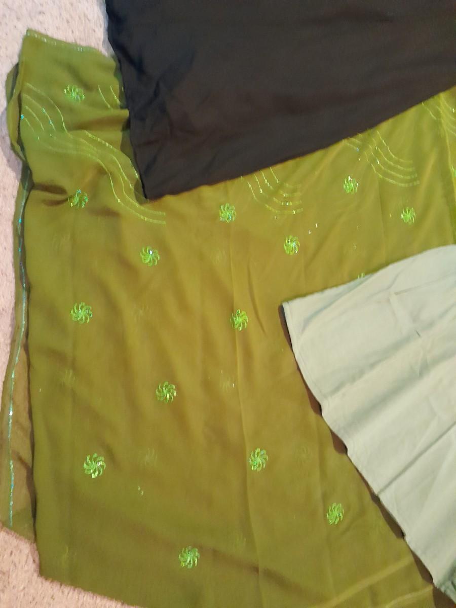 TWO WOMEN'S DRESSES. ONE BLACK BY STYLE ACCENTS PERFORMANCE APPAREL, AND ONE GREEN TOP WITH SKIRT AND LONG WRAP WITH BLING