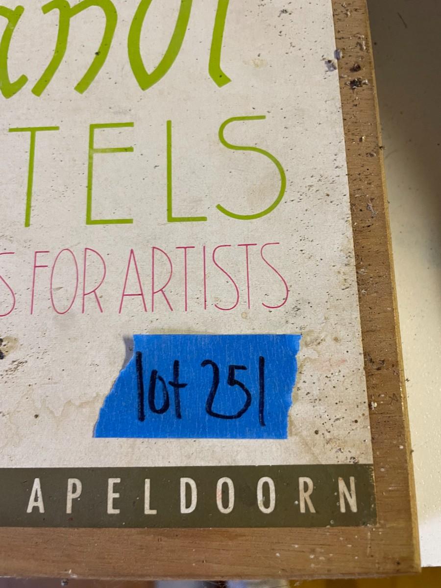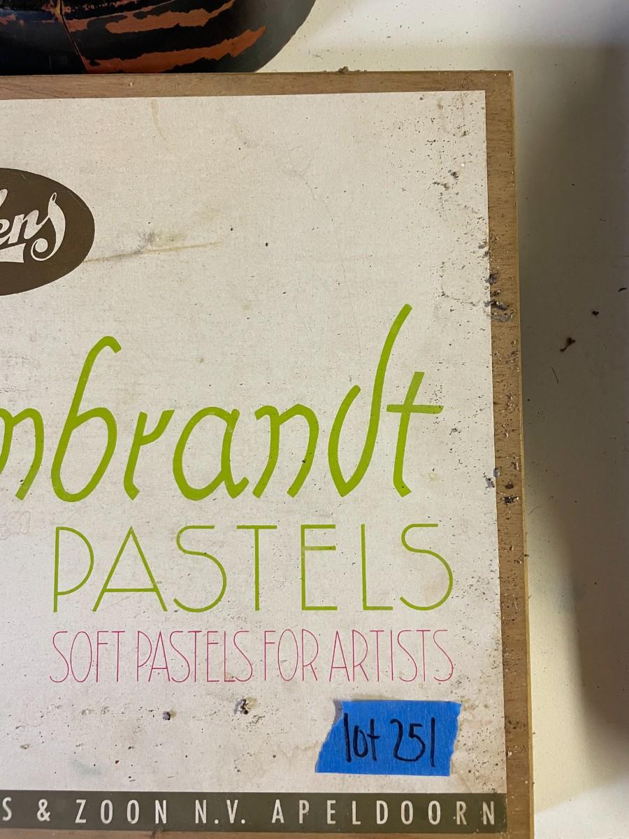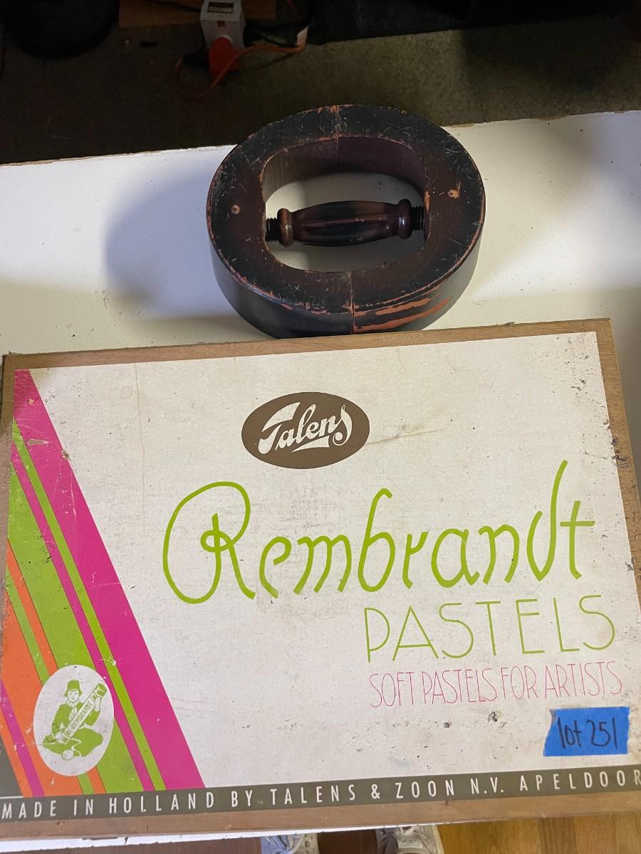 lot 251- vintage Holland box of pastels, wooden hat stretcher