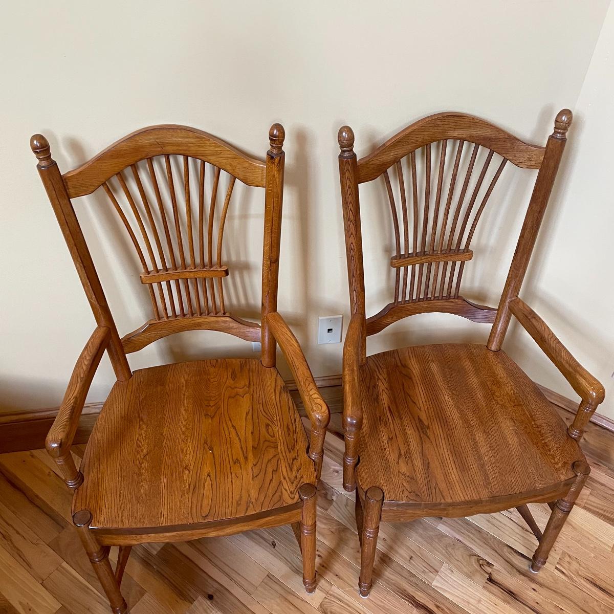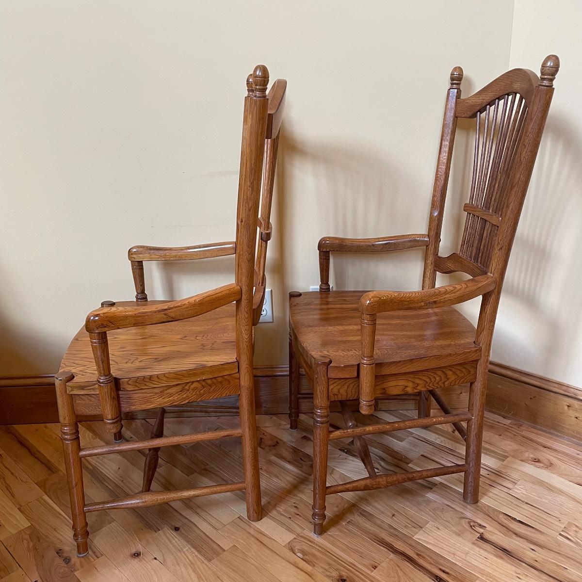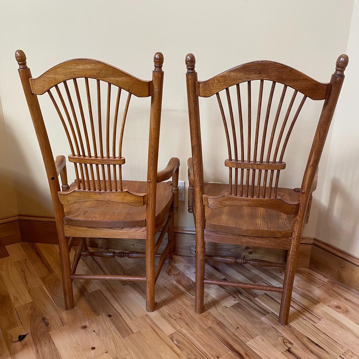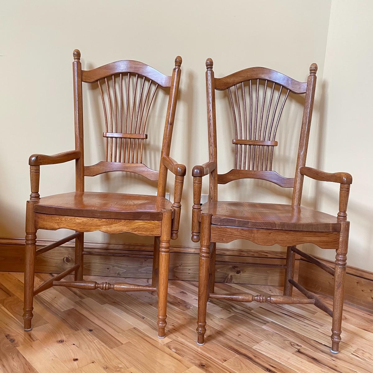 Two quality spindle-back chairs arm chairs appear extremely well built. They are also very versatile, making terrific head of table chairs or sitting room chairs. These two are both heavy for their size and look like they are solid wood. View the ornate placement of the spindles and the details on the arms. Don’t let these two pass you by! Chairs measure approximately 22” x 21” x 41.5” with a seat height at 18”. Local pick up only.