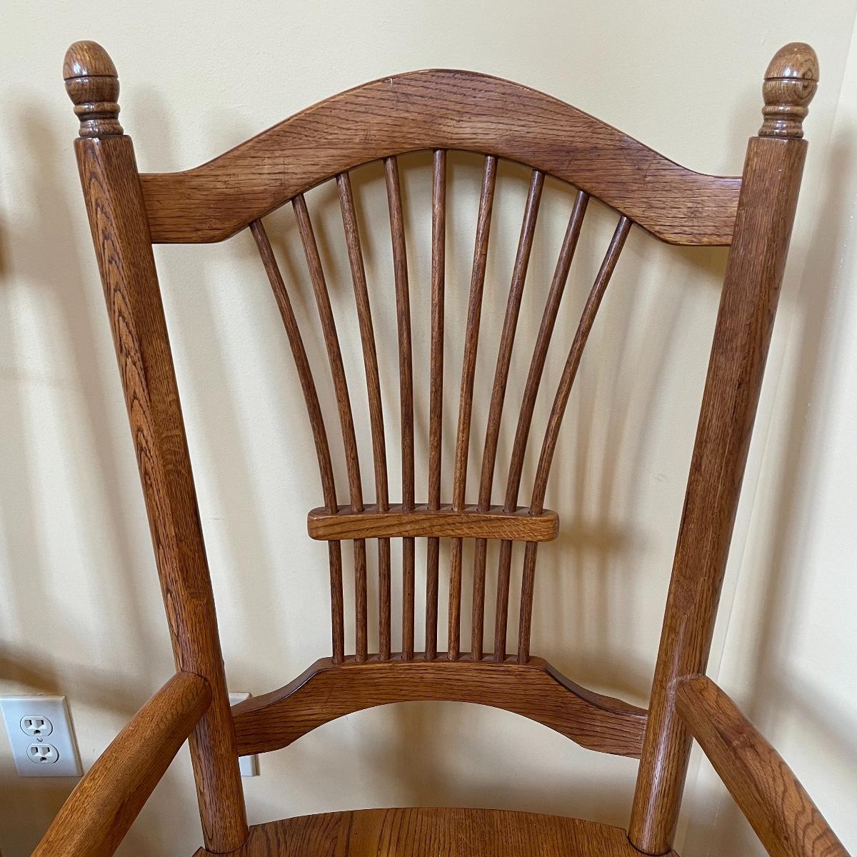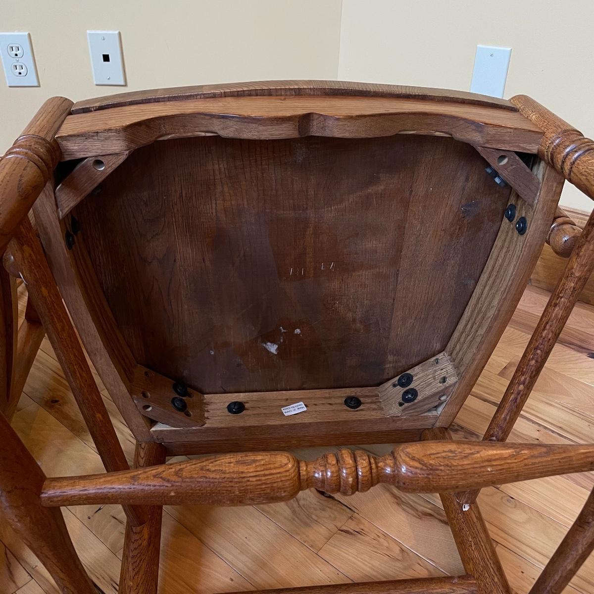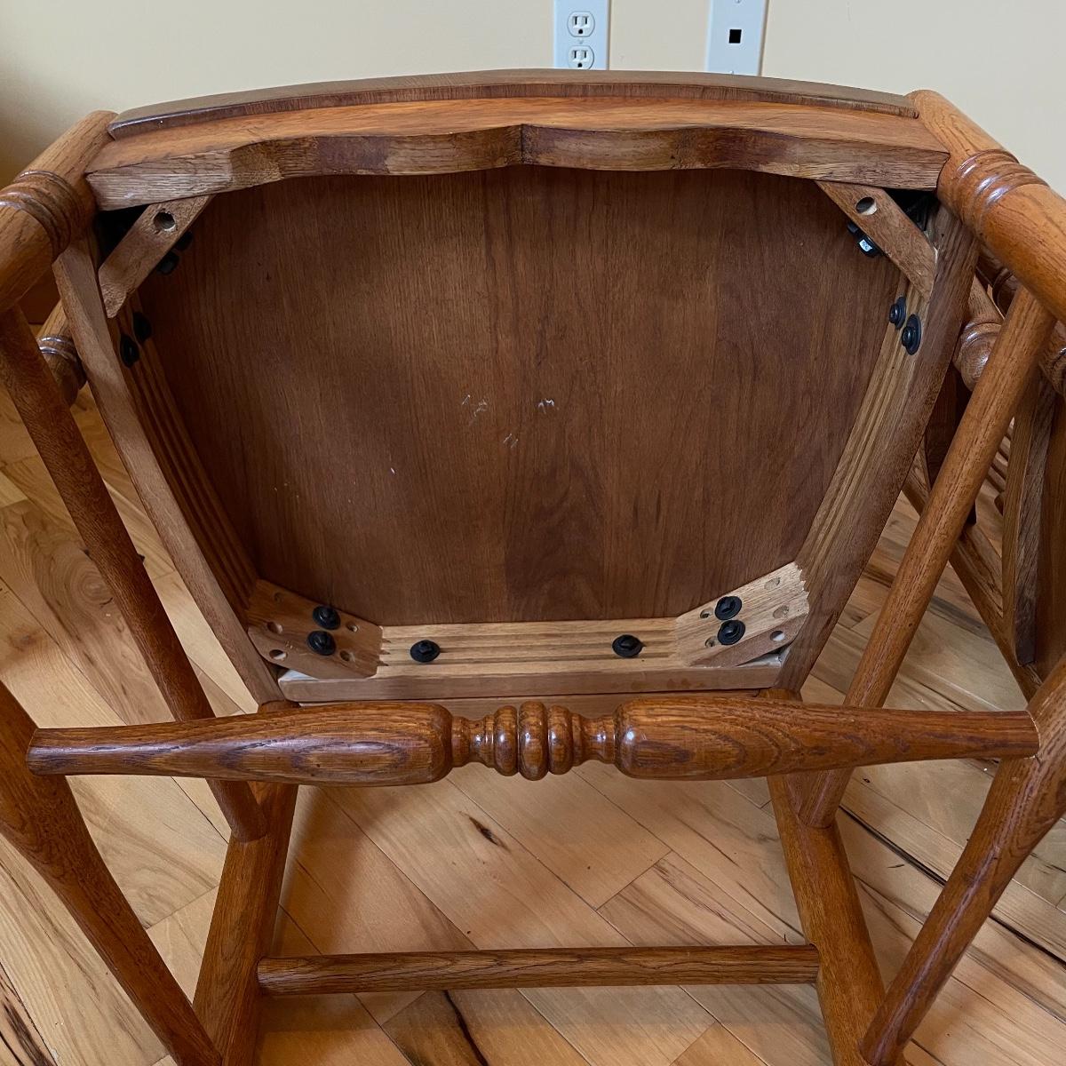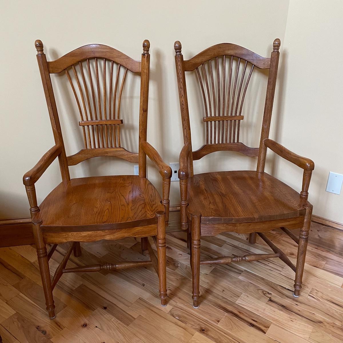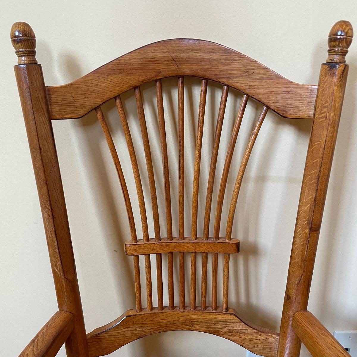 Two quality spindle-back chairs arm chairs appear extremely well built. They are also very versatile, making terrific head of table chairs or sitting room chairs. These two are both heavy for their size and look like they are solid wood. View the ornate placement of the spindles and the details on the arms. Don’t let these two pass you by! Chairs measure approximately 22” x 21” x 41.5” with a seat height at 18”. Local pick up only.