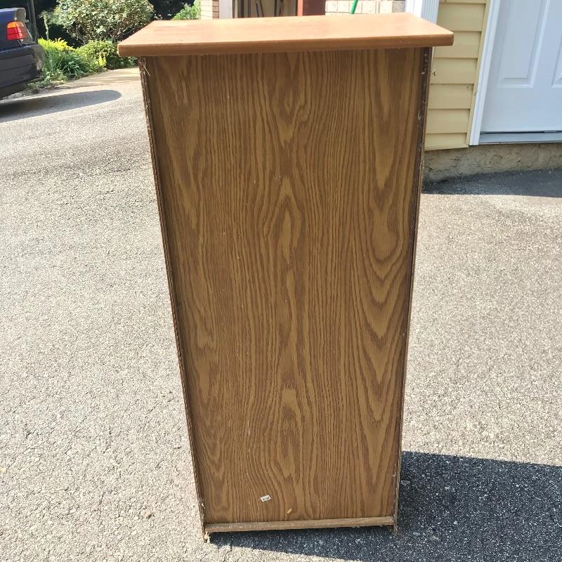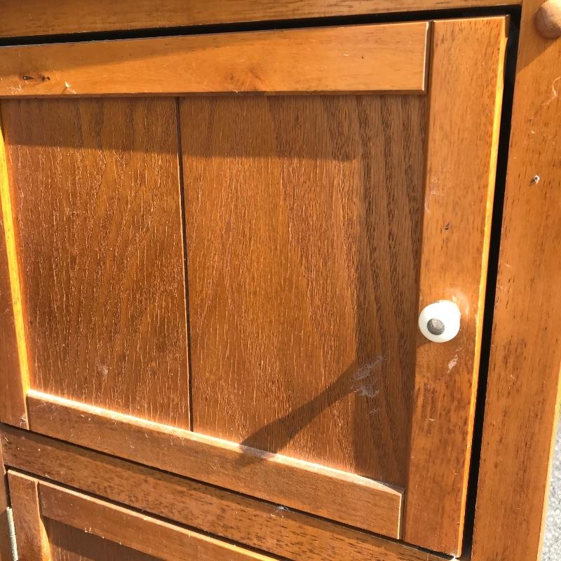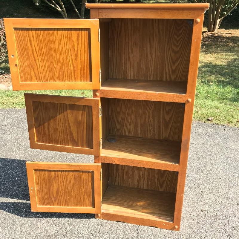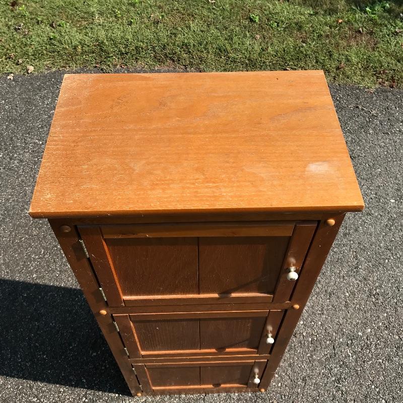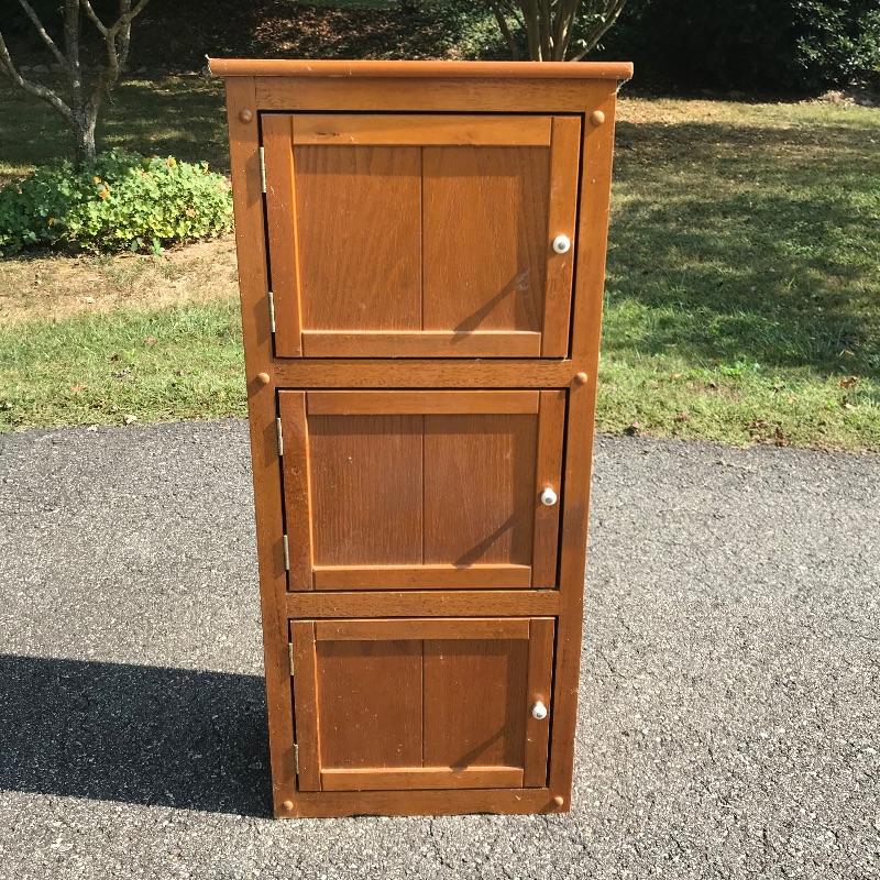 Lovely small storage cabinet. This three door cabinet appears to be a mix of solid wood and pressed wood and measures approximately . The piece was previously stored in the garage and shows some wear. Local pick up only.