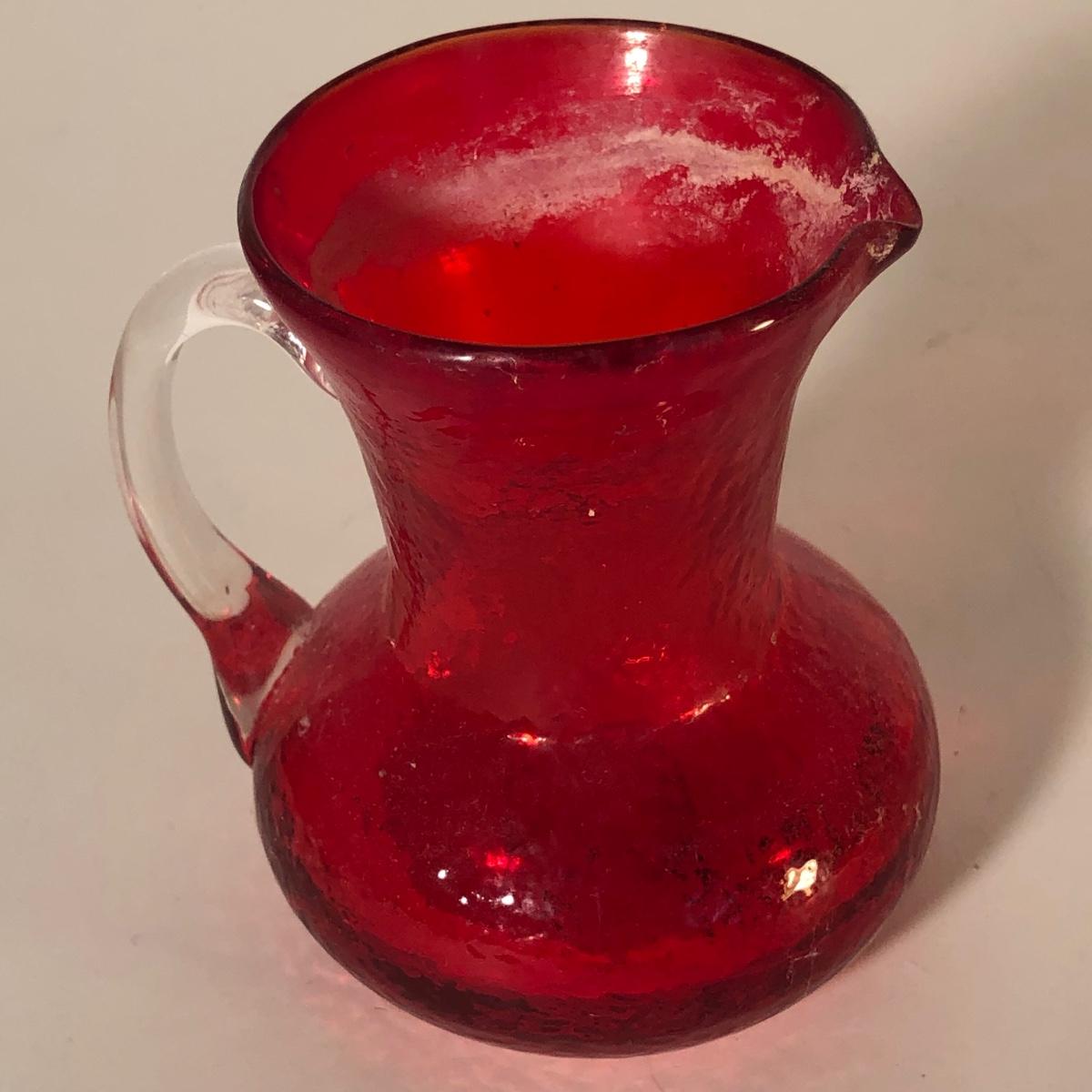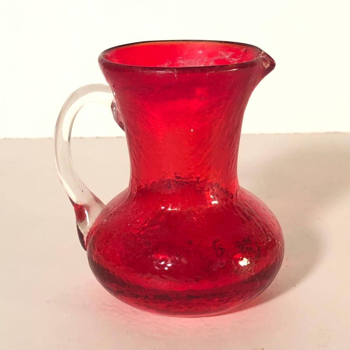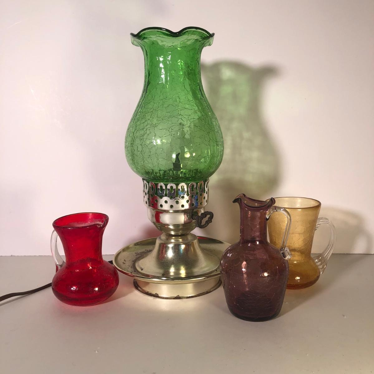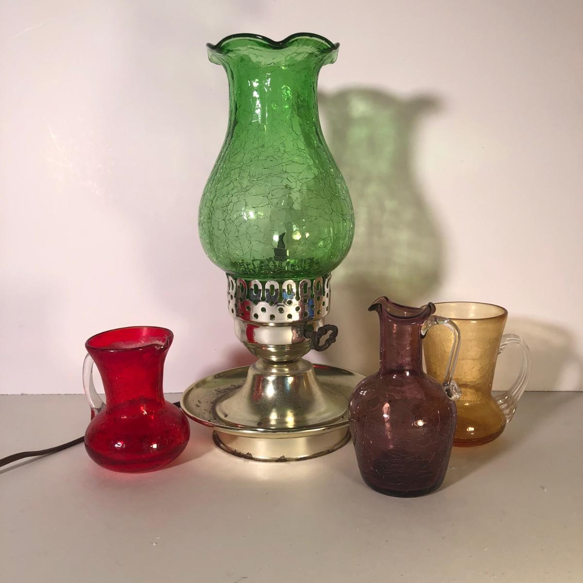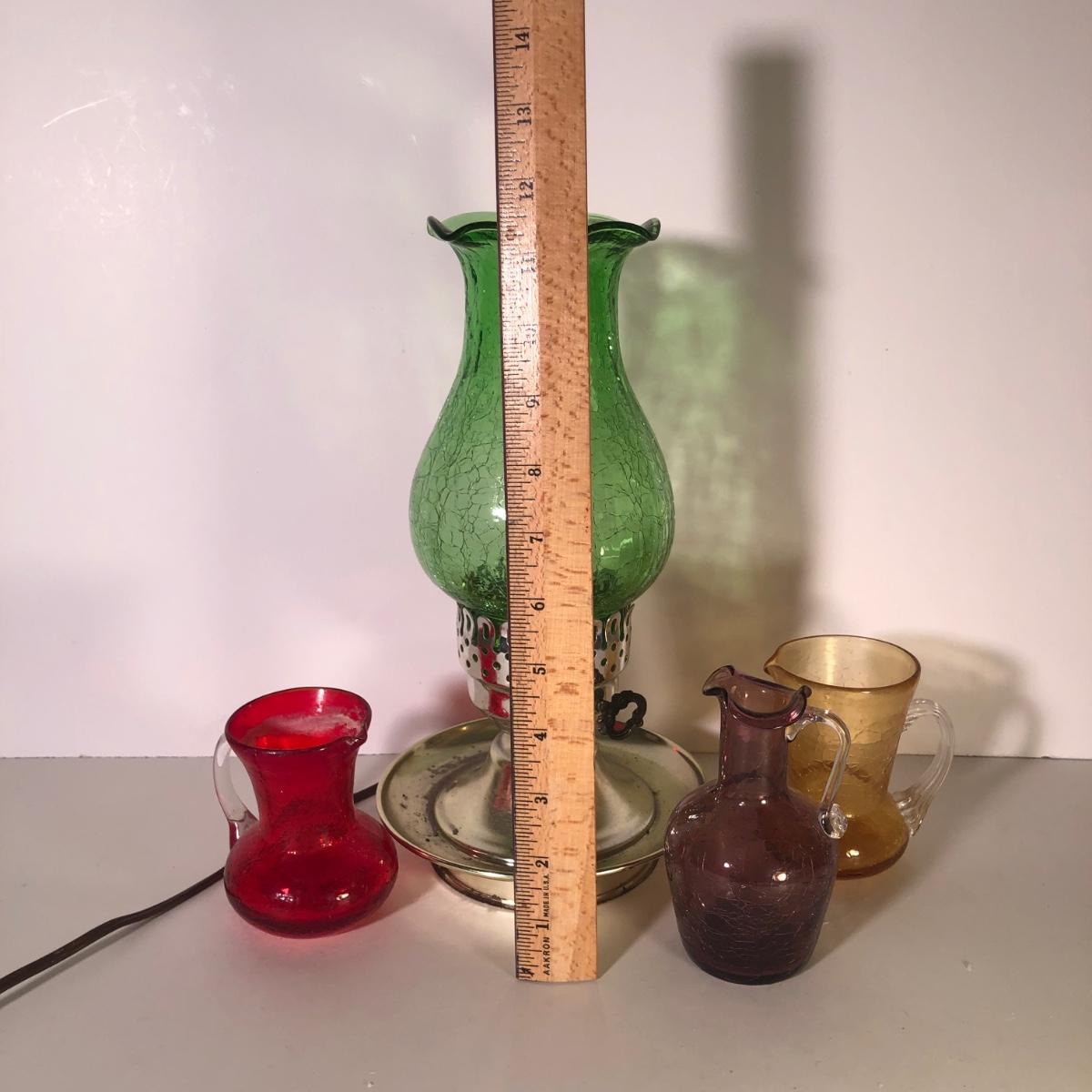 LOT 251G: Vintage Green Crackle Glass Lamp, Crackle Glass Pitchers & Ruby Glass Pitcher