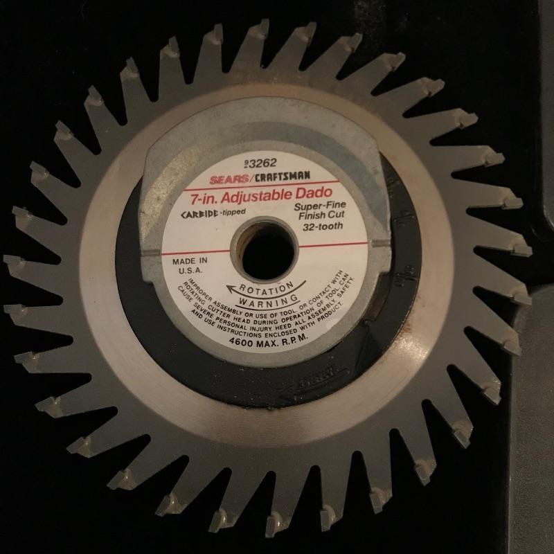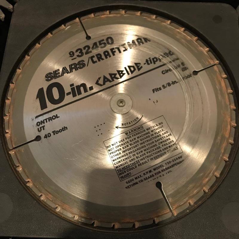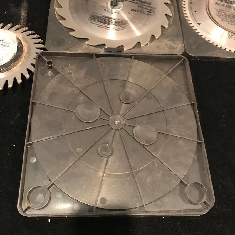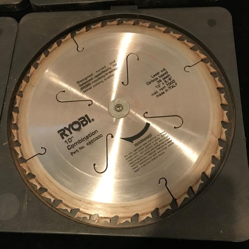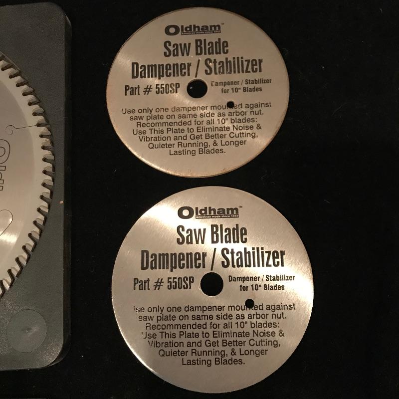Four 10 inch saw blades in plastic storage cases by Sears, Ryobi and Oldham. Two Oldham Dampener/Stabilizers and one 7” Sears Adjustable Dado featuring Super-fine finish cut 32-tooth. See photos. No shipping.