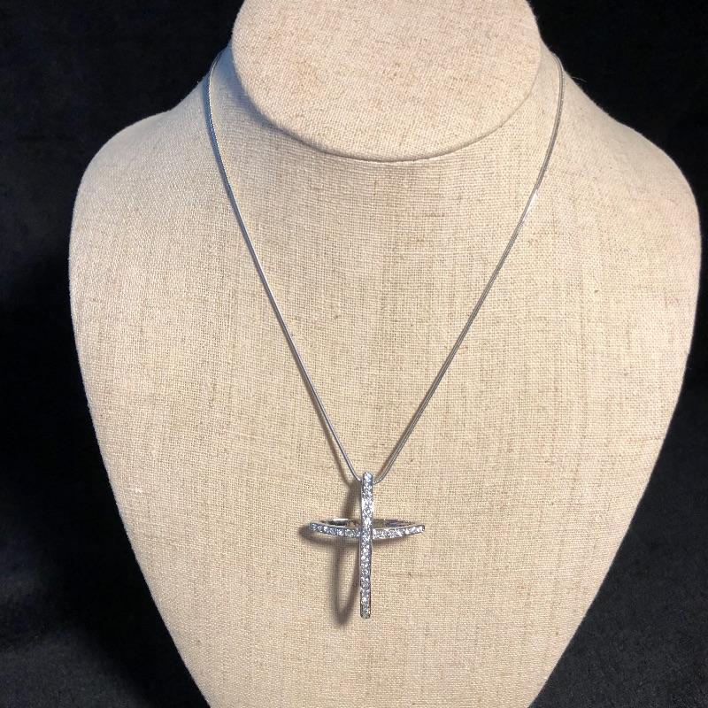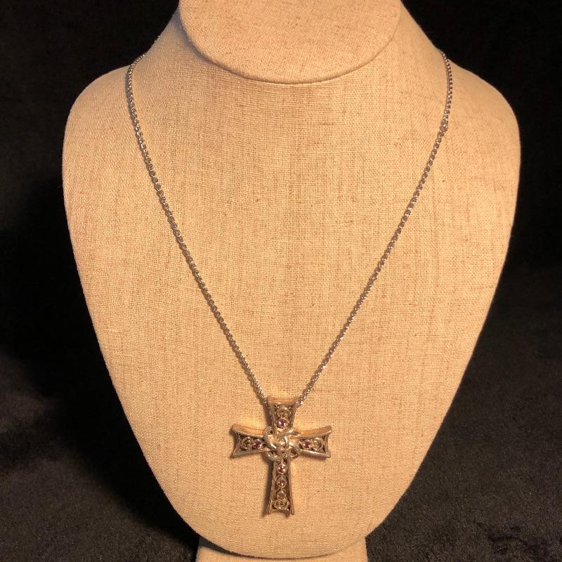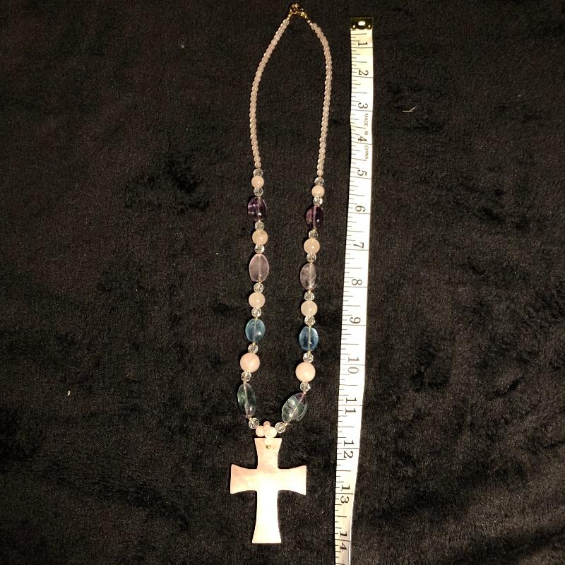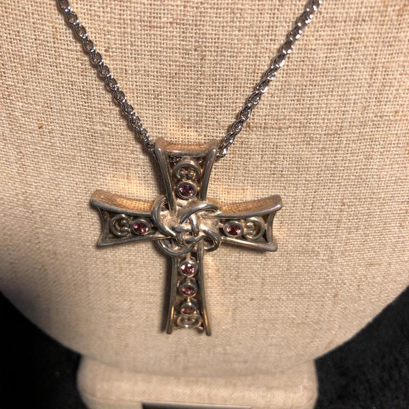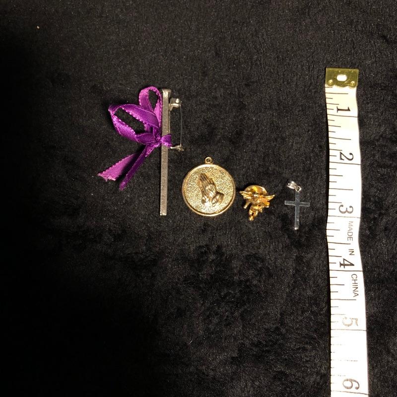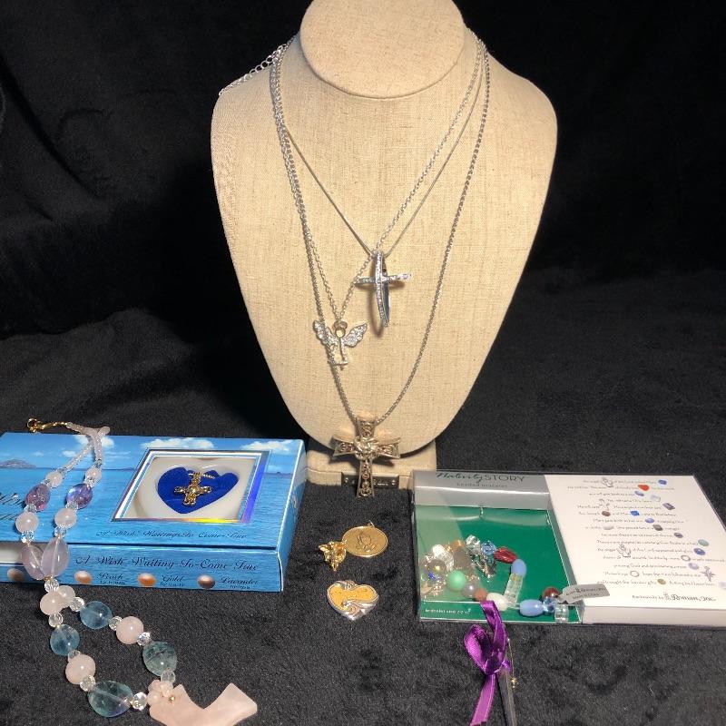Lovely assortment of Christian jewelry that includes a Gorham sterling pendant, a cross pendant necklace marked 925 plus three additional necklaces. The small cross pendant is marked pin 950 pt, see images.Also included are an assortment of other pendants and pins, a beaded bracelet and a wish pearl.