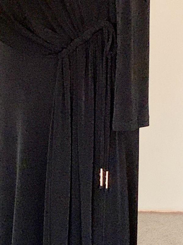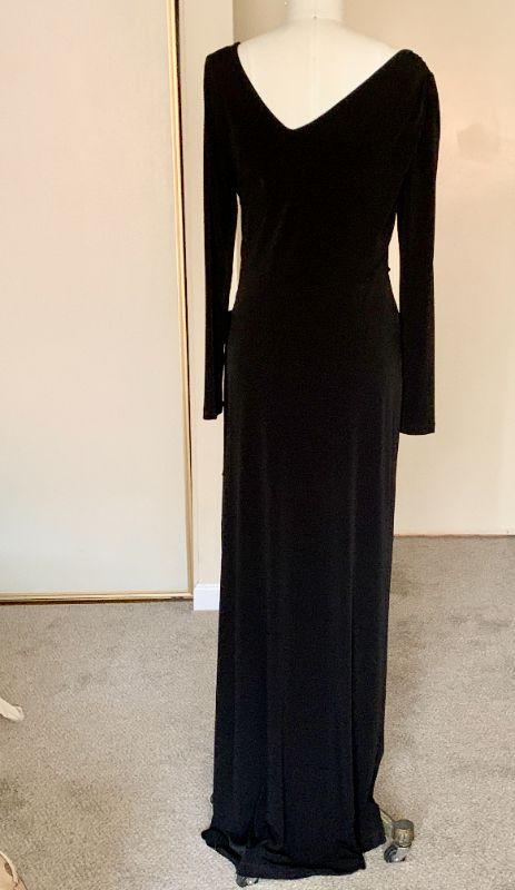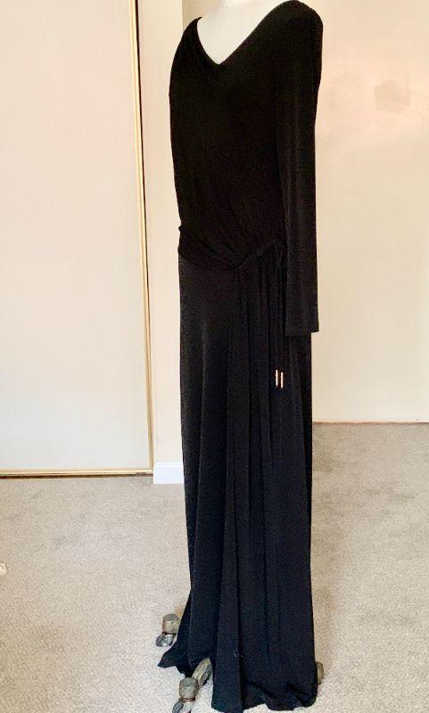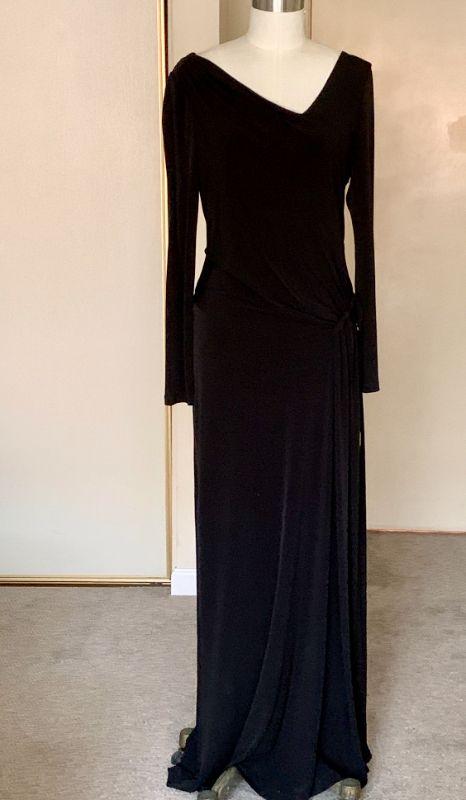 Gorgeous long sleeve floor length jersey gown with side drape and asymmetrical neckline. Size 12