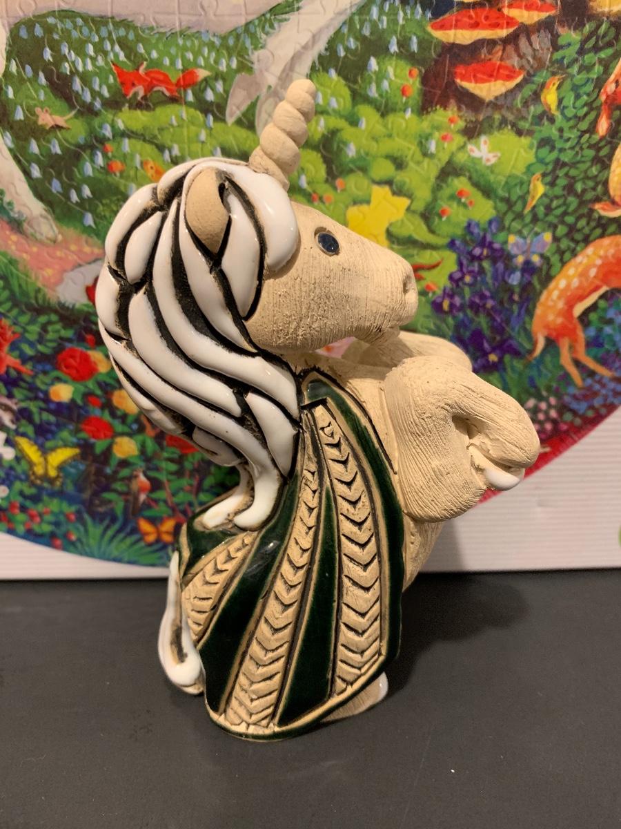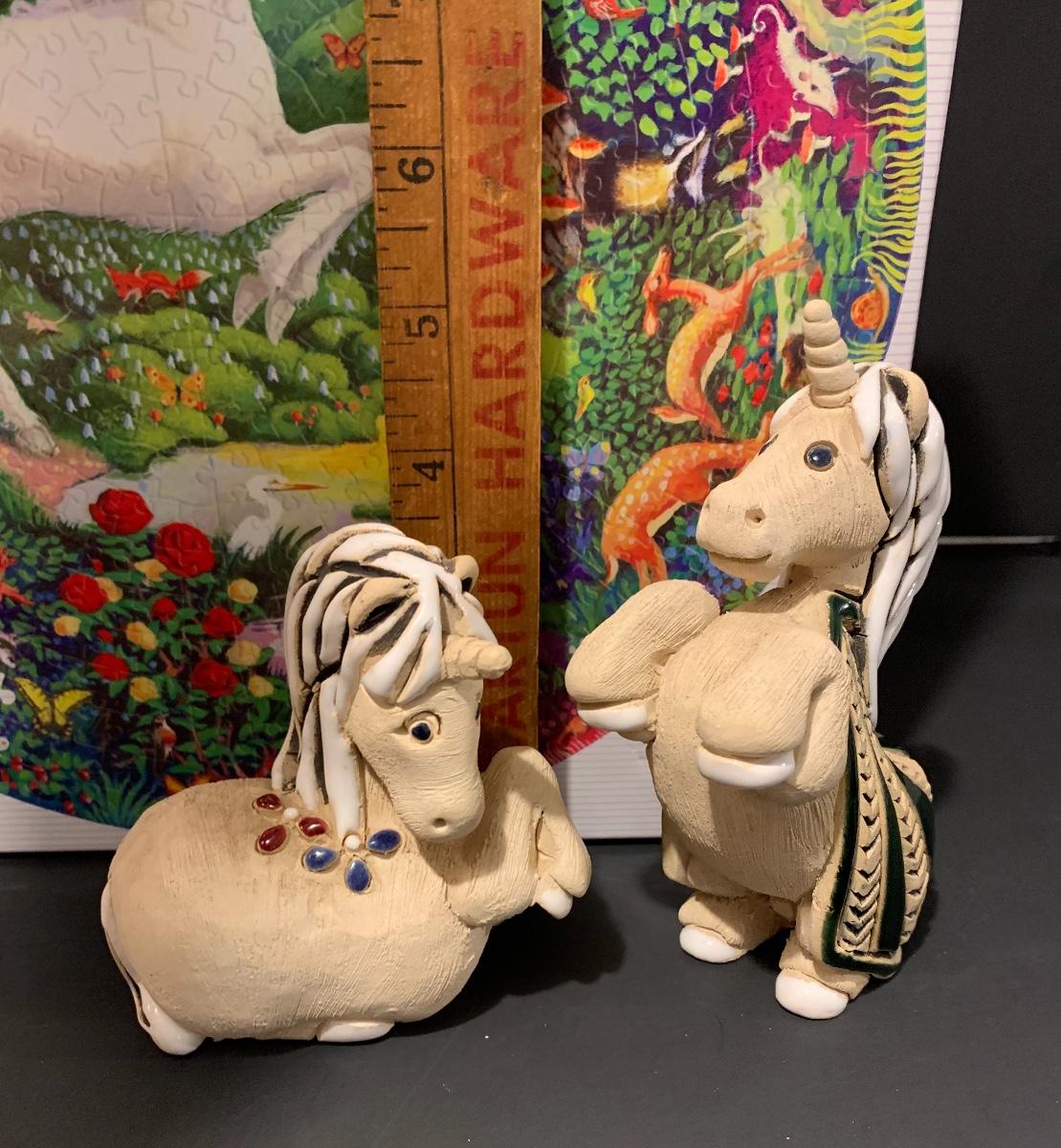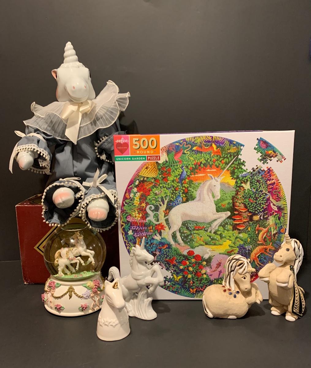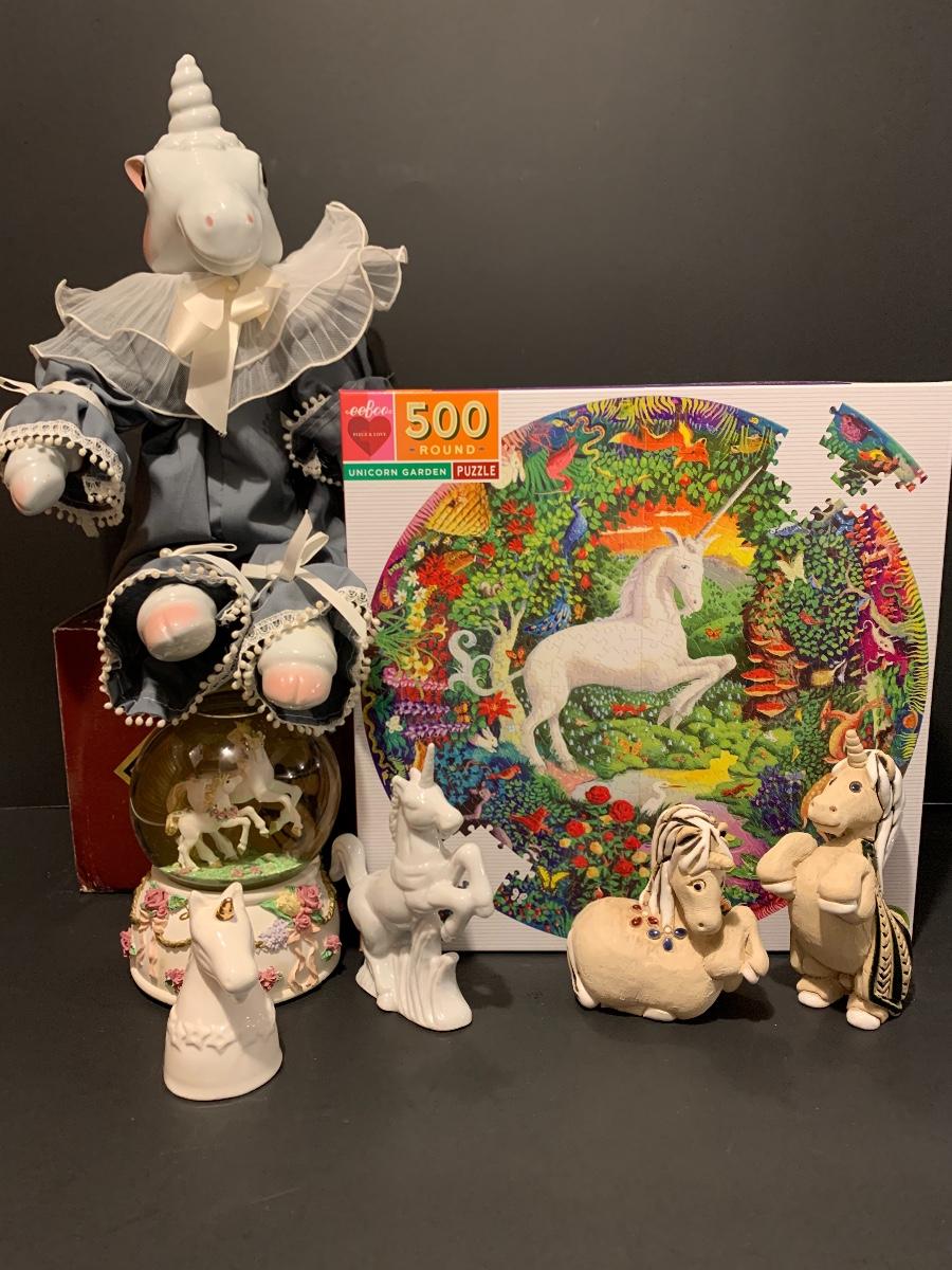 Lot 252 Whimsical Unicorns: Signed Pottery Figurines, New Puzzle, New Vintage Porcelain Unicorn Doll & More