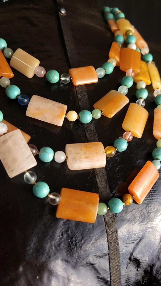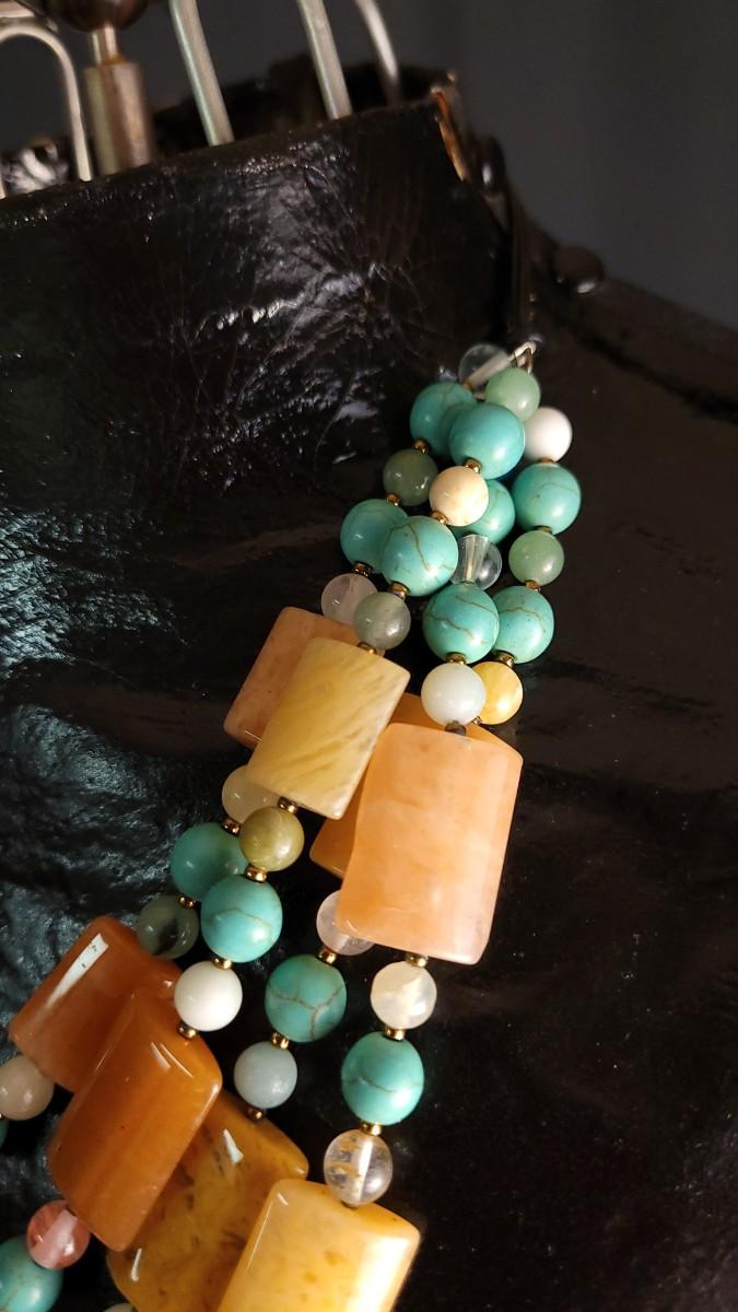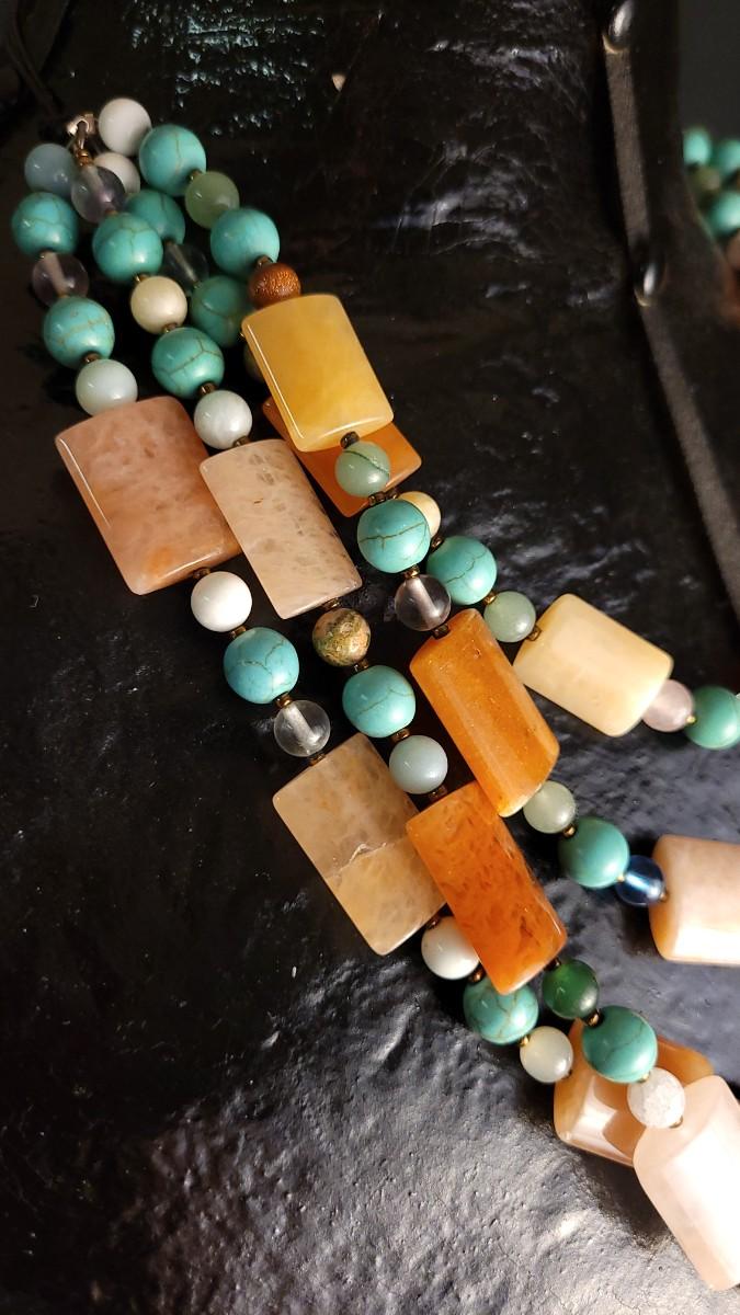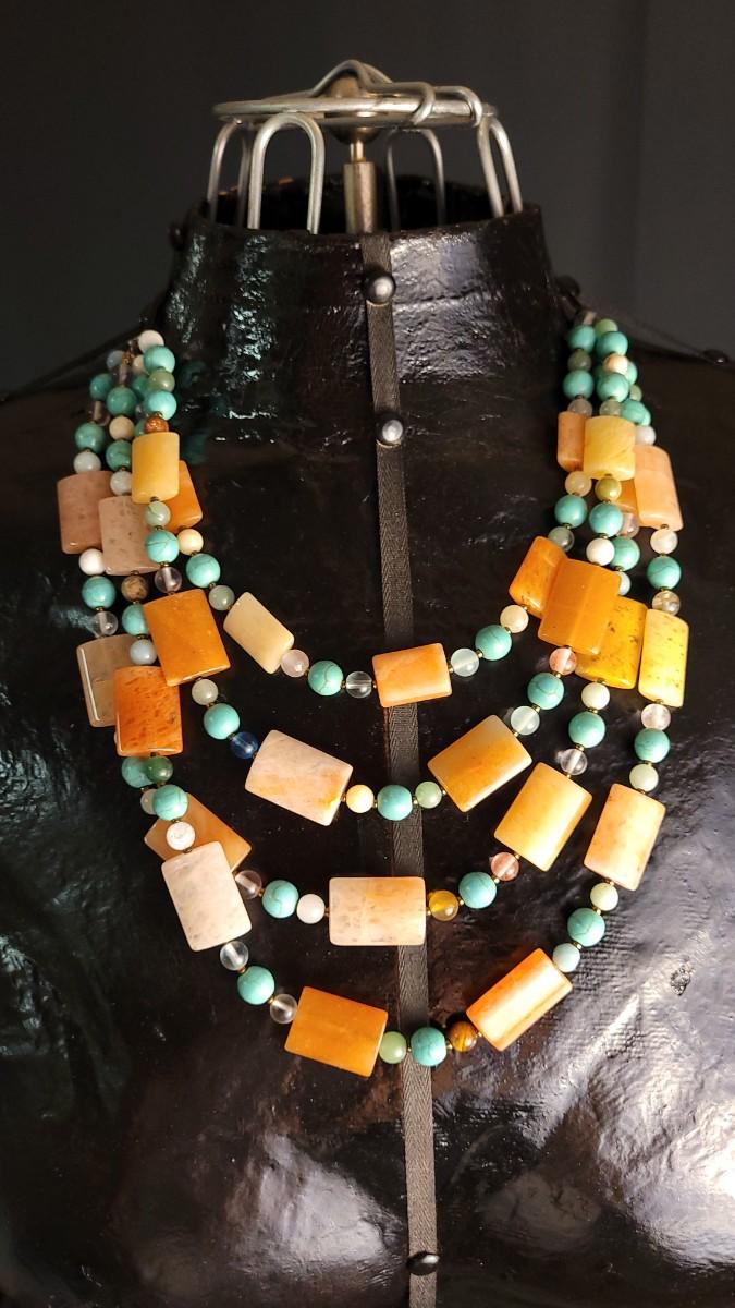 This lot features a Vintage Handmade Quadruple Strand Necklace with an assortment of beads and polished rectangular stones with many visible inclusions. 6mm - 15mm wide down the strands in respect to beads/stones. 8.5", 9" , 10.5" and 11" are the approximate drop lengths. Very colorful and stylish. Clasp is marked .925 (for Sterling Silver).