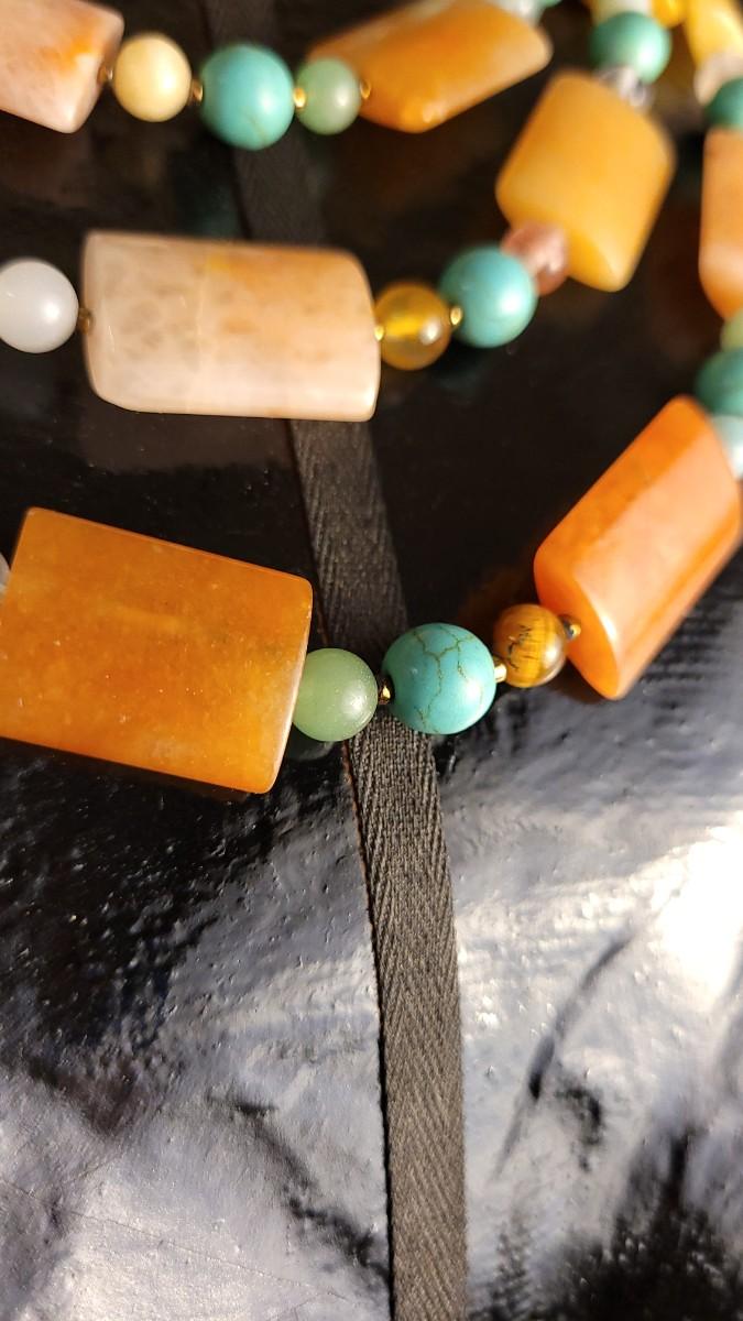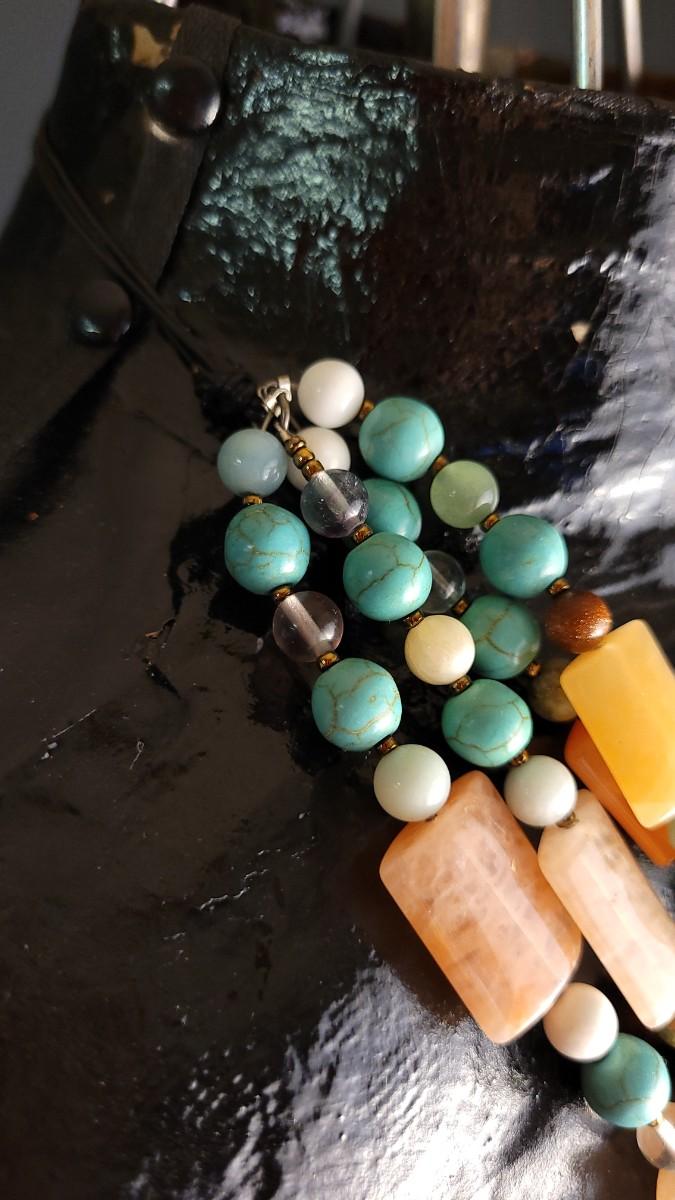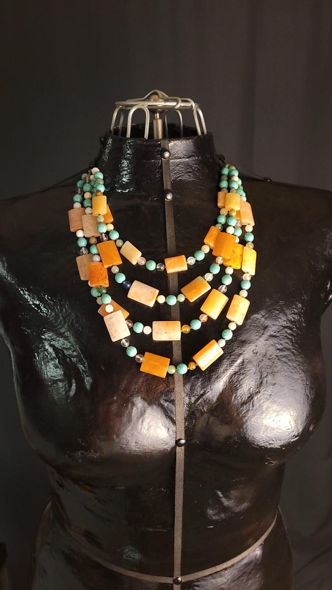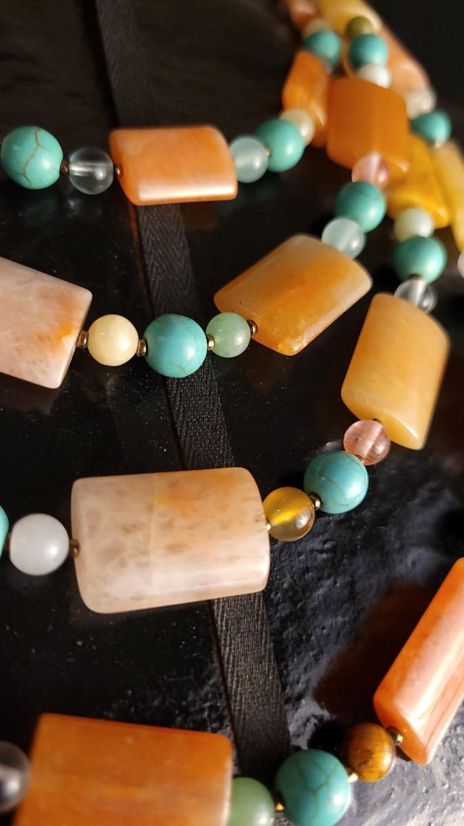 This lot features a Vintage Handmade Quadruple Strand Necklace with an assortment of beads and polished rectangular stones with many visible inclusions. 6mm - 15mm wide down the strands in respect to beads/stones. 8.5", 9" , 10.5" and 11" are the approximate drop lengths. Very colorful and stylish. Clasp is marked .925 (for Sterling Silver).