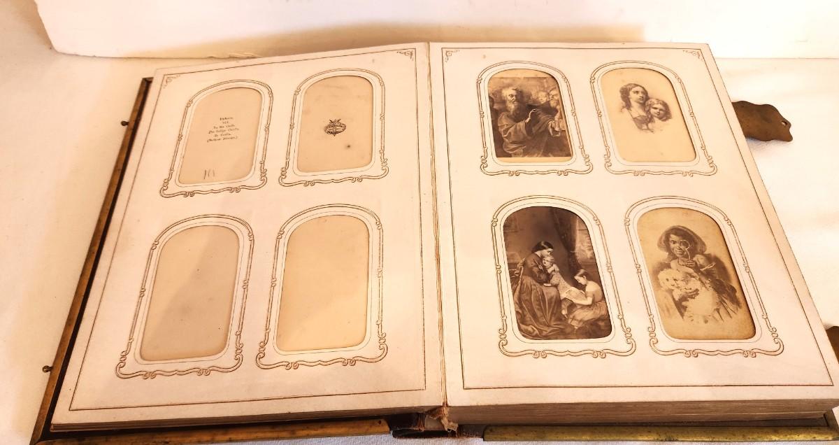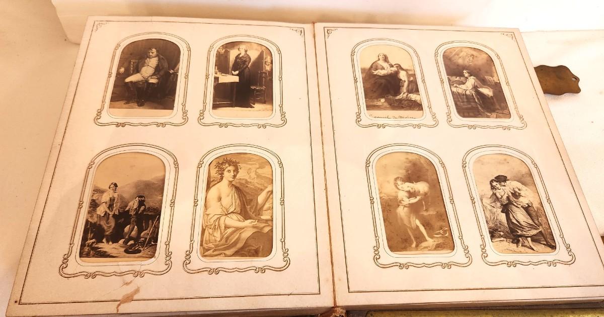 This album is in good shape and contains many cdvs and photos of the time - I noticed one tintype. Most are portraits - some are purchased pictures of famous people of the age or scenes from antiquity.