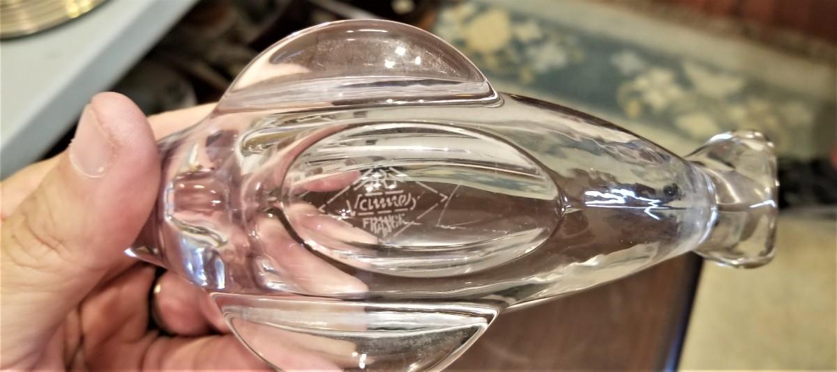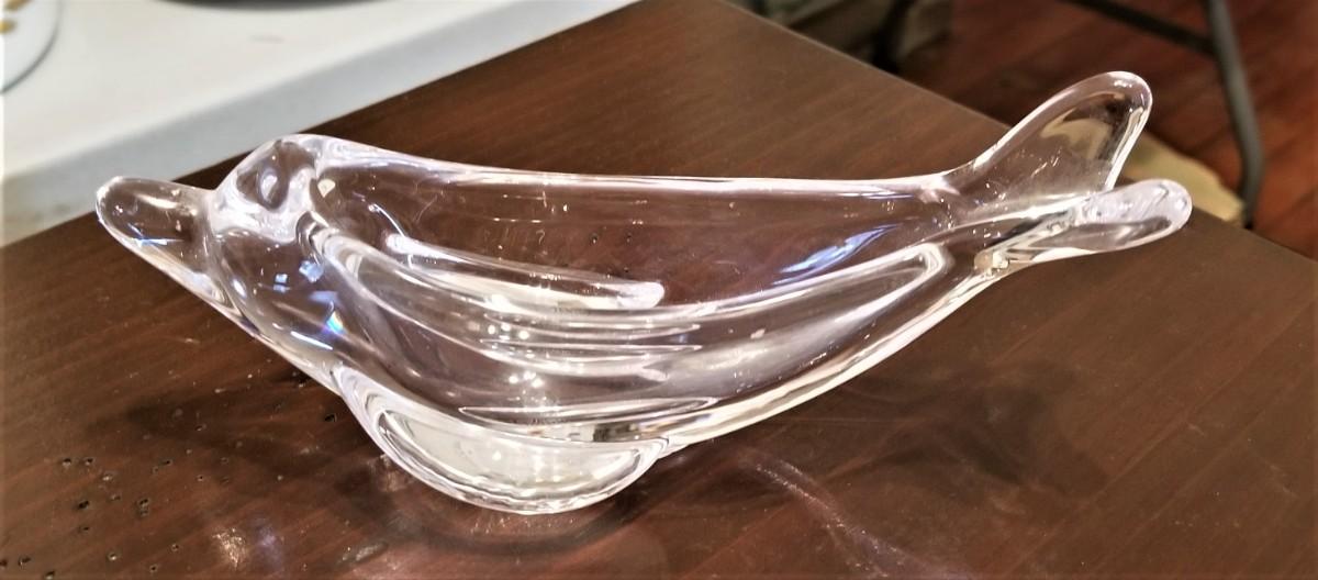 Figural dolphin done by a French crystal maker - Art Vannes - signed on bottom Usual light scratches on bottom. 6.5" long.