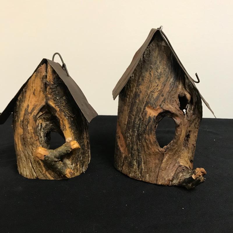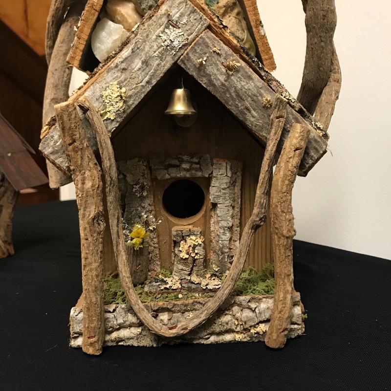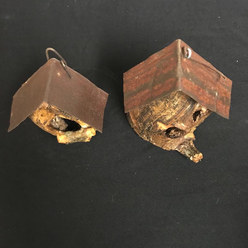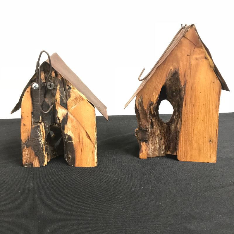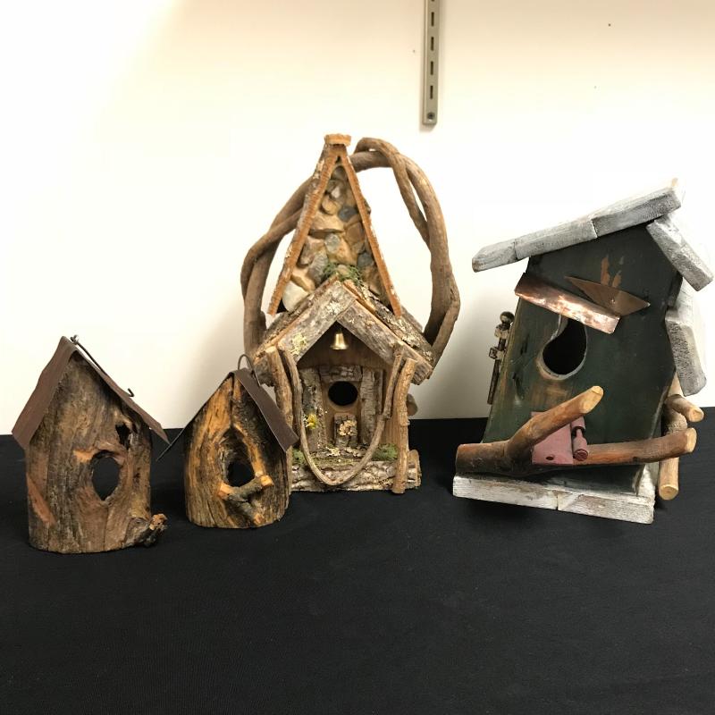 Four eclectic bird houses. One pair of metal-roofed hanging houses, a possibly upcycled fun leaning house with metal hardware and the largest chapel like house measures approx. 8”x8”x13.25” and is complete with dried flowers and a working bell. Local pick up only in Arden, NC.
