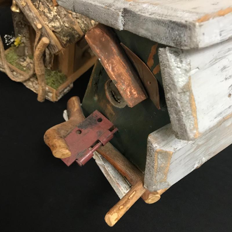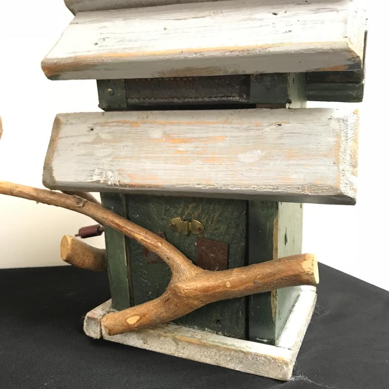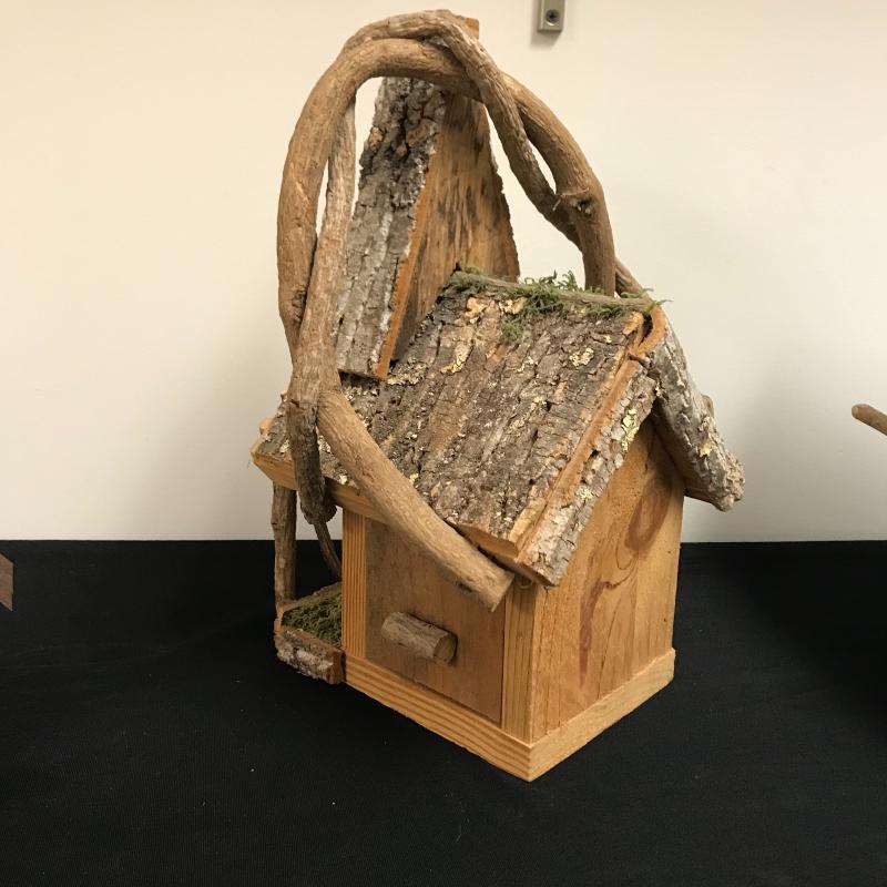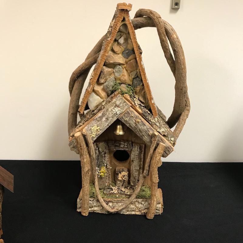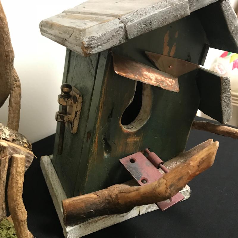 Four eclectic bird houses. One pair of metal-roofed hanging houses, a possibly upcycled fun leaning house with metal hardware and the largest chapel like house measures approx. 8”x8”x13.25” and is complete with dried flowers and a working bell. Local pick up only in Arden, NC.
