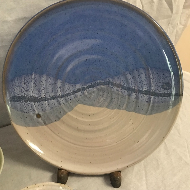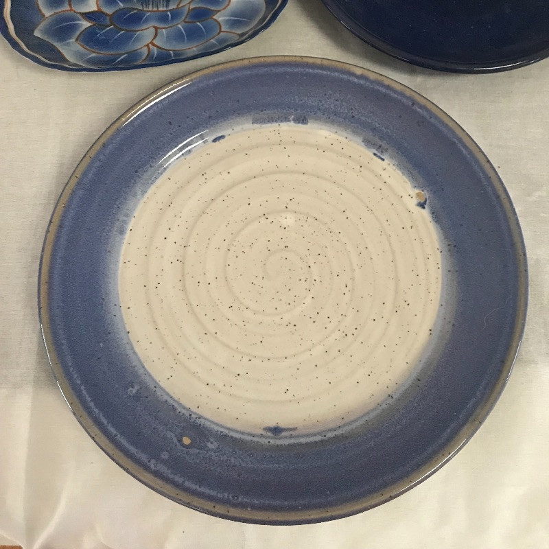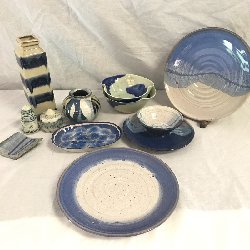 These pieces have a blue and white theme with most being pottery but a few are not. Tall squared vase stands 10” tall and largest plate is 11.5” diameter. All are in perfect condition. Shipping available.