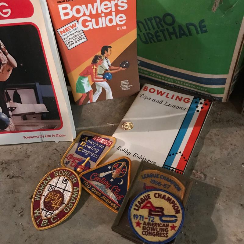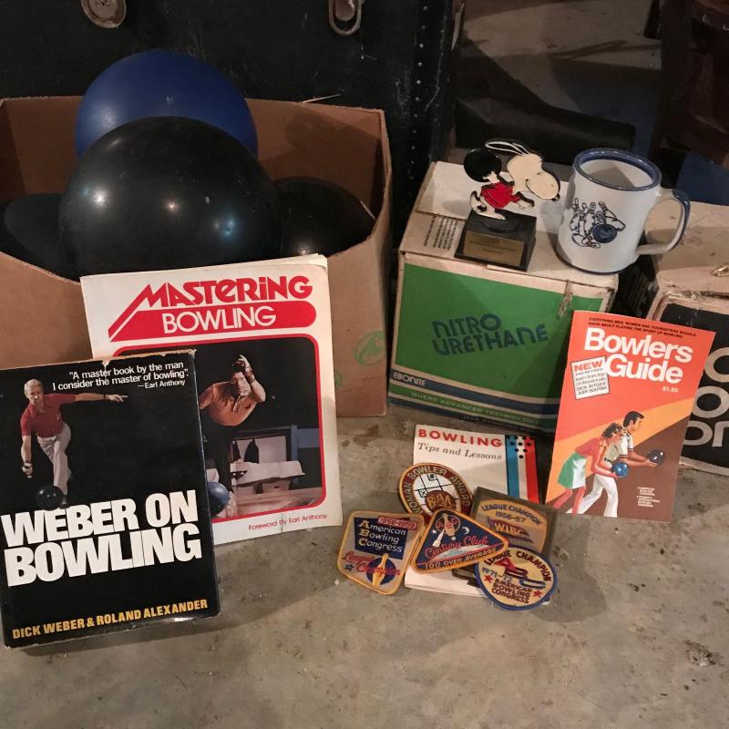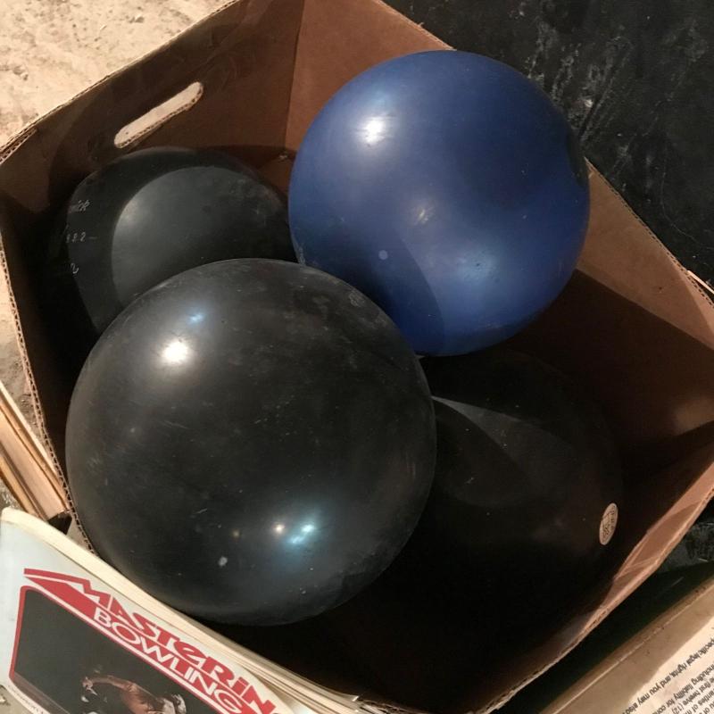 This lot includes 6 bowling balls. (two Ebonite in boxes). All do not have finger holes. Also includes trophies and patches from tournaments and a couple of books. Bowl your heart out! No shipping. Local pick up only.