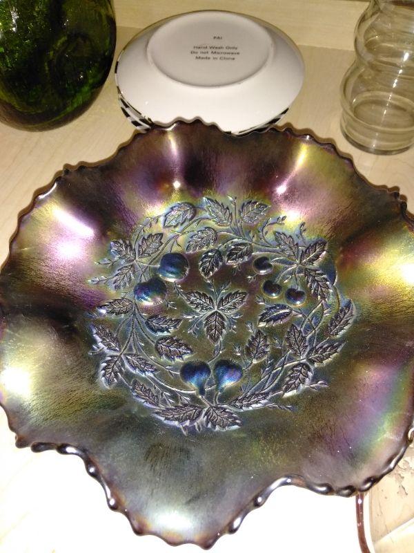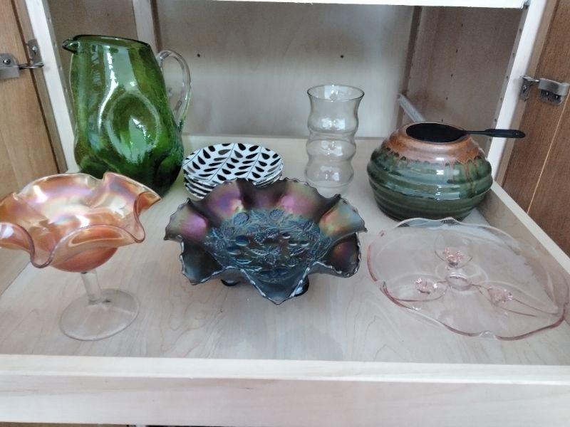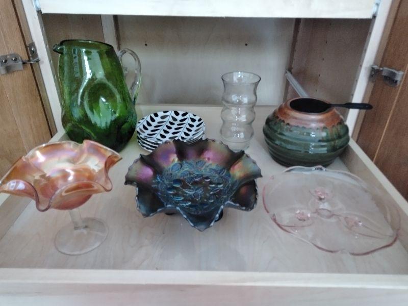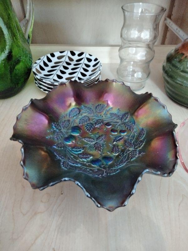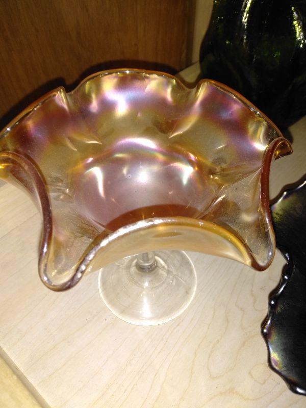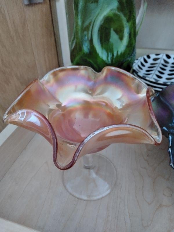 ORANGE RUFFLE CARNIVAL GLASS STEMMED DISH, PURPLE CARNIVAL GLASS WITH GRAPE DESIGN, PINK HUE CAKE PLATTER WITH ETCHING, GREEN POTTERY LANTERN, SMALL VASE, SMALL DECORATIVE PLATES, GREEN CRACKLE GLASS PITCHER.