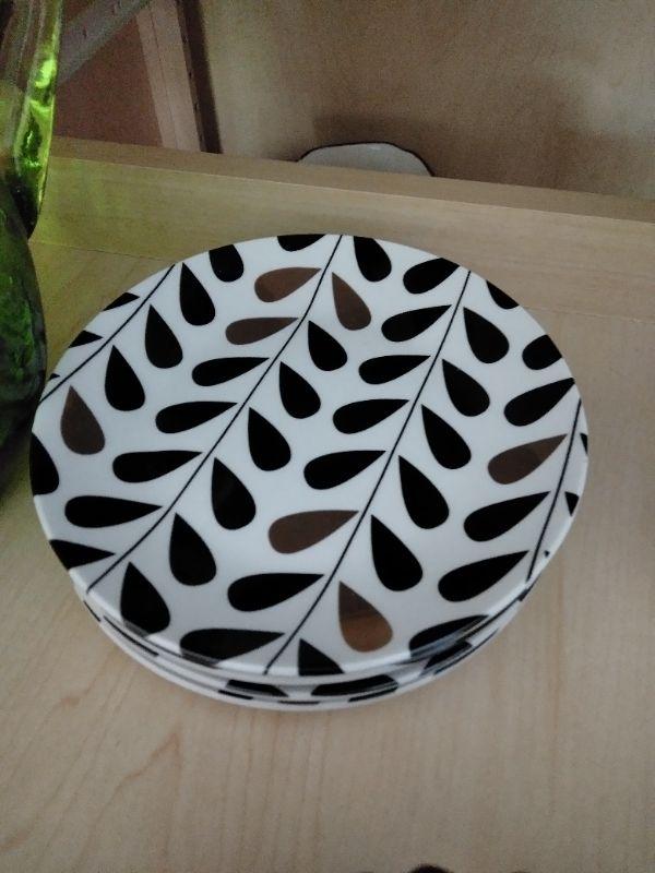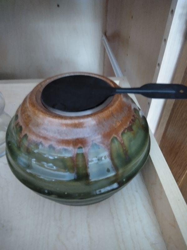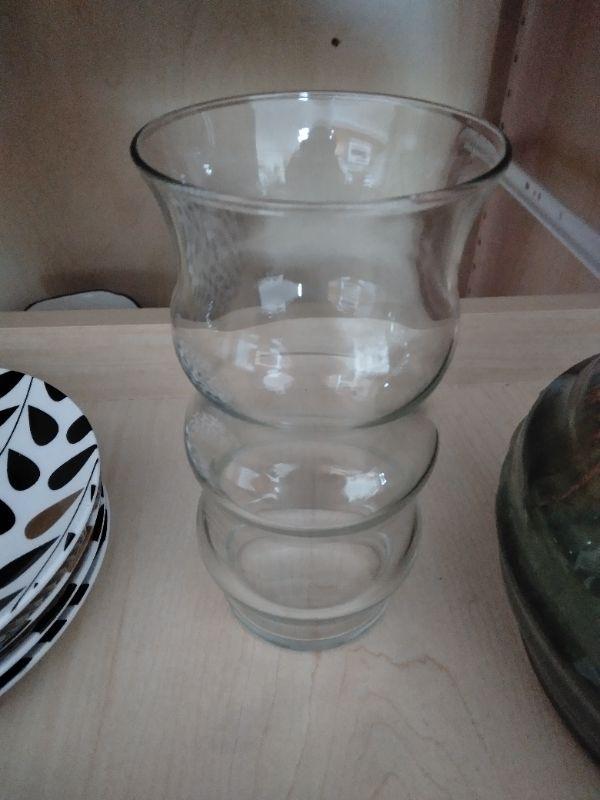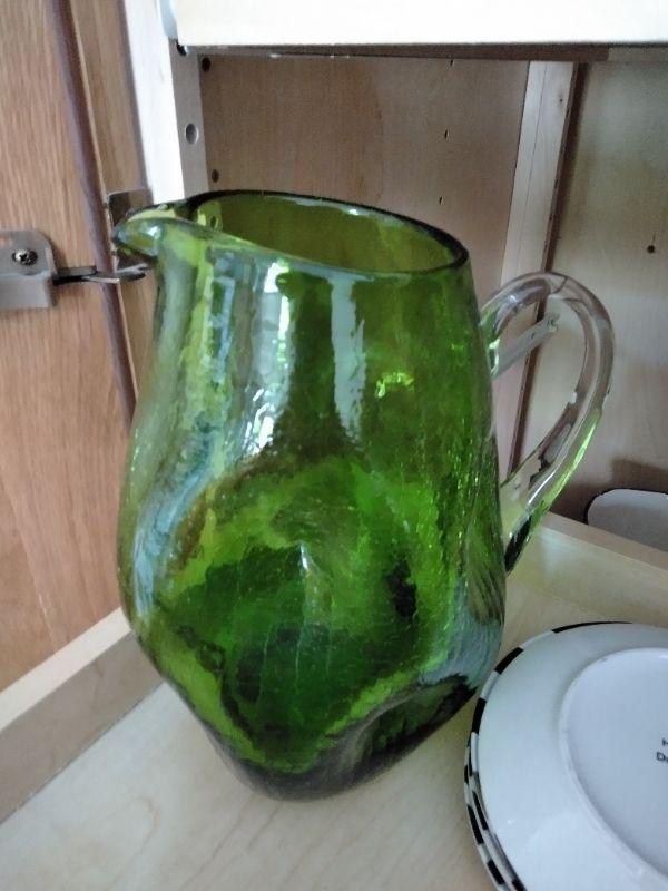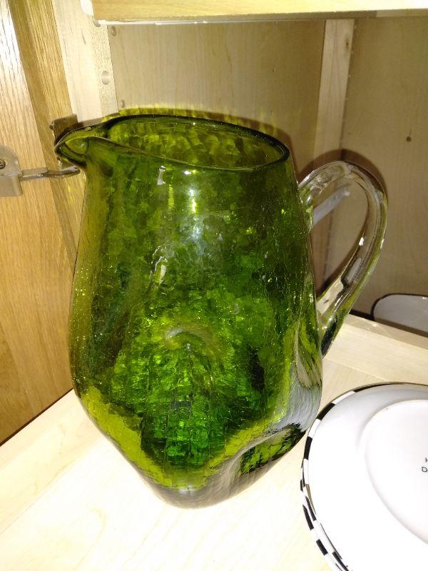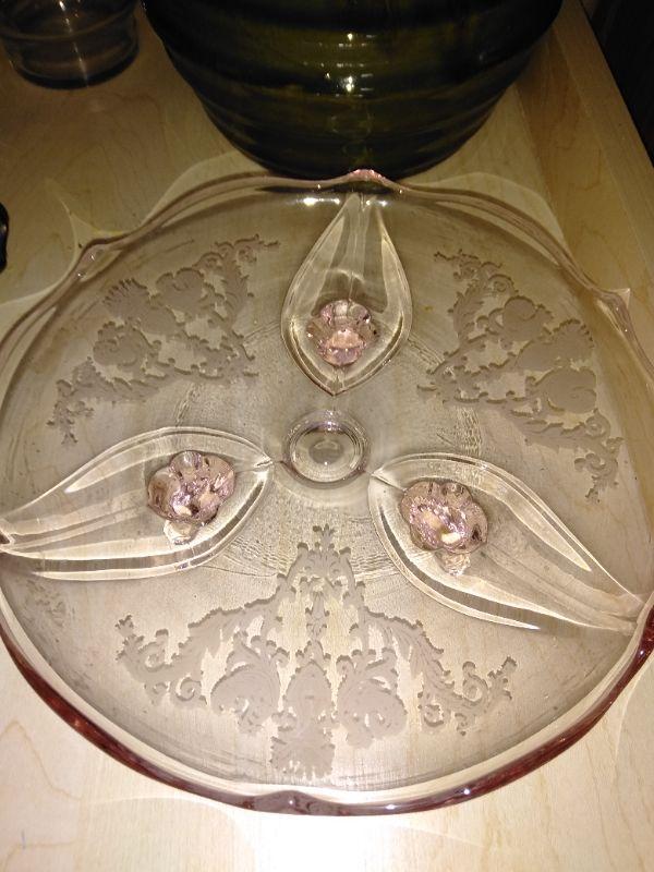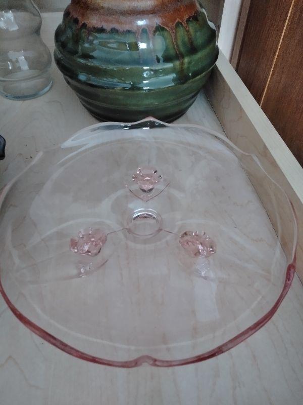 ORANGE RUFFLE CARNIVAL GLASS STEMMED DISH, PURPLE CARNIVAL GLASS WITH GRAPE DESIGN, PINK HUE CAKE PLATTER WITH ETCHING, GREEN POTTERY LANTERN, SMALL VASE, SMALL DECORATIVE PLATES, GREEN CRACKLE GLASS PITCHER.