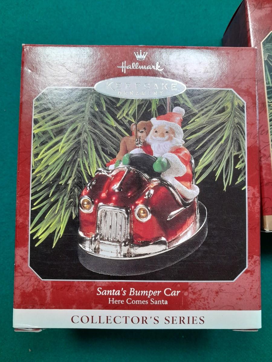 LOT 252 HALLMARK CHRISTMAS ORNAMENTS KRINGLES WHIRLGIG, SANTA BUMPER CAR