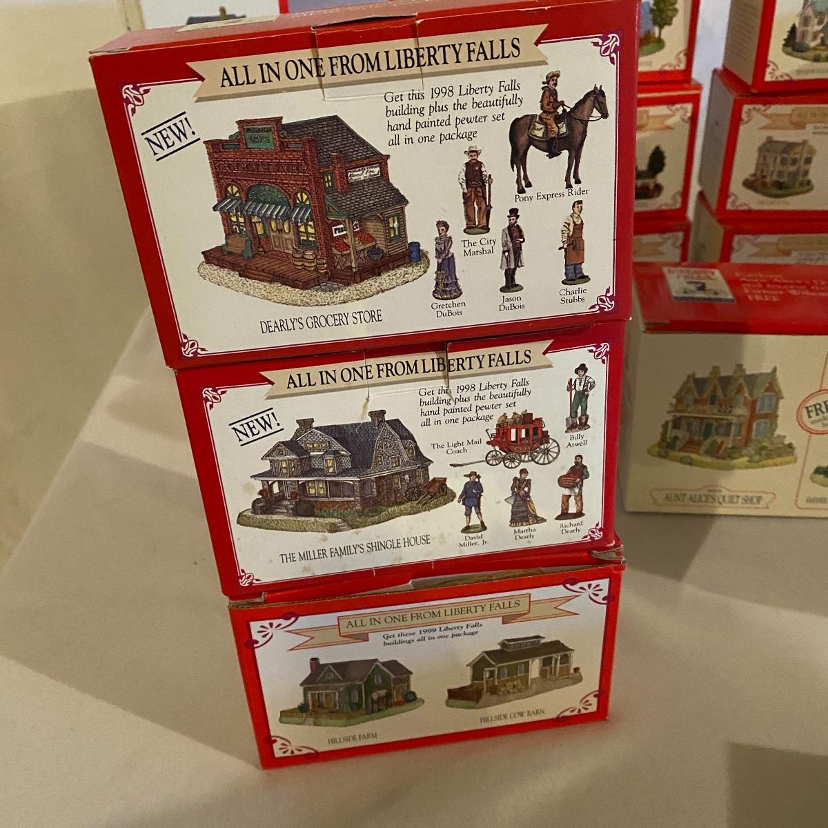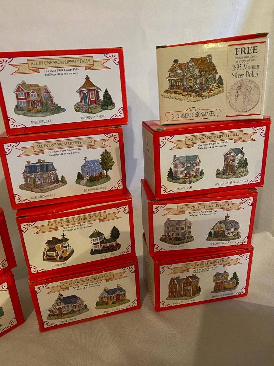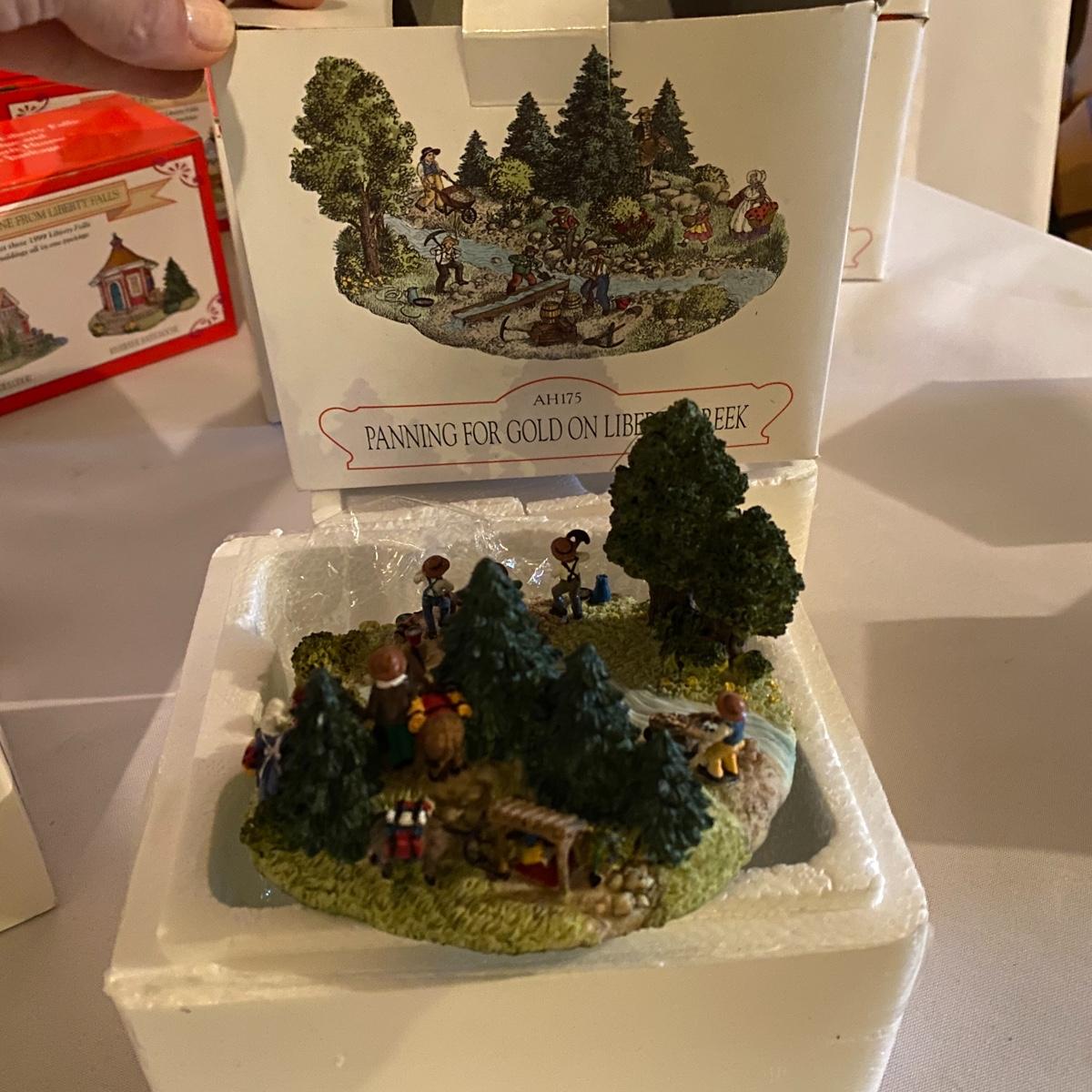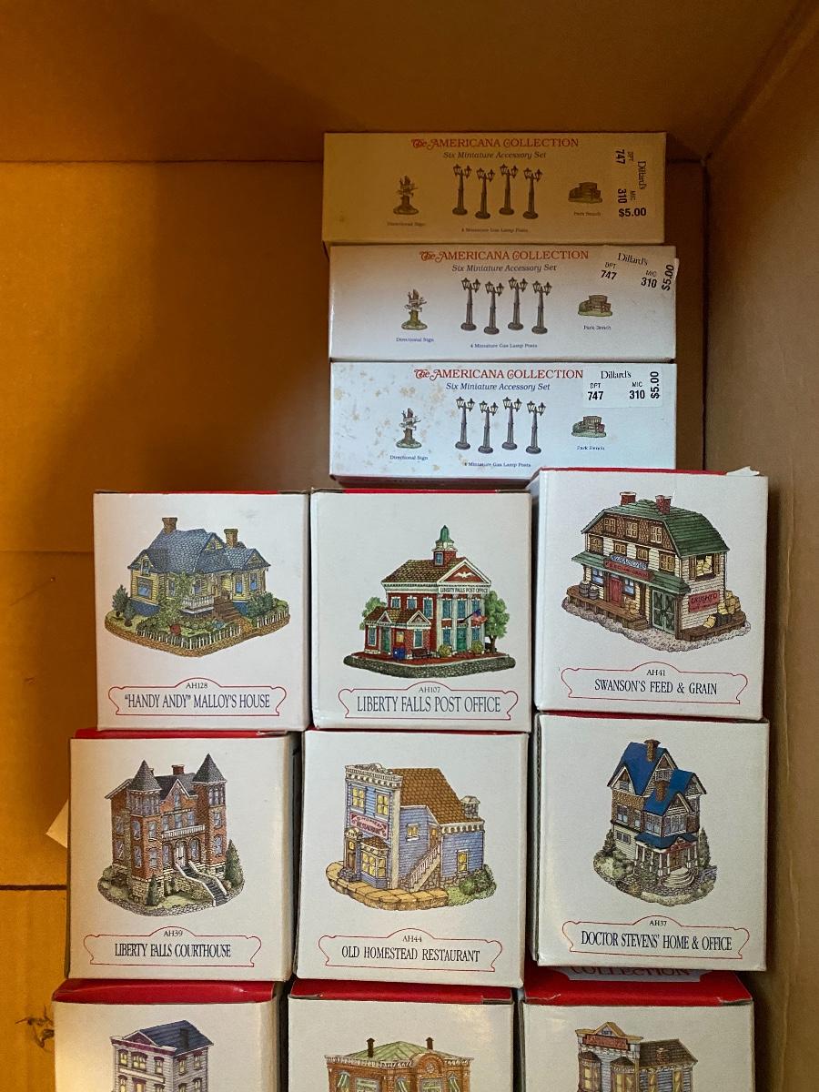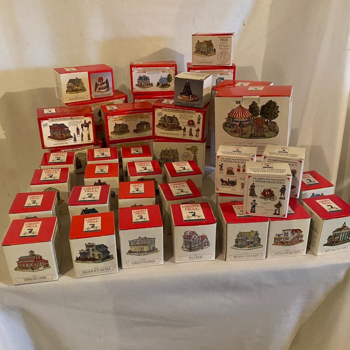 Collectible miniatures from Liberty Falls “All In One Collection “ with hand painted pewter figurines and the Americana Collection. There is also a Music Box!. The Liberty Falls collectible appear to be made of resin. Most come with original boxes. Too many to count! The Silver dollar in one box is a replica and not actual silver. While it appears that all the houses and boxes match we can not guarantee that all pieces are included. Shipping available