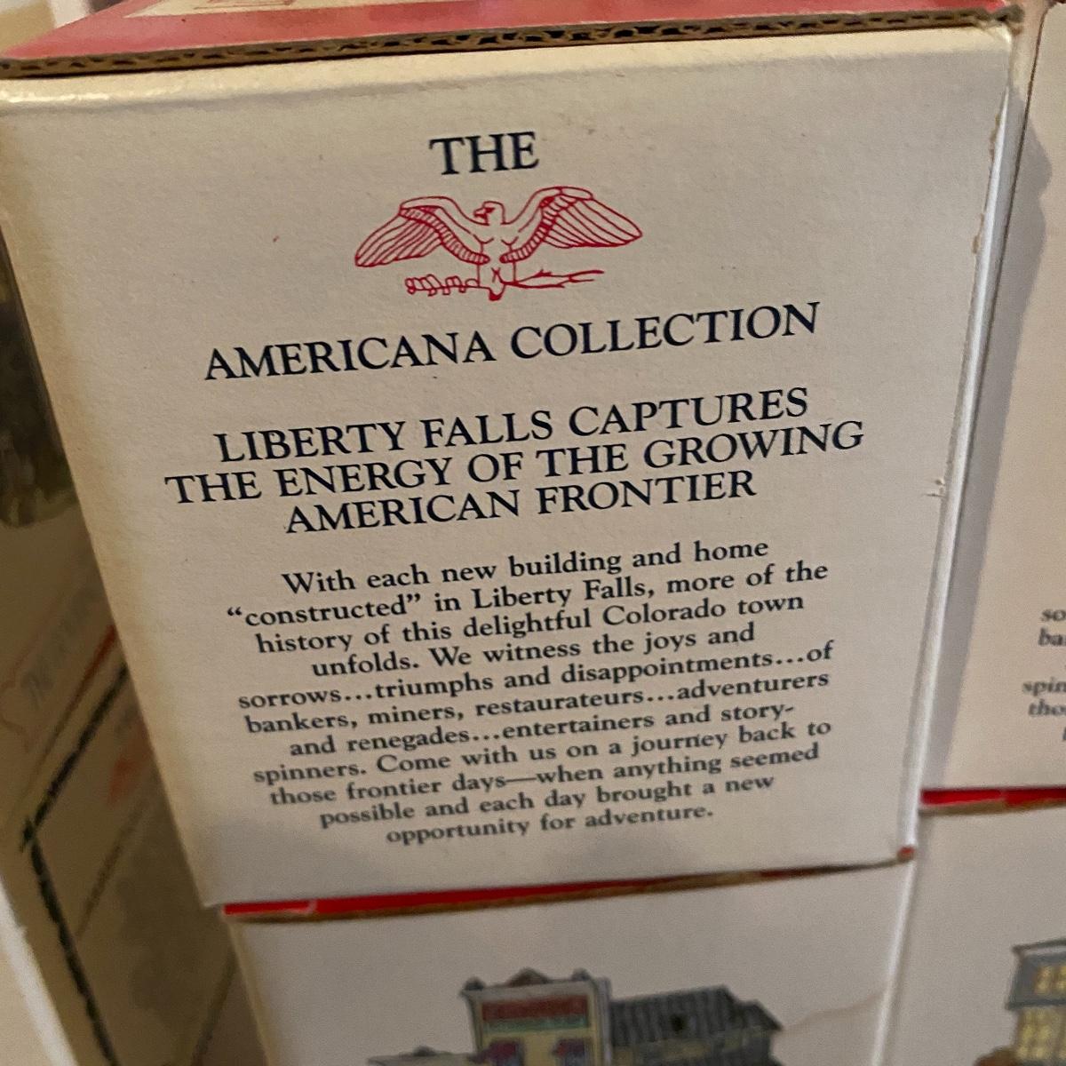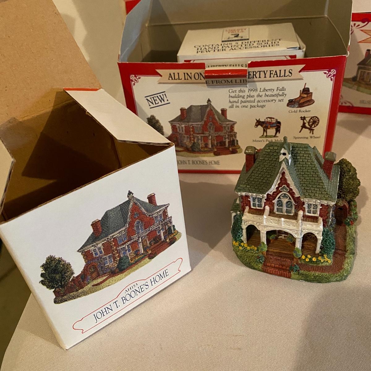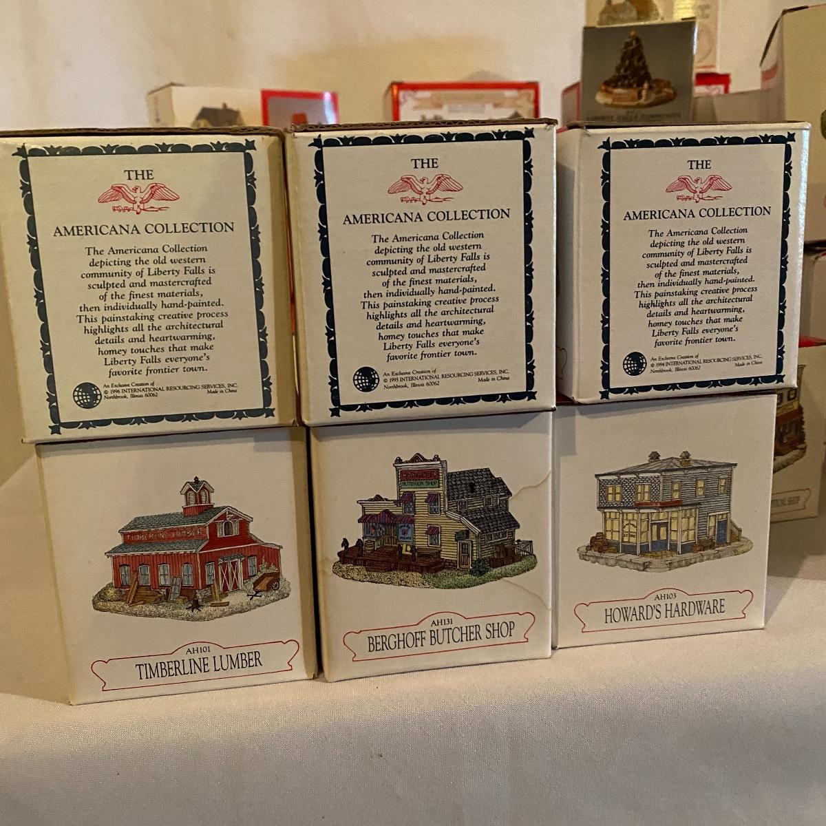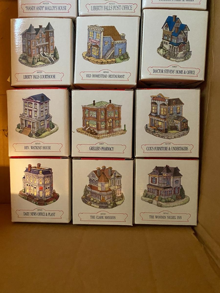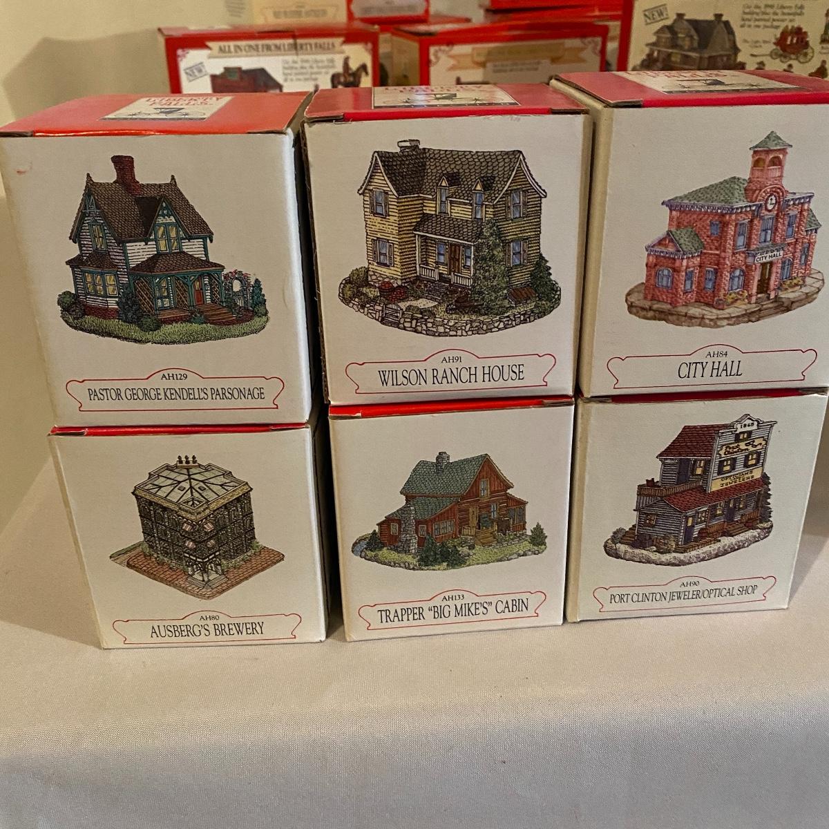 Collectible miniatures from Liberty Falls “All In One Collection “ with hand painted pewter figurines and the Americana Collection. There is also a Music Box!. The Liberty Falls collectible appear to be made of resin. Most come with original boxes. Too many to count! The Silver dollar in one box is a replica and not actual silver. While it appears that all the houses and boxes match we can not guarantee that all pieces are included. Shipping available