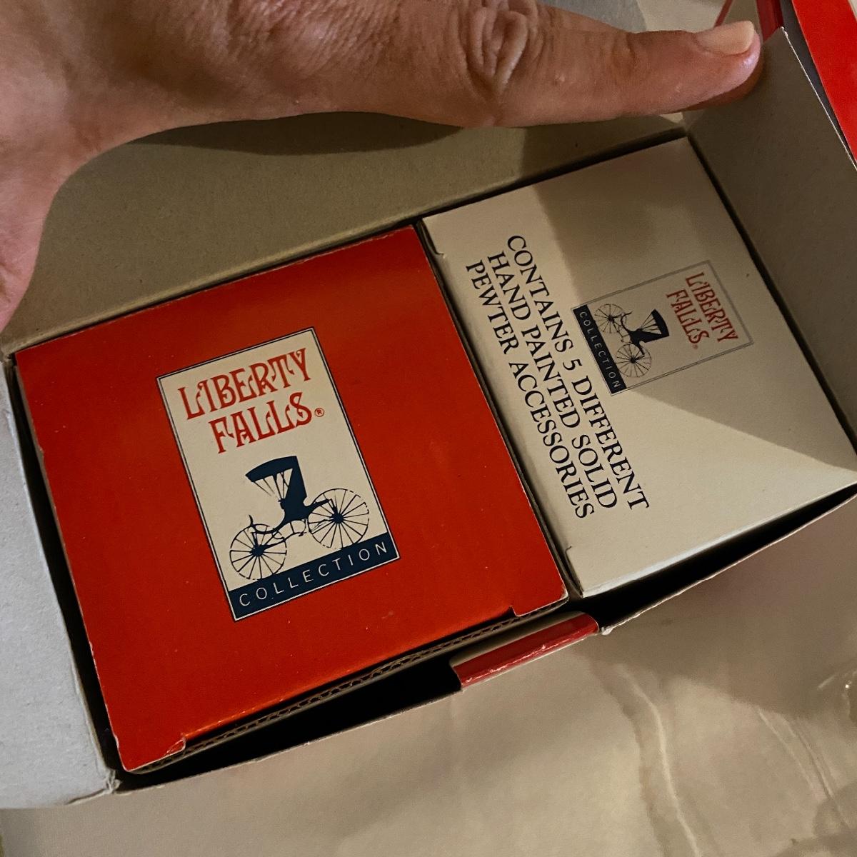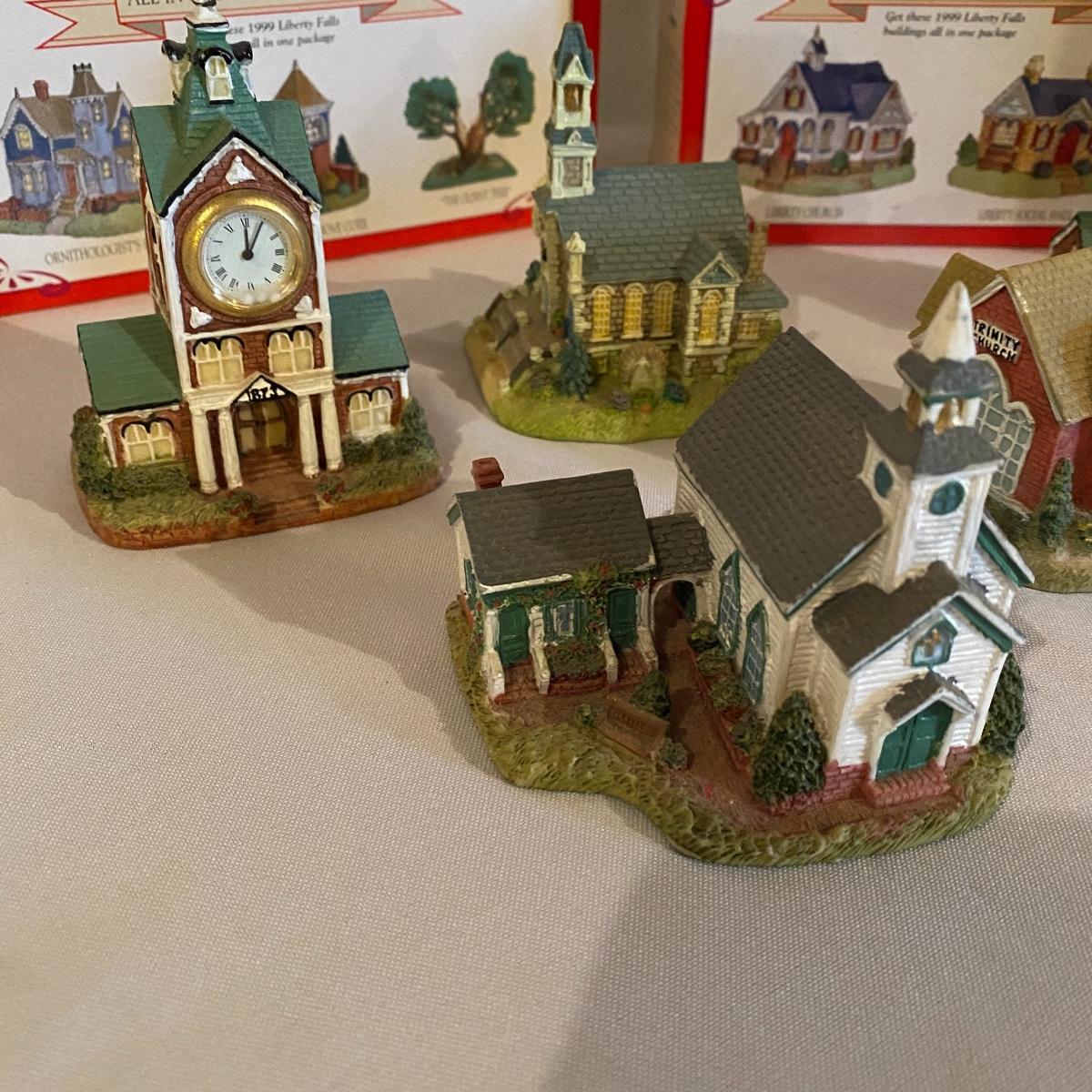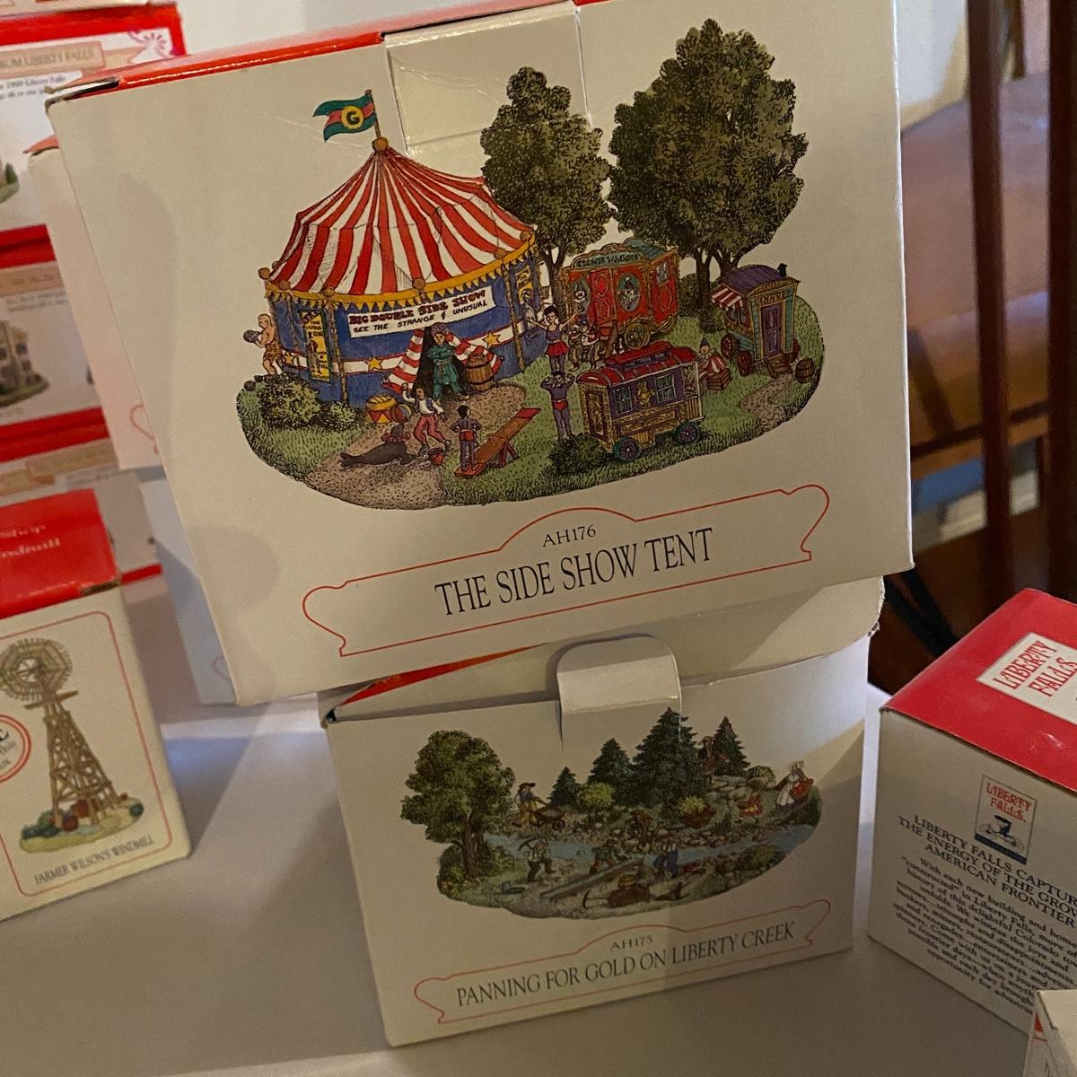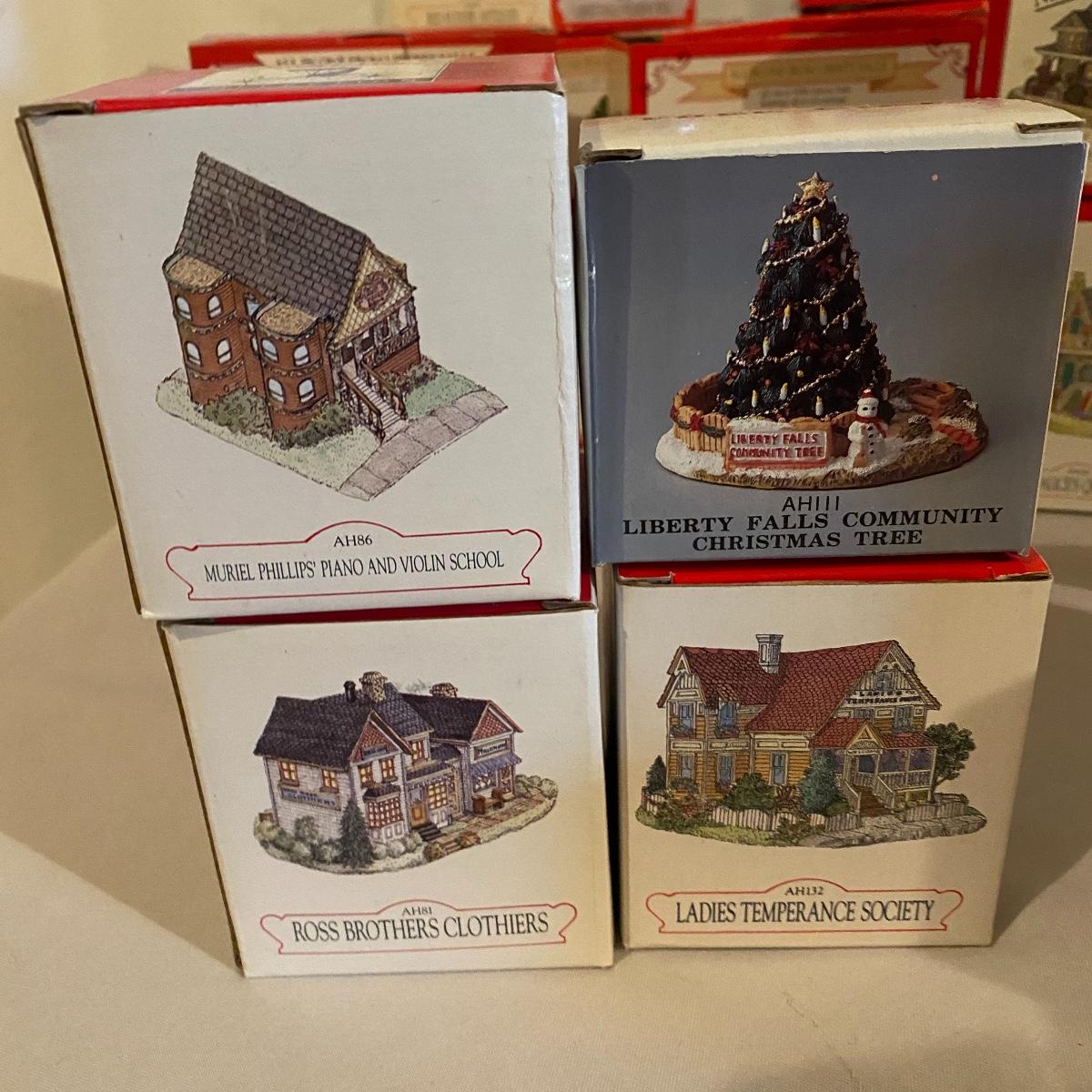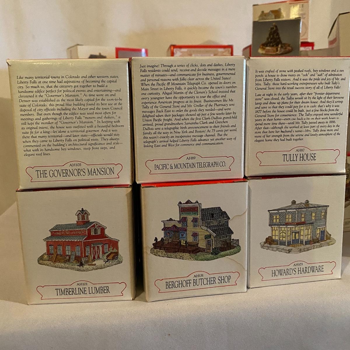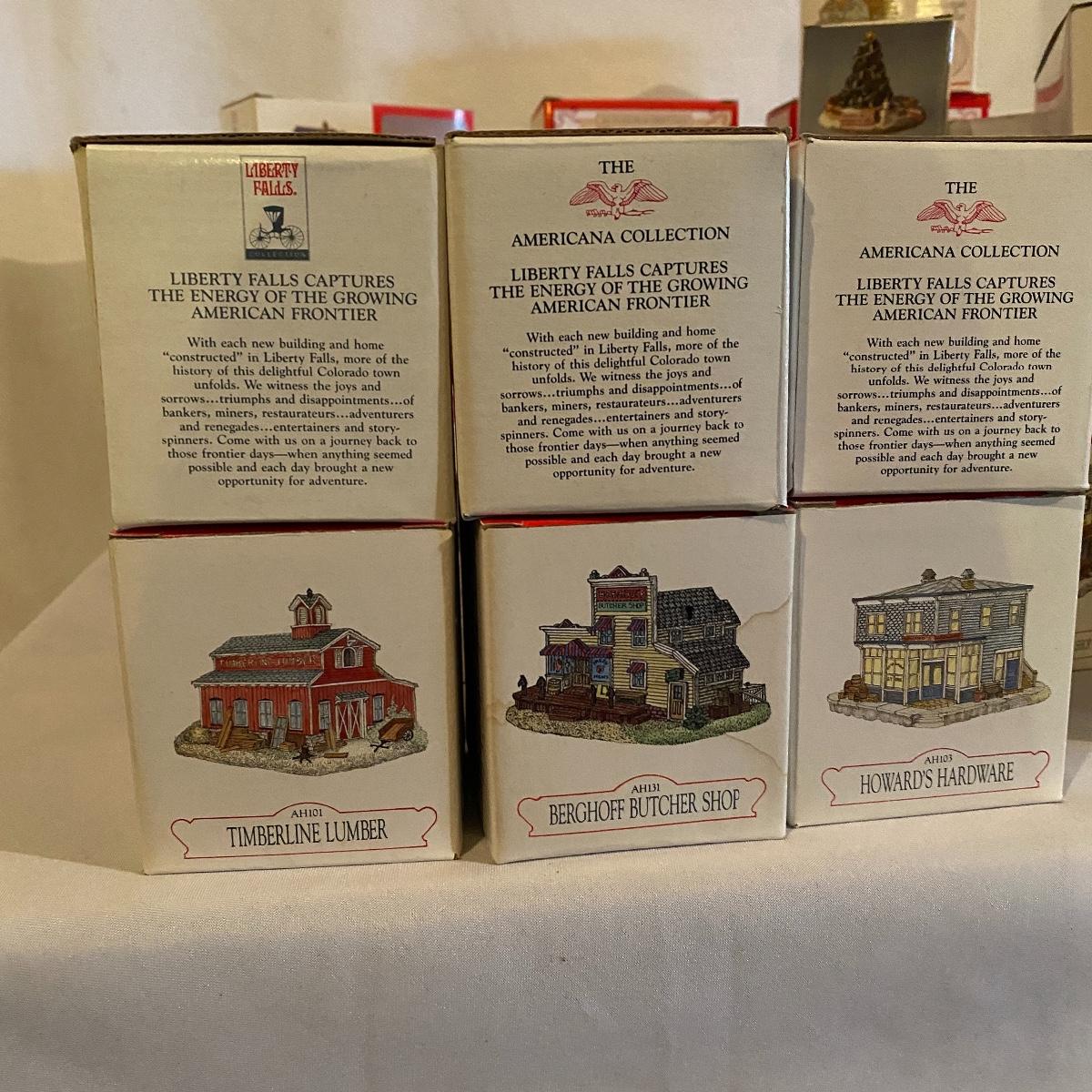 Collectible miniatures from Liberty Falls “All In One Collection “ with hand painted pewter figurines and the Americana Collection. There is also a Music Box!. The Liberty Falls collectible appear to be made of resin. Most come with original boxes. Too many to count! The Silver dollar in one box is a replica and not actual silver. While it appears that all the houses and boxes match we can not guarantee that all pieces are included. Shipping available