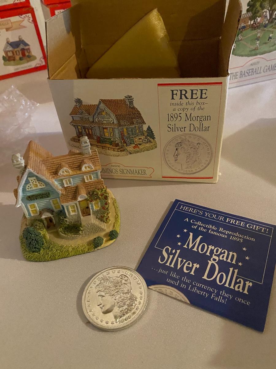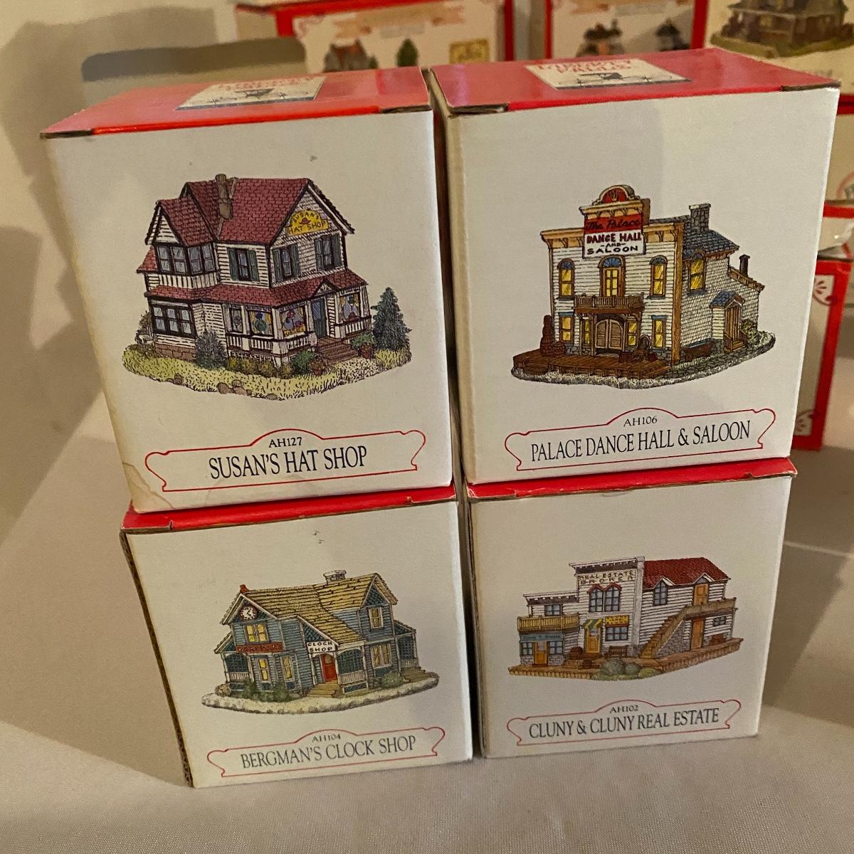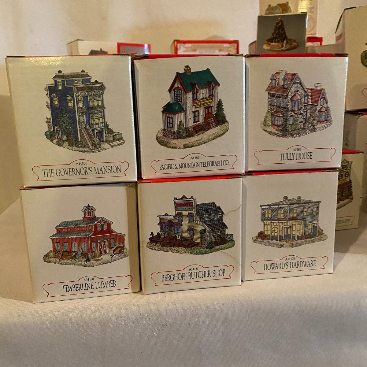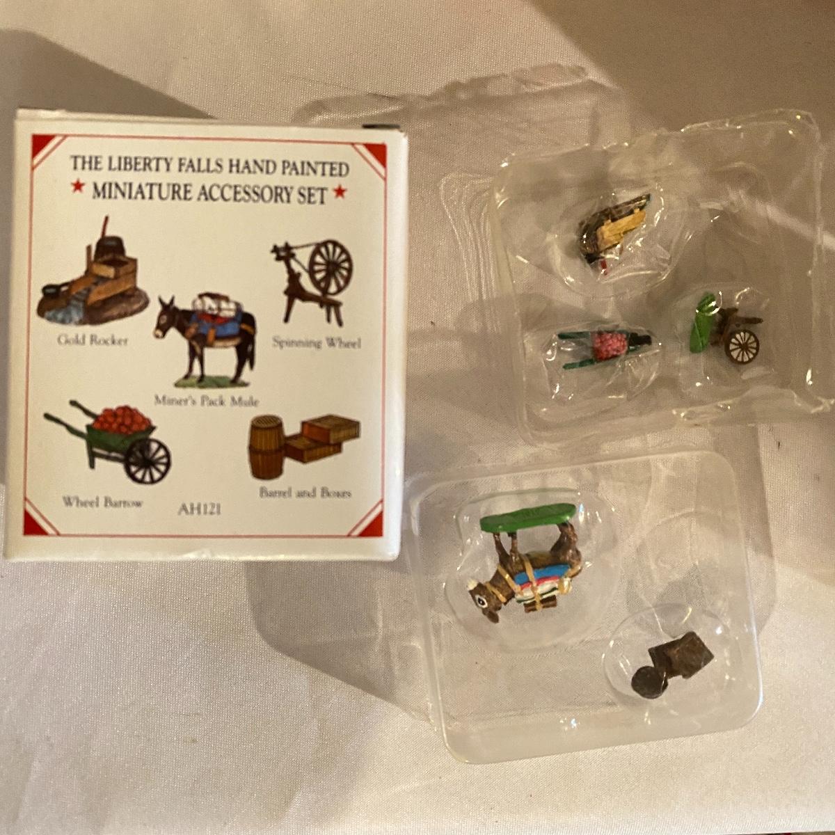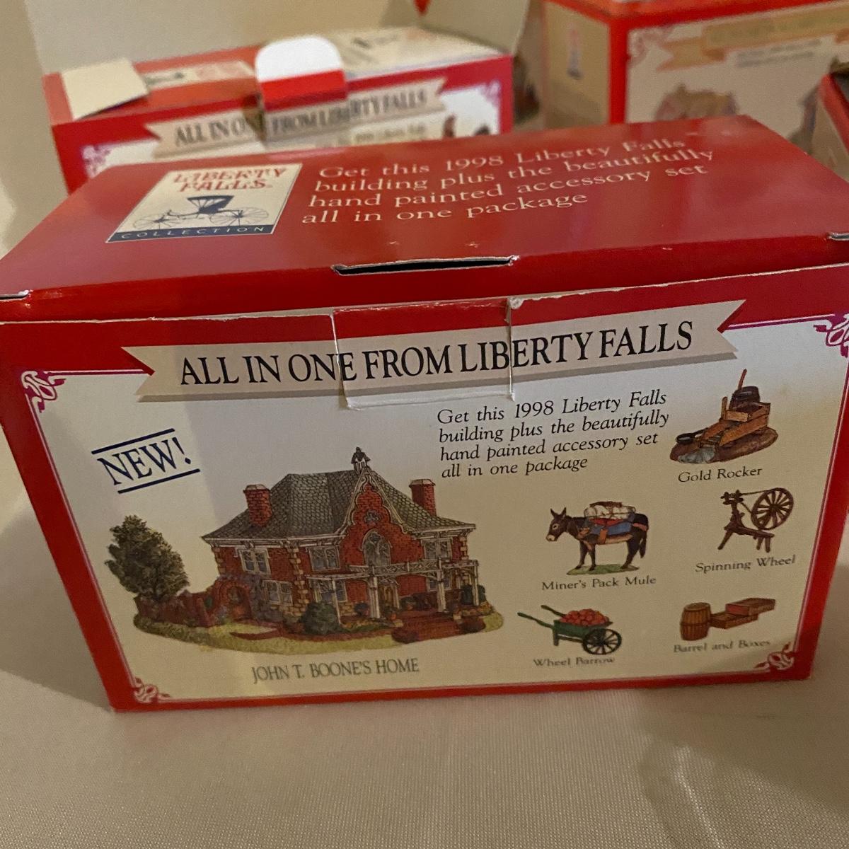 Collectible miniatures from Liberty Falls “All In One Collection “ with hand painted pewter figurines and the Americana Collection. There is also a Music Box!. The Liberty Falls collectible appear to be made of resin. Most come with original boxes. Too many to count! The Silver dollar in one box is a replica and not actual silver. While it appears that all the houses and boxes match we can not guarantee that all pieces are included. Shipping available
