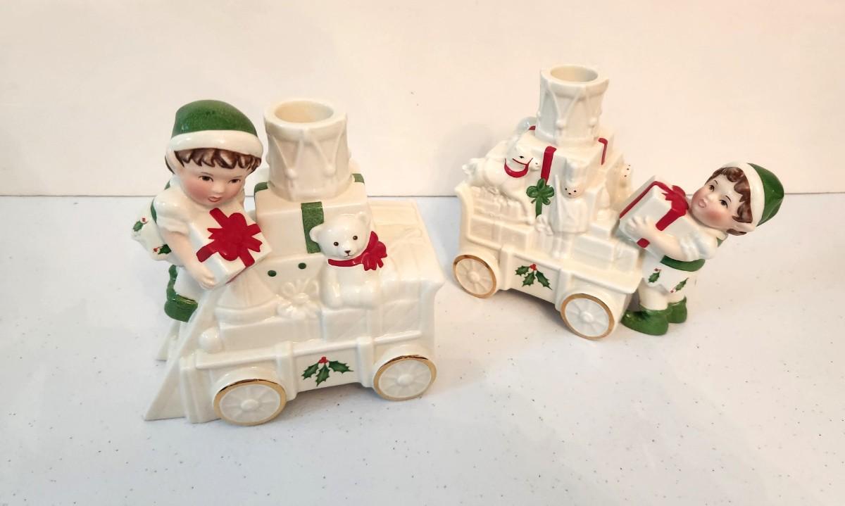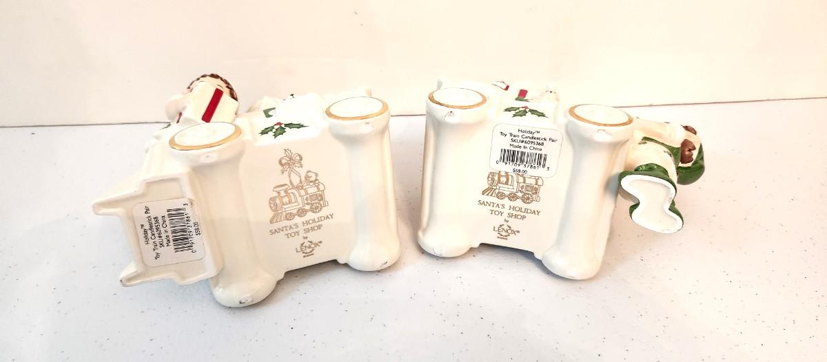 "Toy Train" -set 2 LENOX porcelain Christmas Candle sticks, original sticker priced these at $58.00 for the pair. Each 5 Inches long. Like new.