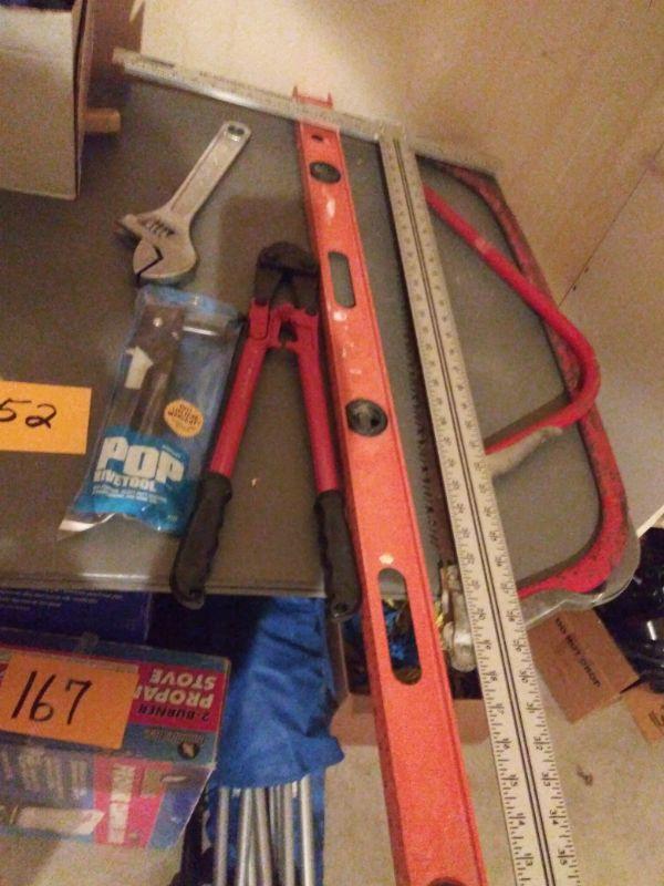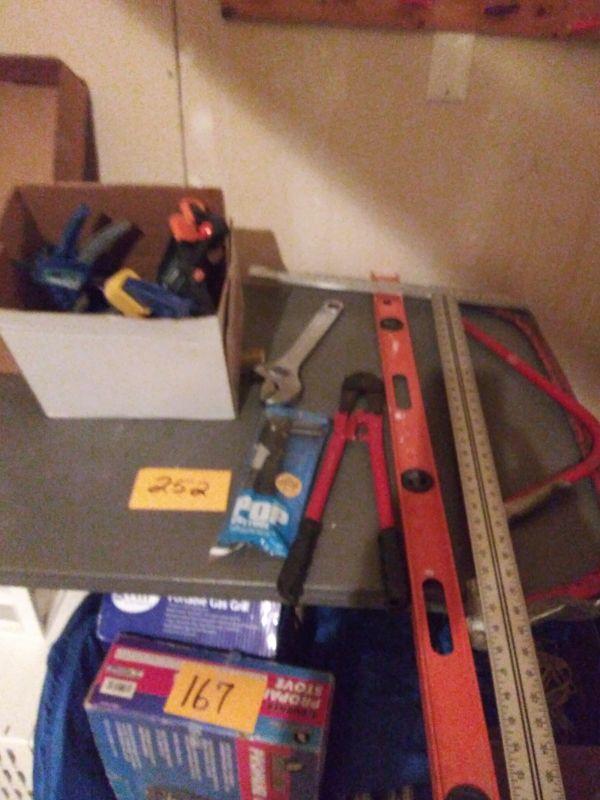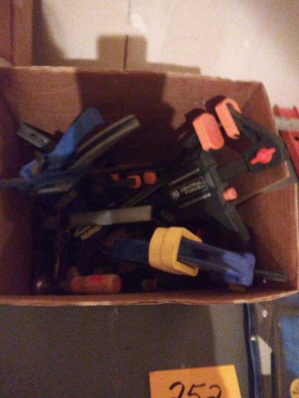 BOX OF CLAMPS AND LARGER/LONGER TOOLS