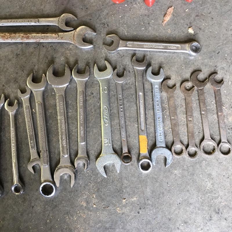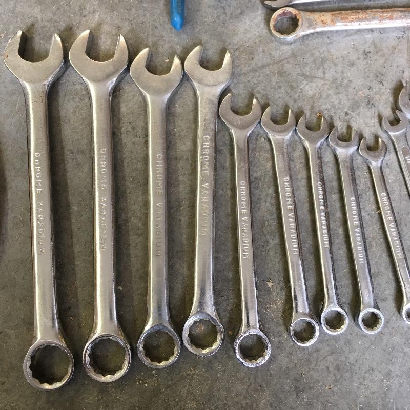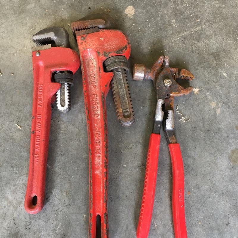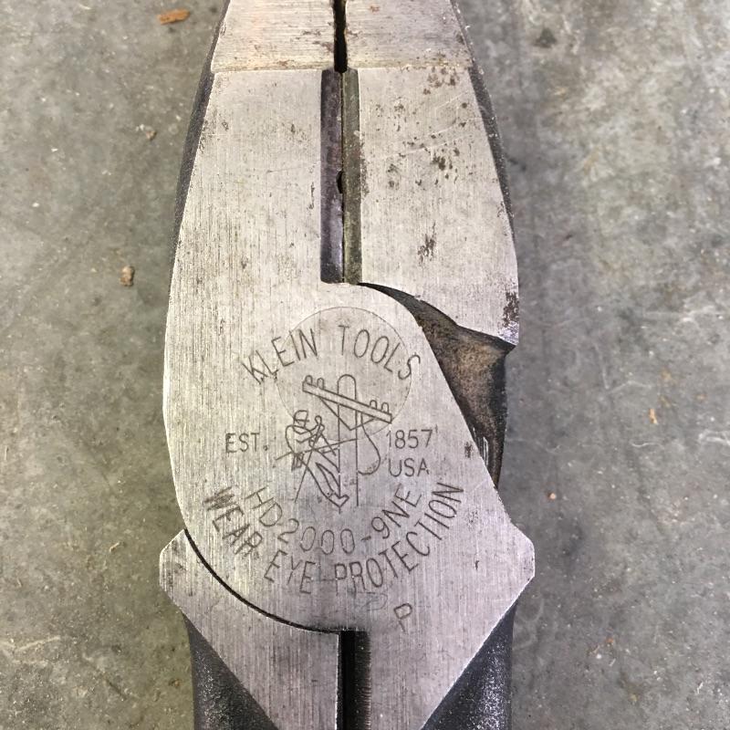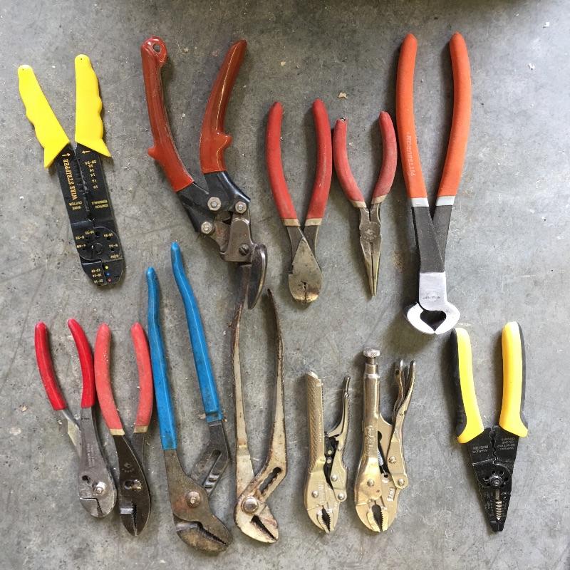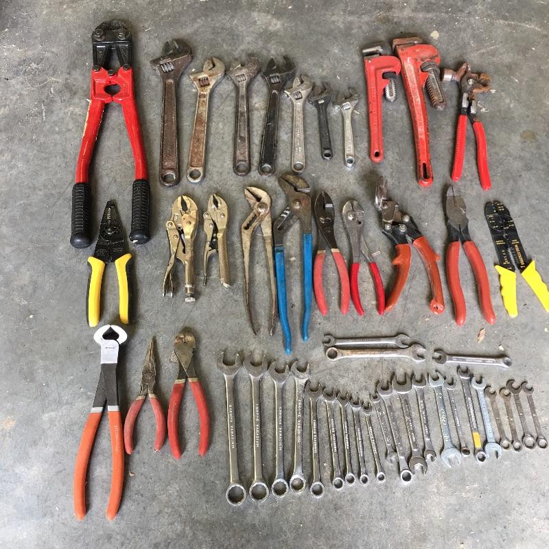 Large assortment of hand tools including Klein pliers, adjustable wrenches, bolt cutters, vise grips, pipe wrenches and assorted other hand tools.